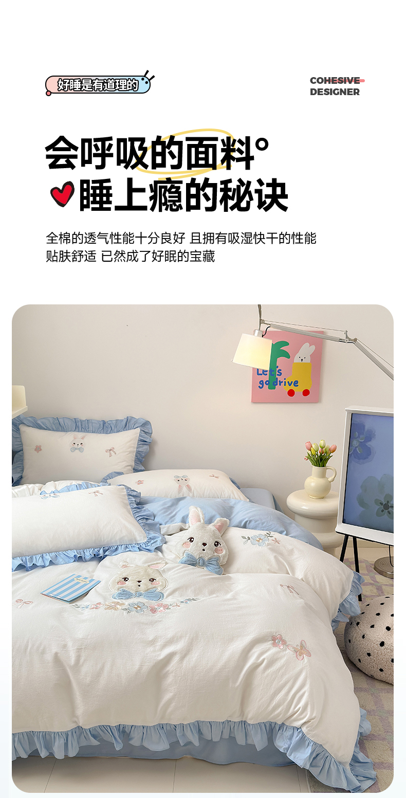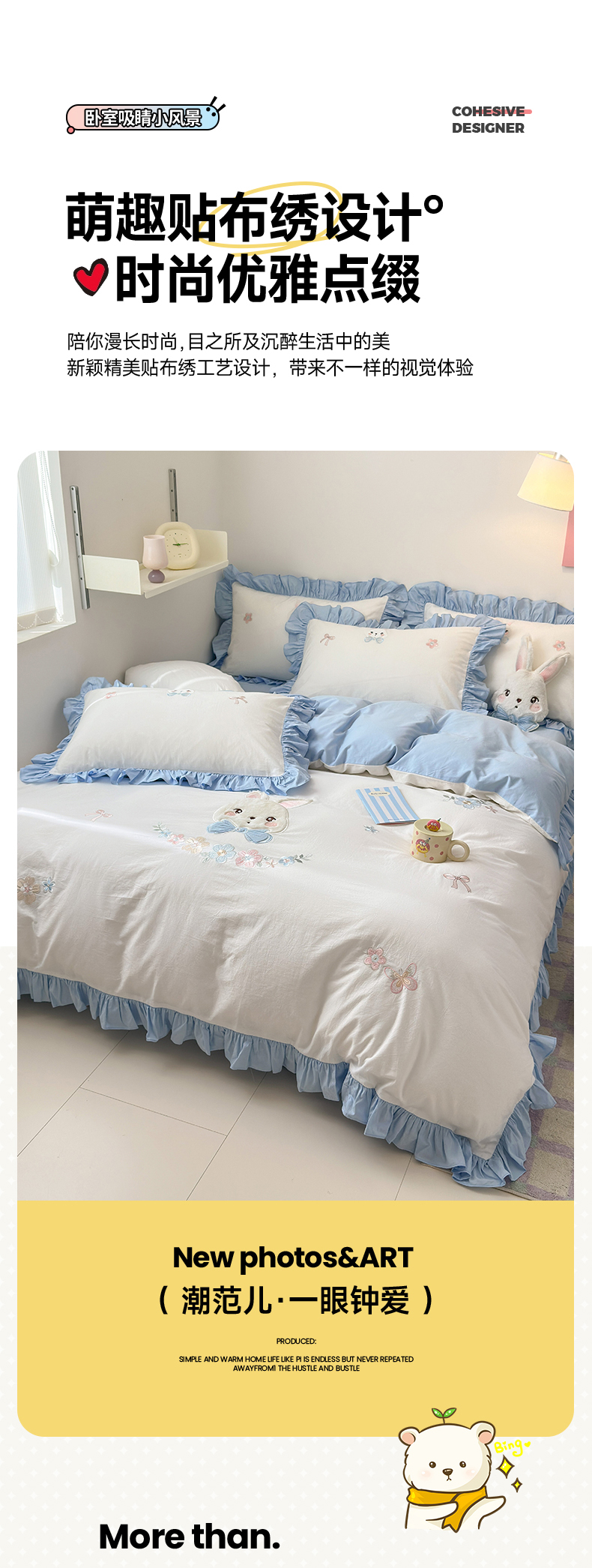 蜜柚 2024新款全棉加厚水洗棉韩版小清新绣花工艺四件套-萌萌兔 萌萌兔白