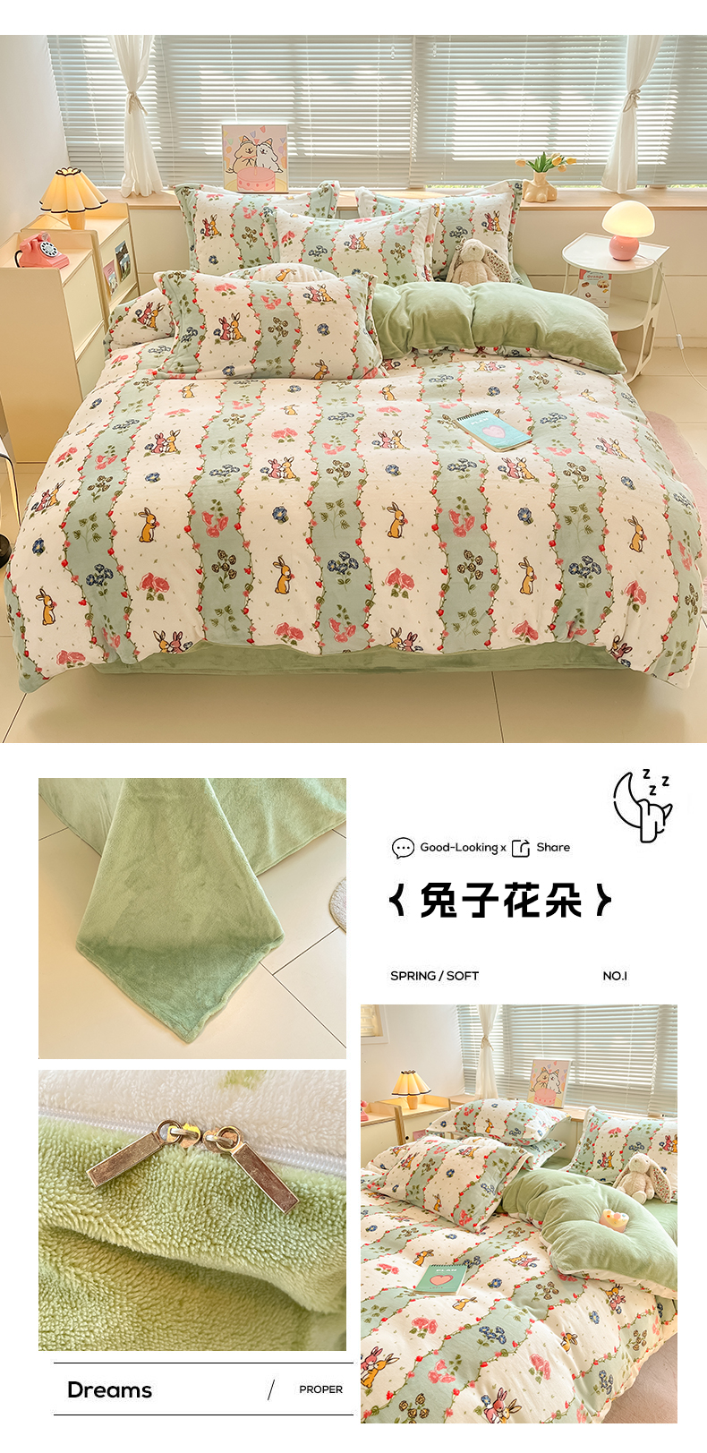 商品名称:2024新款A类AB版加厚保暖双面牛奶绒印花四件套--小清新系列 兔子花朵