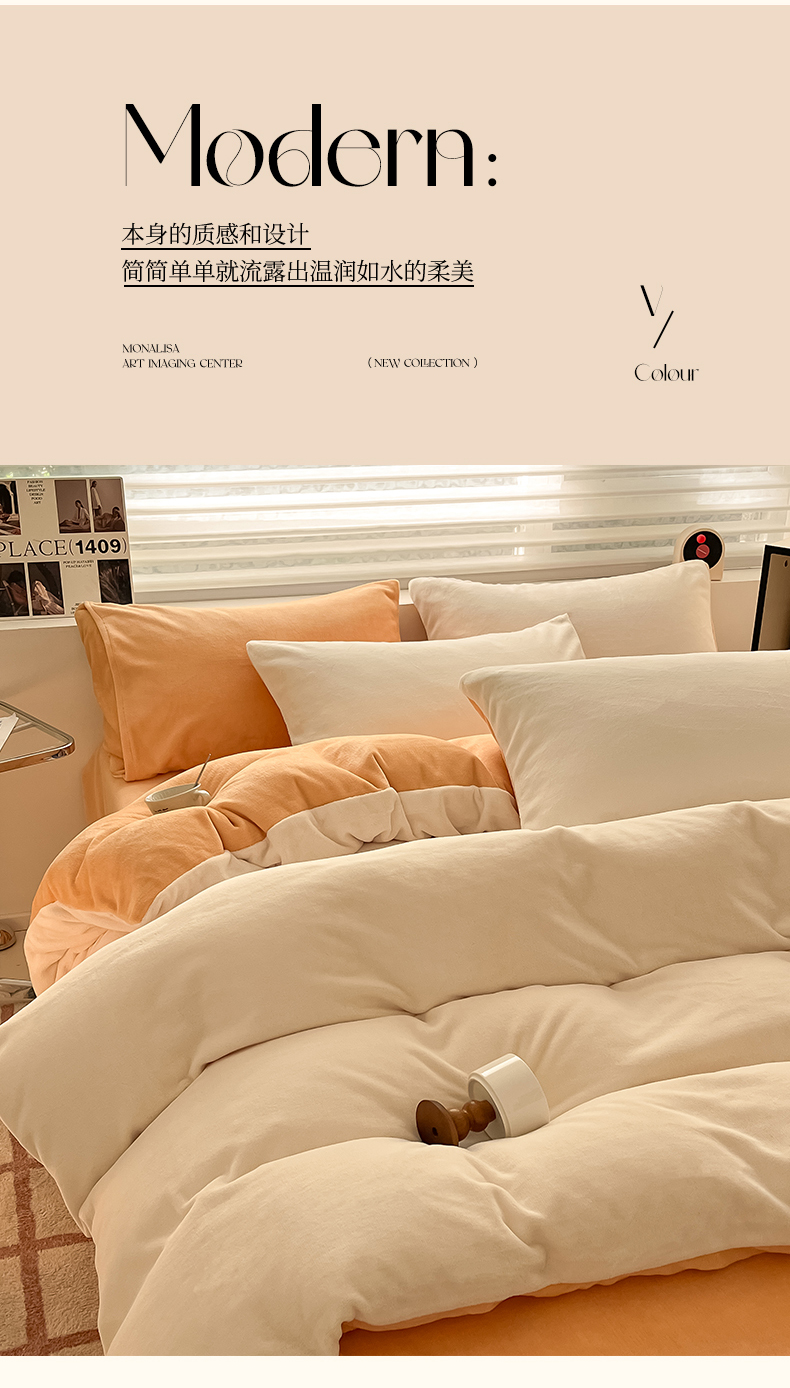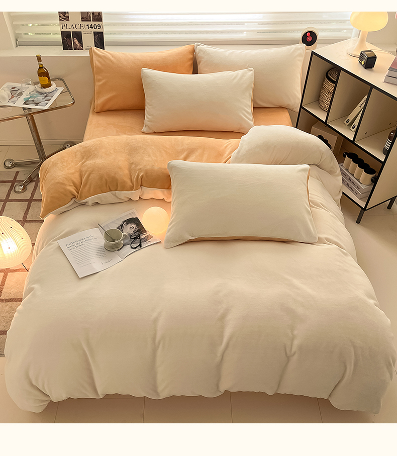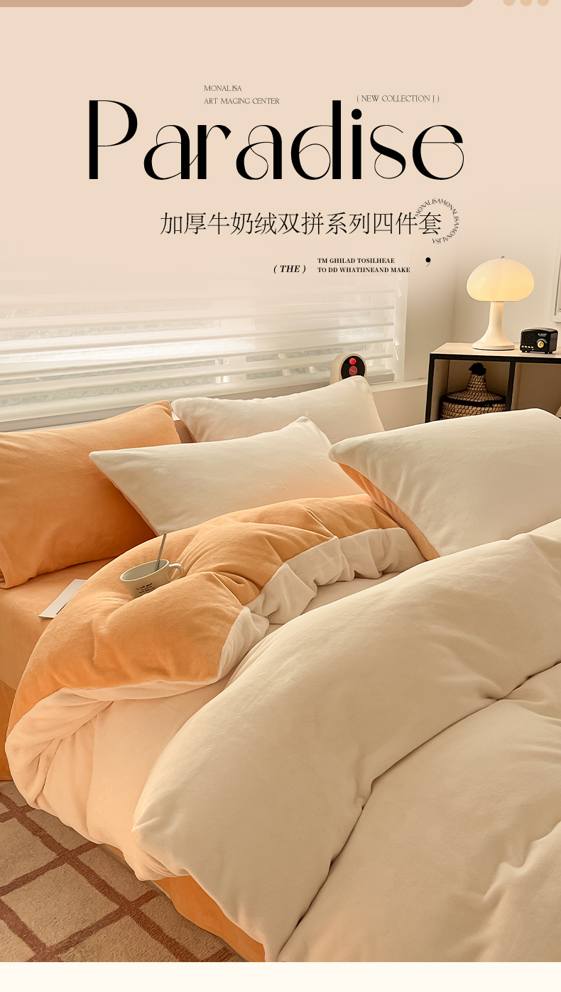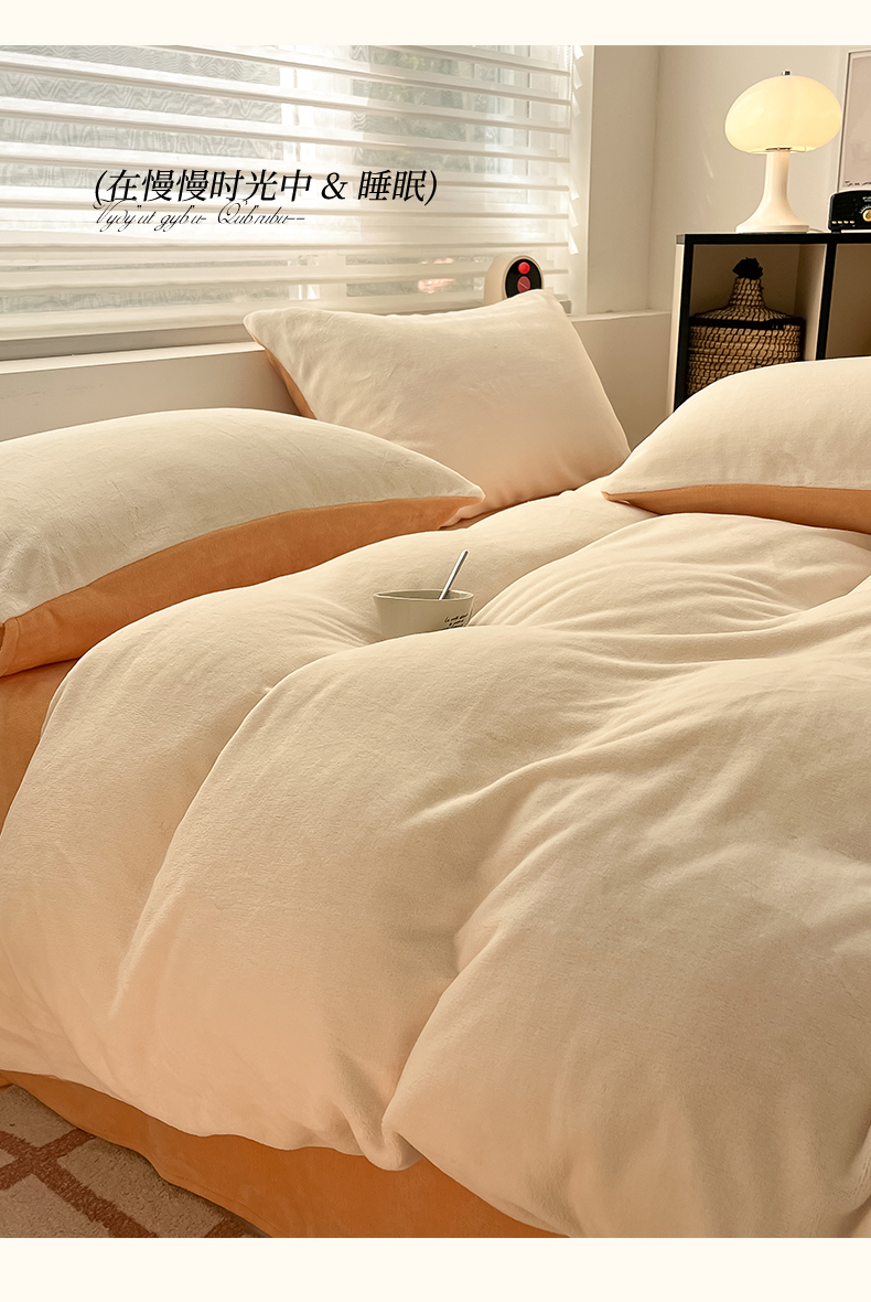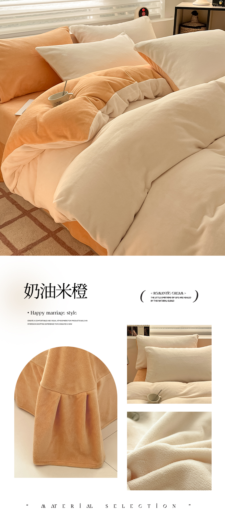 商品名称:绘萱 2025新款高克重纯色双拼牛奶绒四件套 奶油米橙
