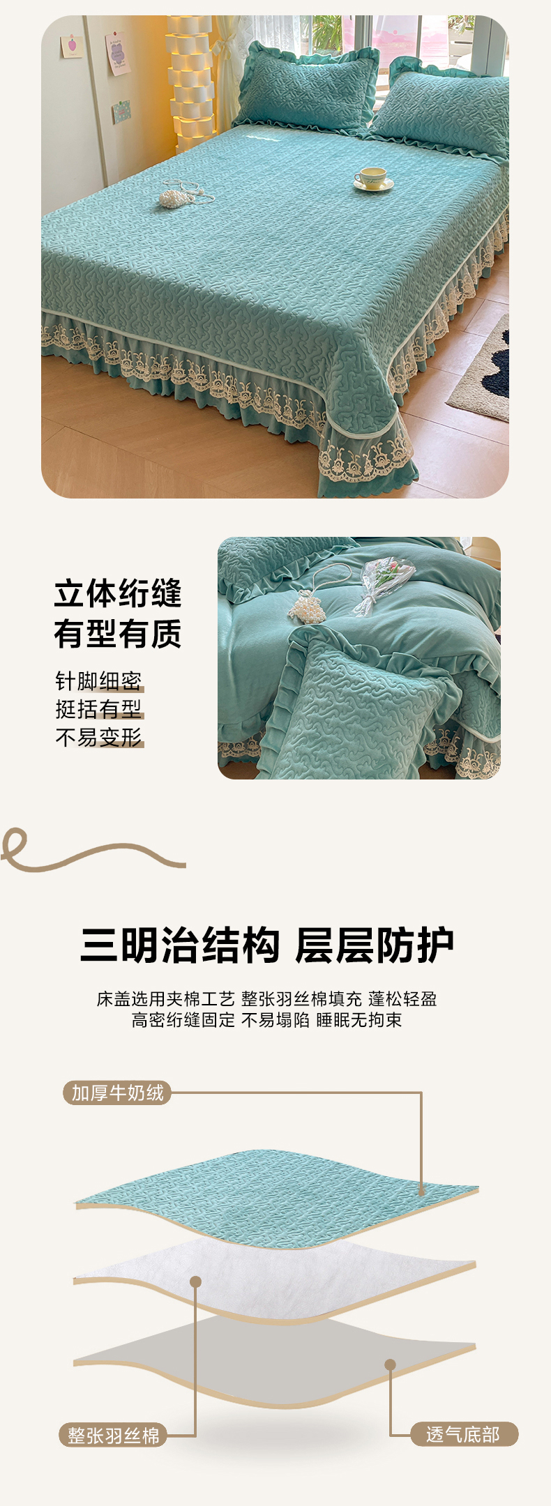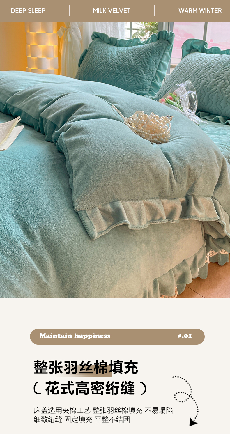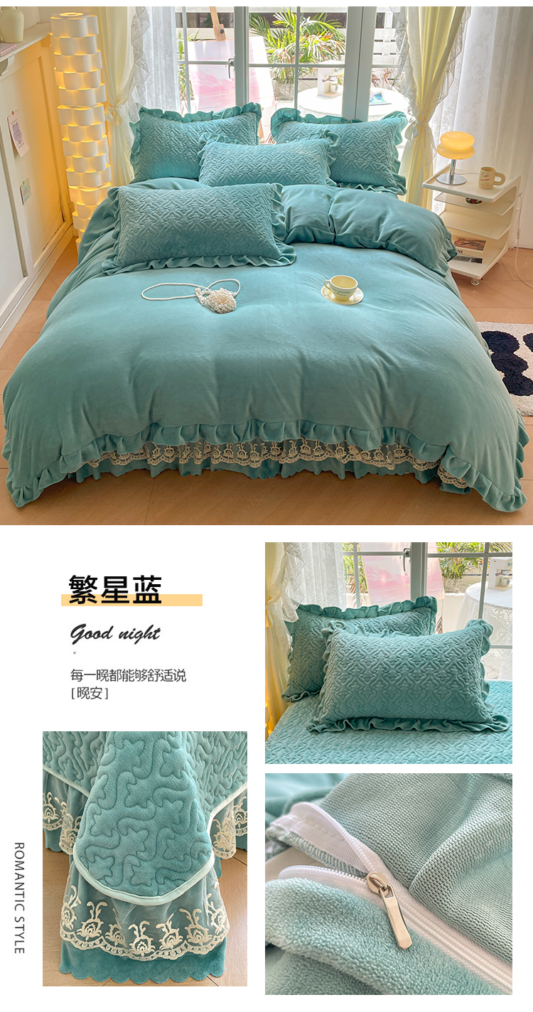 商品名称:畅畅家纺 2024新款冬季韩版花边蕾丝牛奶绒床盖四件套 繁星蓝