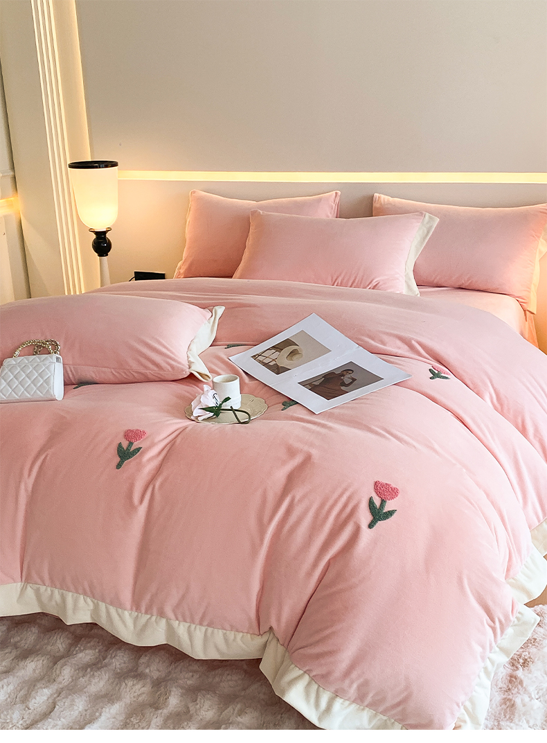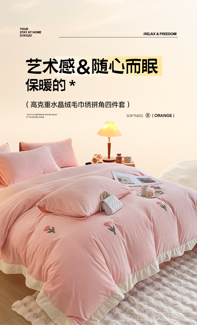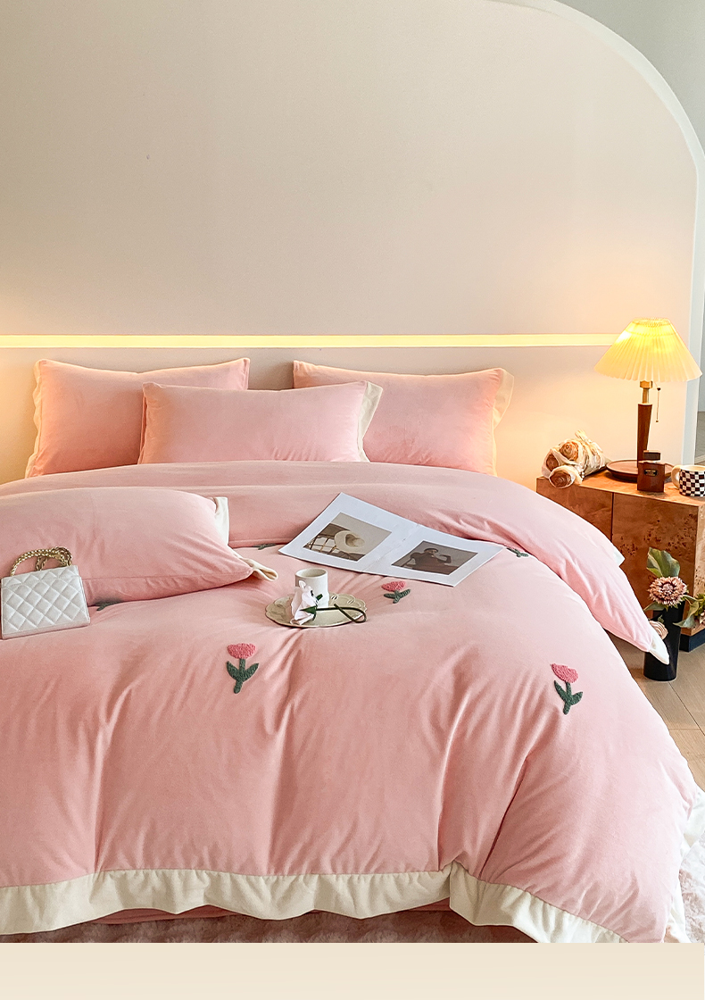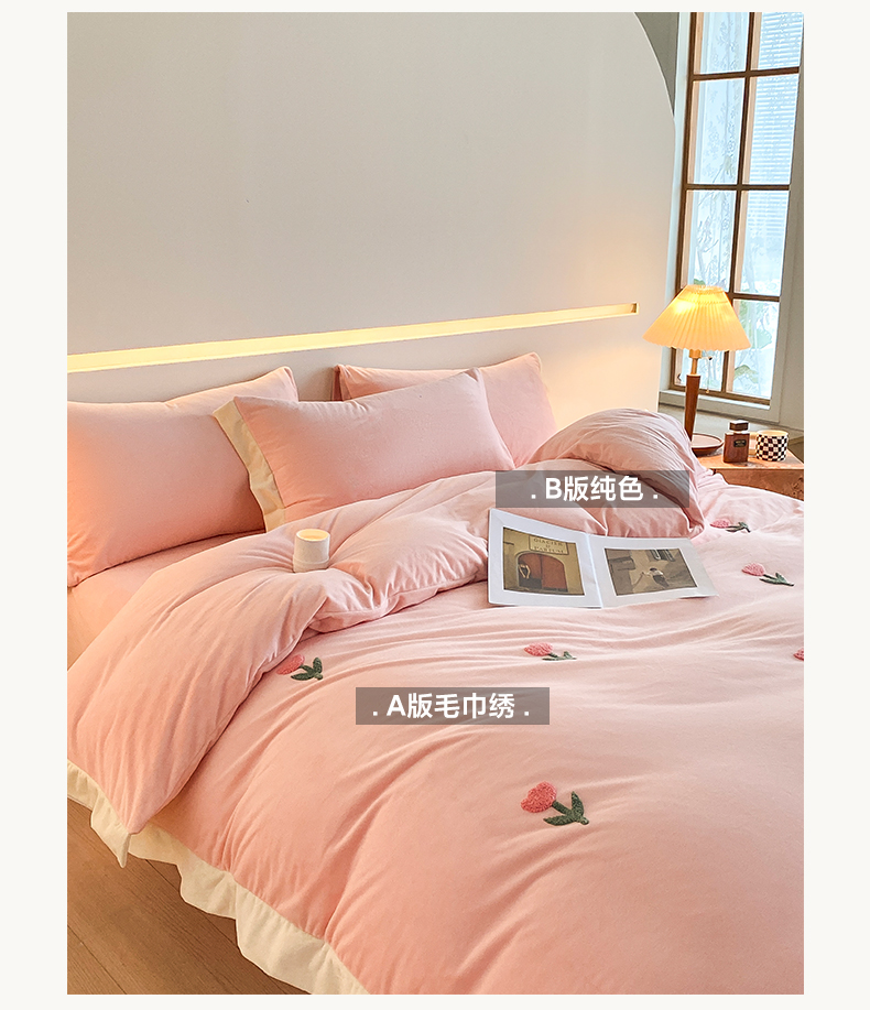 2024新款水晶绒拼角满版毛巾绣四件套 花朵-蜜桃粉