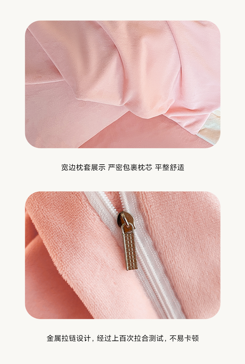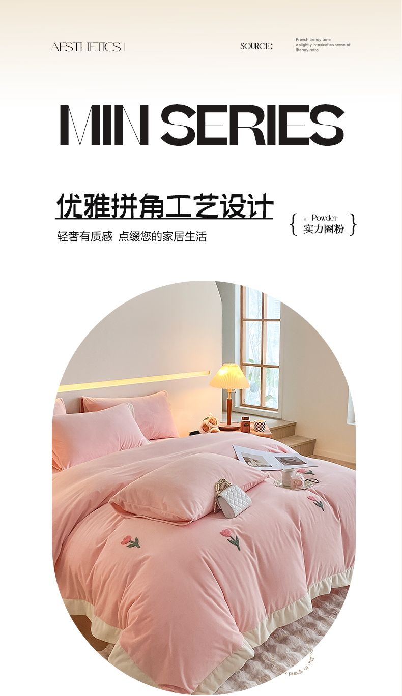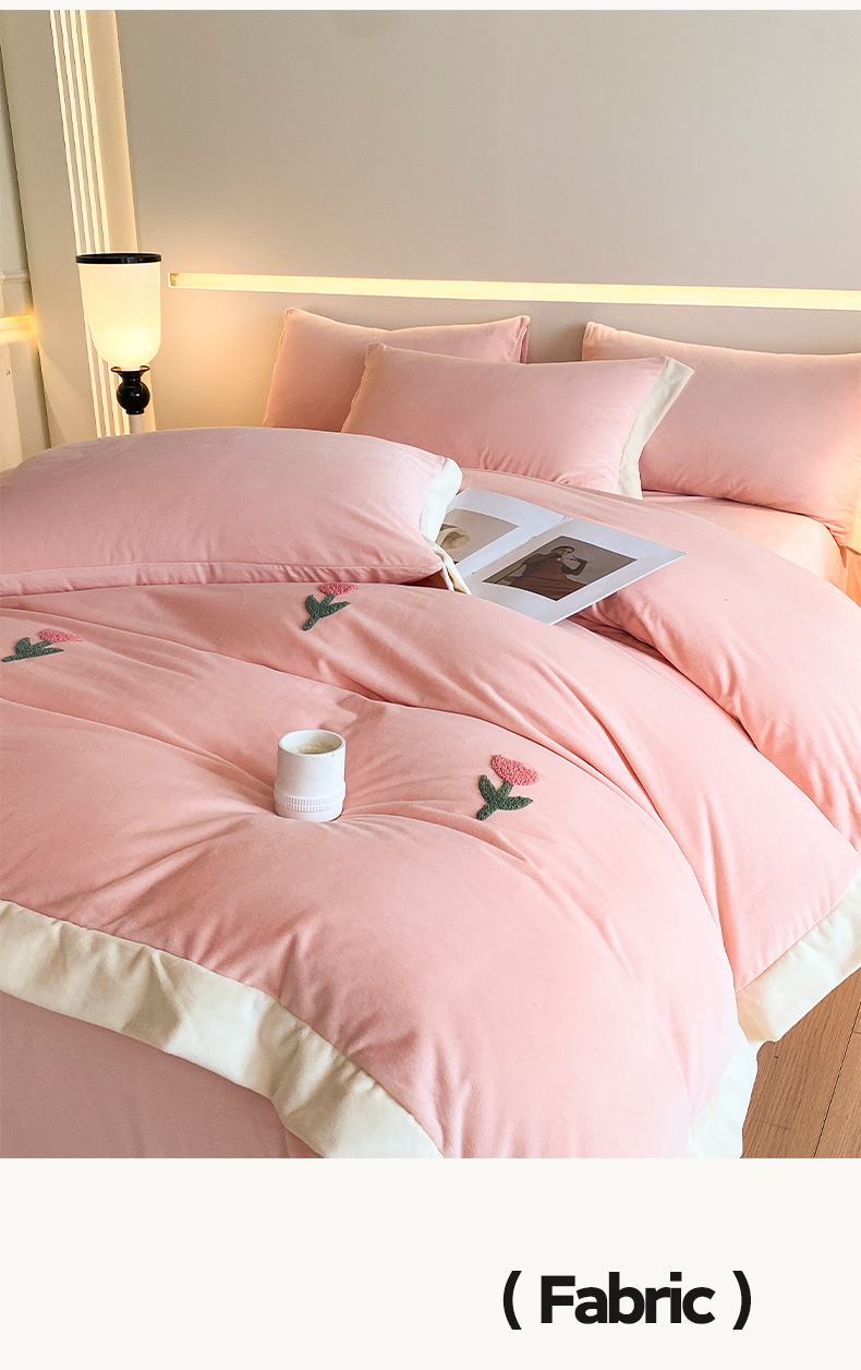 2024新款水晶绒拼角满版毛巾绣四件套 花朵-蜜桃粉