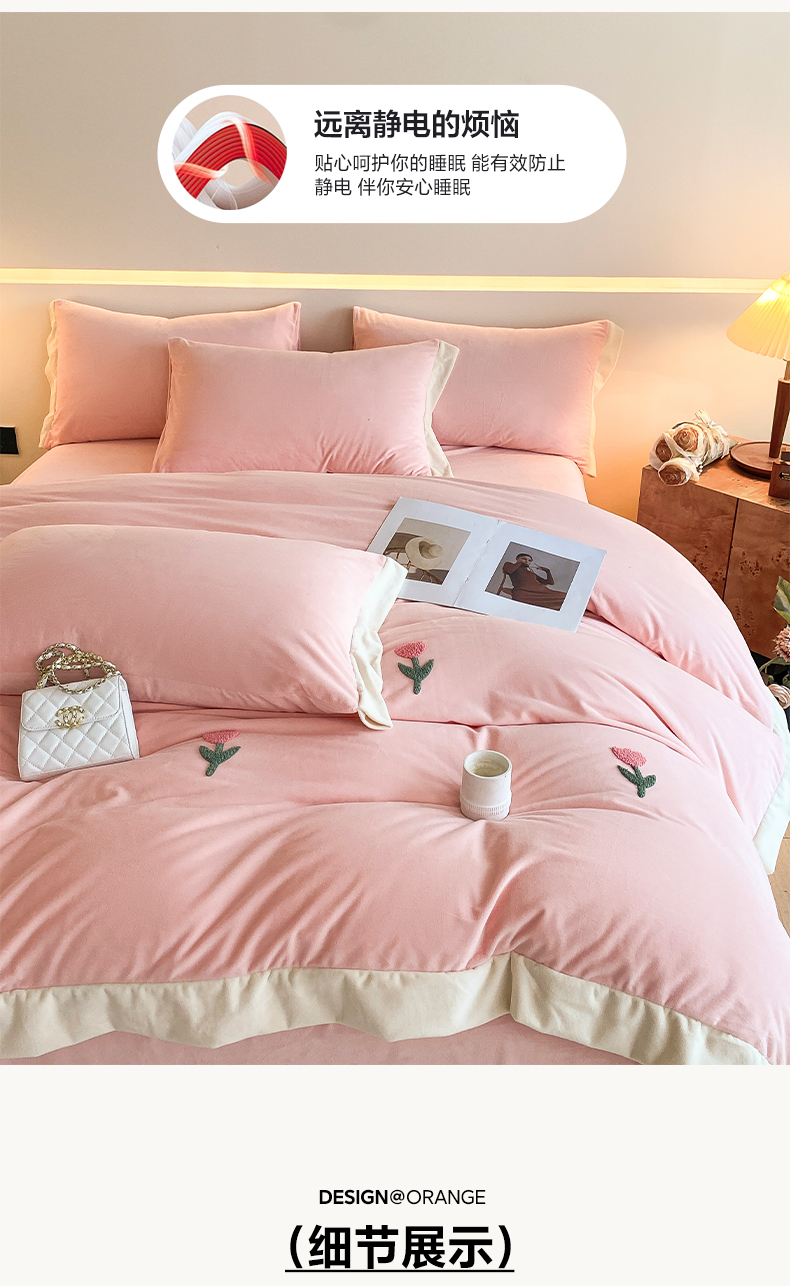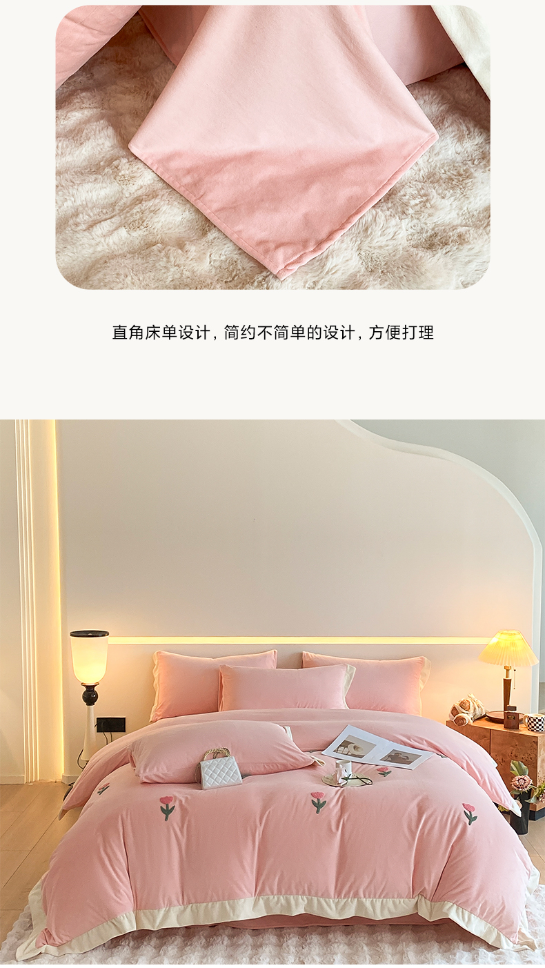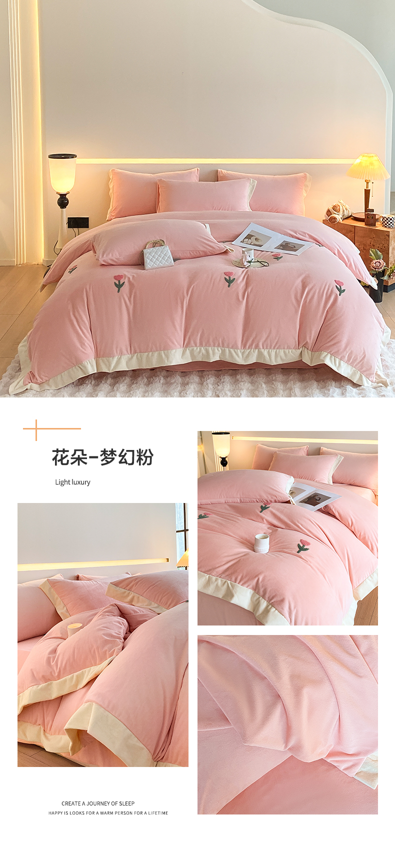 (总)如一 2025新款水晶绒双拼刺绣四件套-郁金香系列,郁金香-安娜紫,郁金香-宾利蓝,郁金香-蜜桃粉,郁金香-奶白粉,郁金香-奶白绿,郁金香-胭脂粉