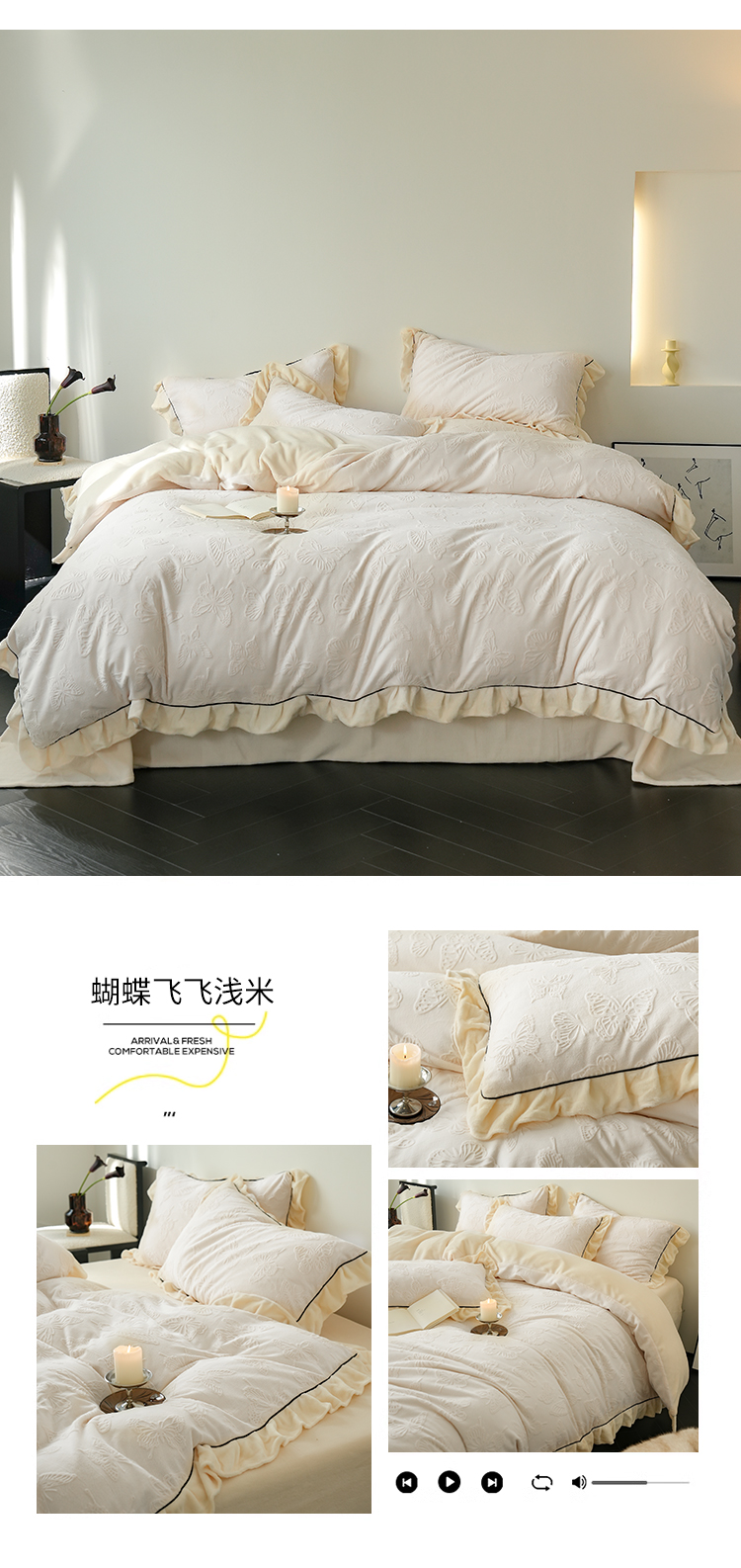 商品名称:萝莉家纺 2024新款加厚牛奶绒提花浪漫雕花绒四件套 蝴蝶飞飞浅米