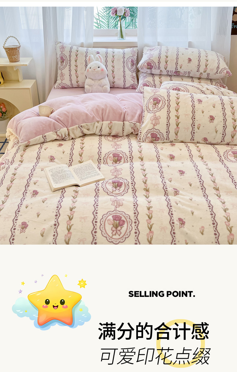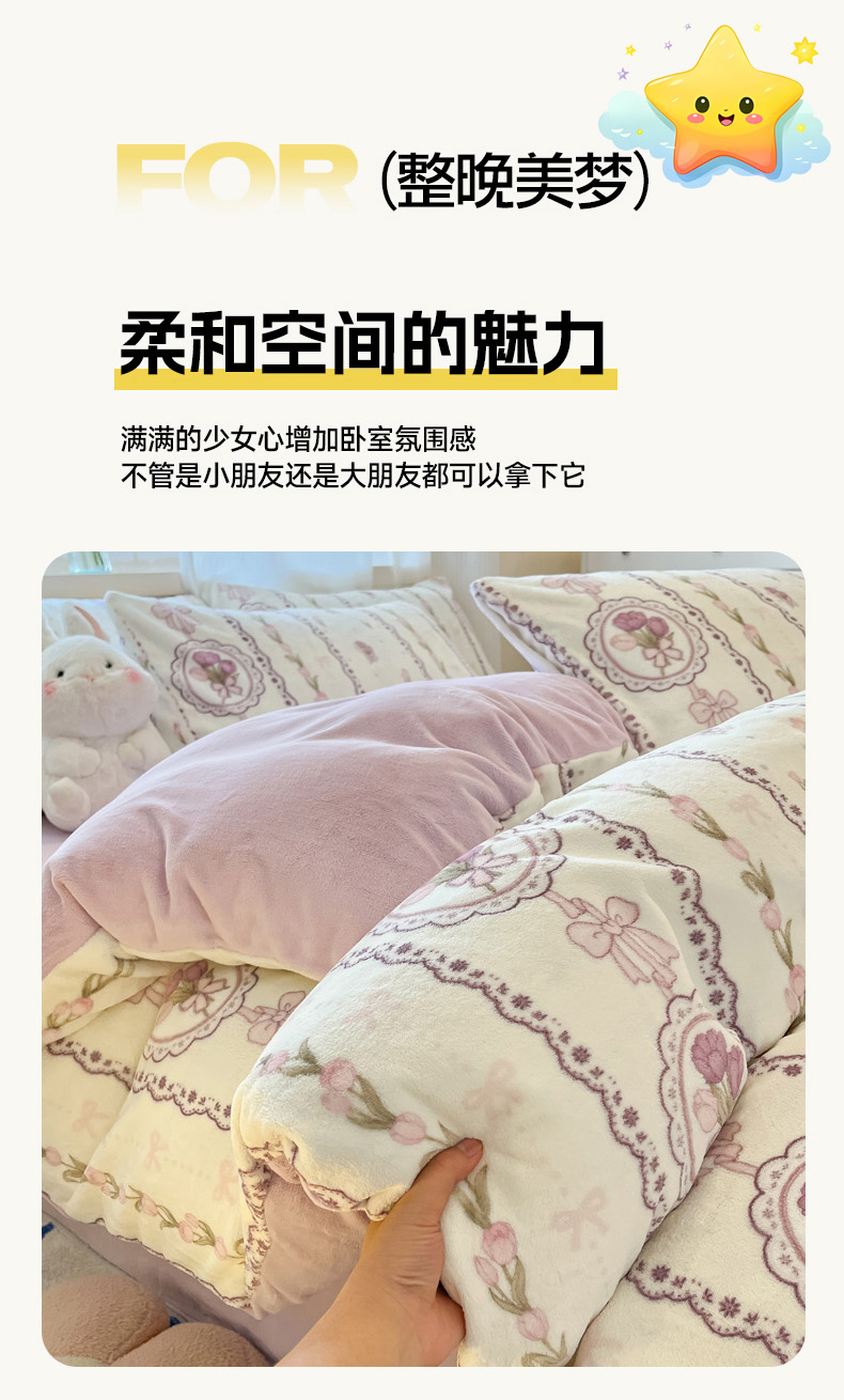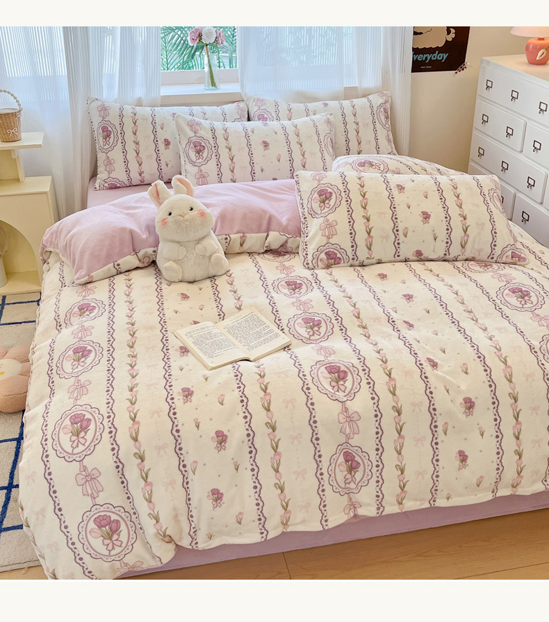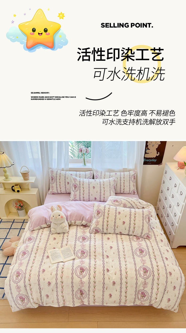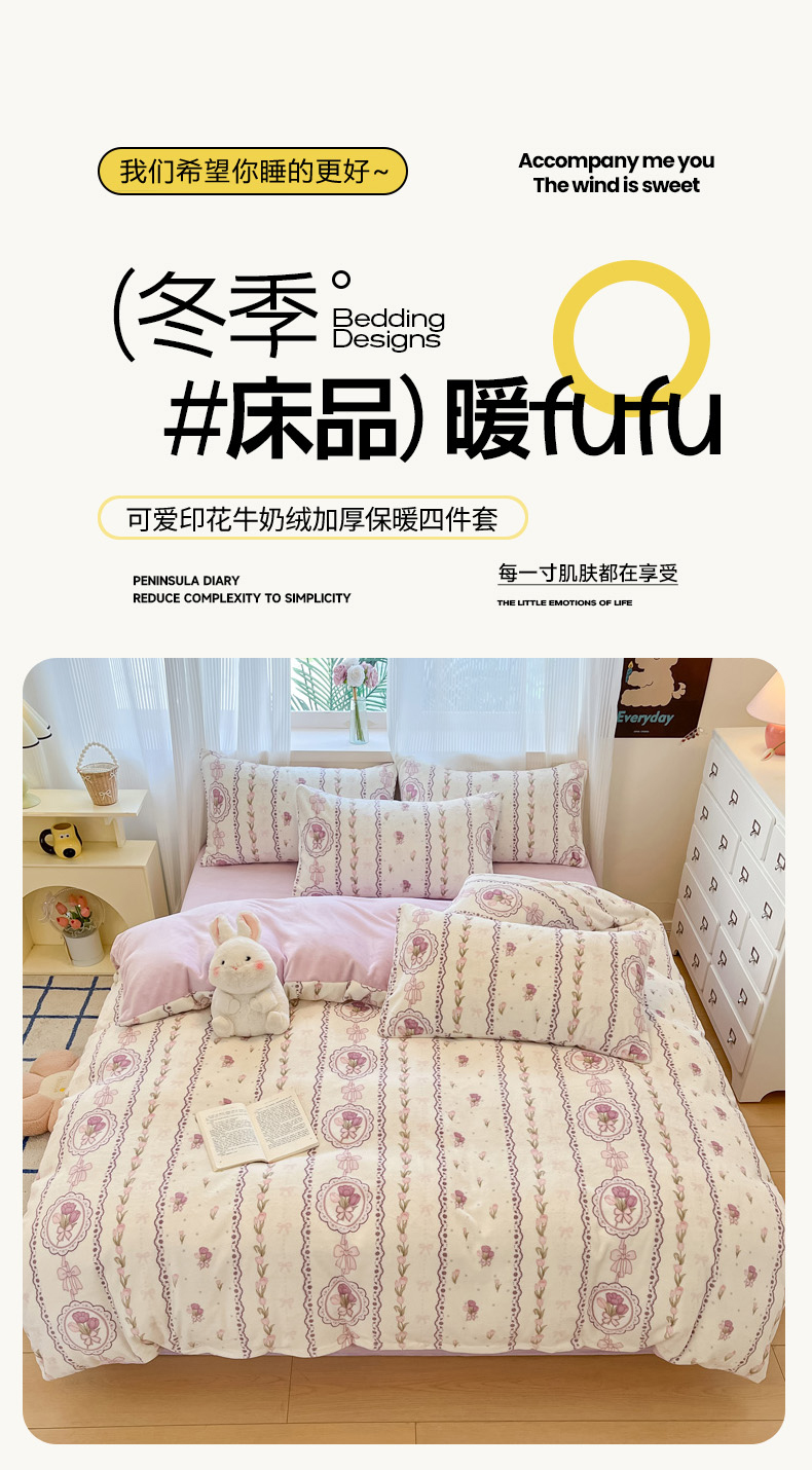 当前位置: 91家纺网 > 商品网购 > 床品套件 > 四件套 > 牛奶绒四件套 > 慕澄家纺 2024新款小清新可爱印花牛奶绒加厚保暖四件套 竖条花