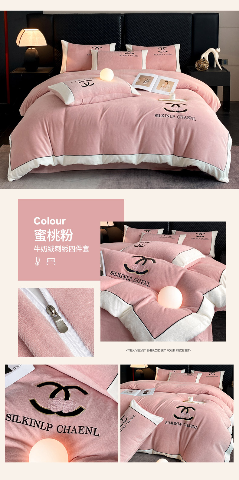 商品名称:丝印良品 2024秋冬新款小香风香奈系列牛奶绒四件套蜜桃粉