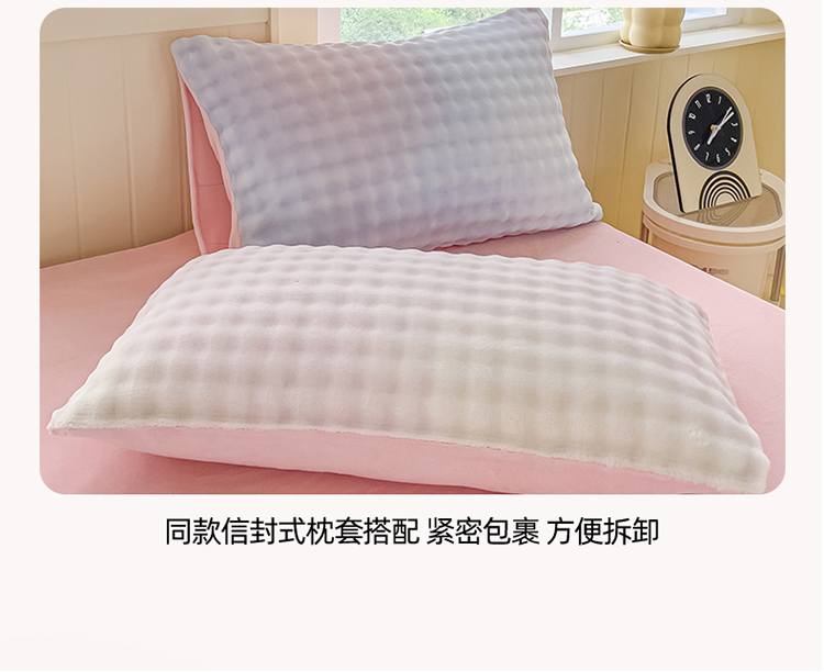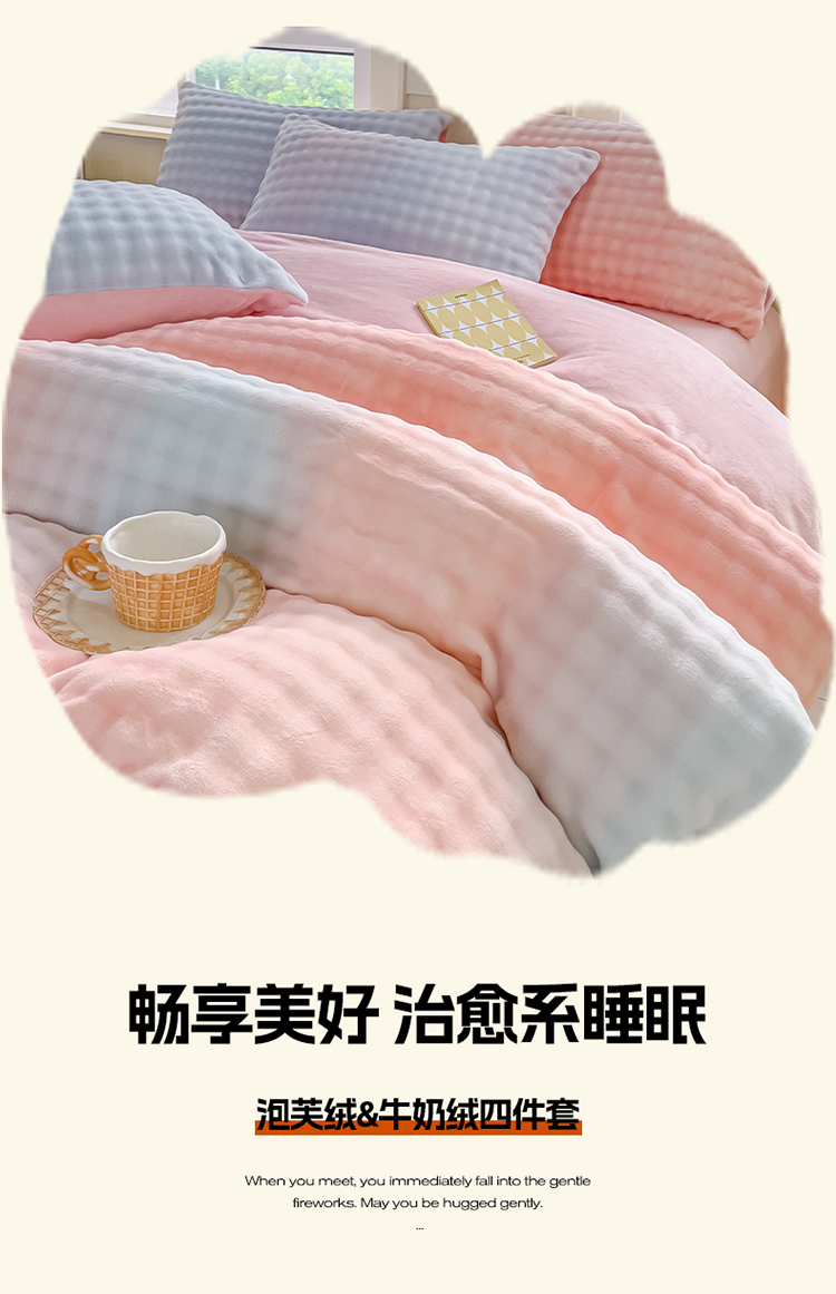 商品名称:言熙居2024新款-A面泡芙绒B面全消光8到9斤牛奶绒三四件套 泡芙-粉蓝