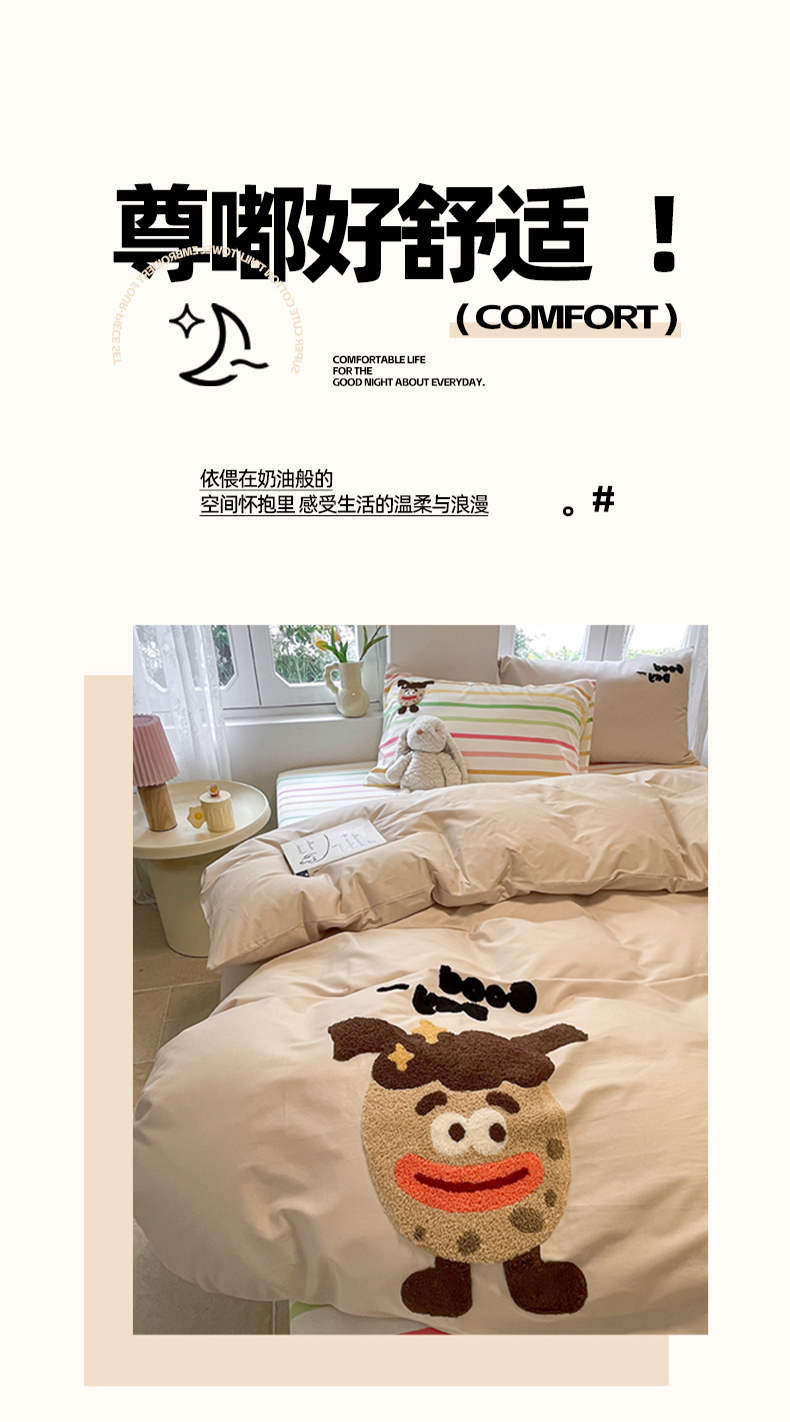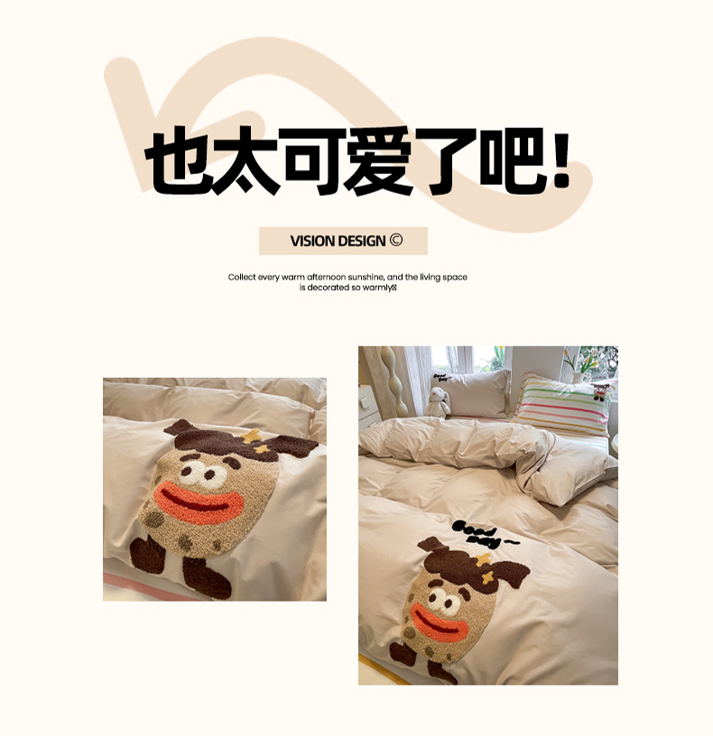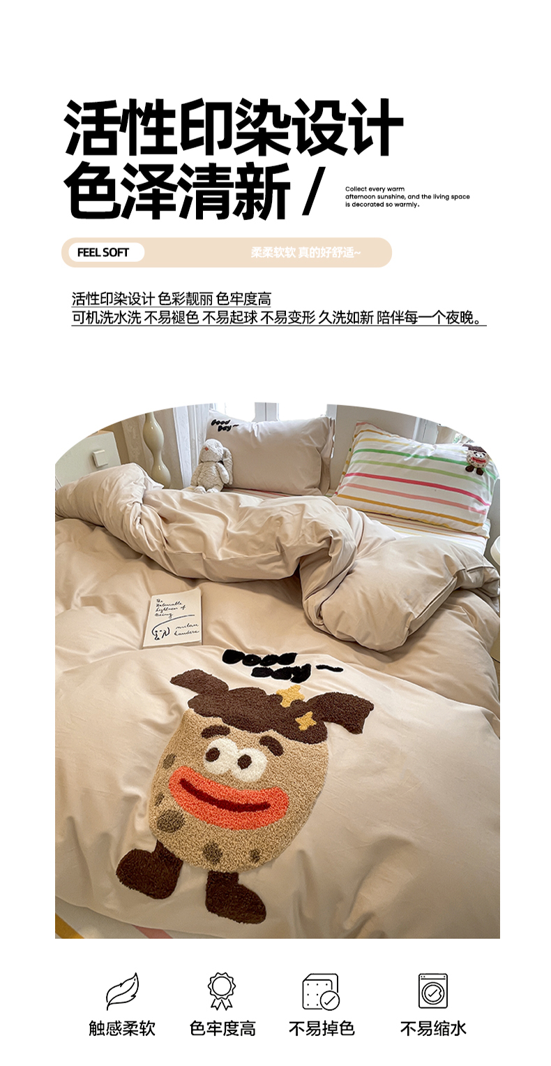 商品名称:吉象家纺 2024新款全棉斜纹毛巾绣混搭四件套 香肠嘴娃娃