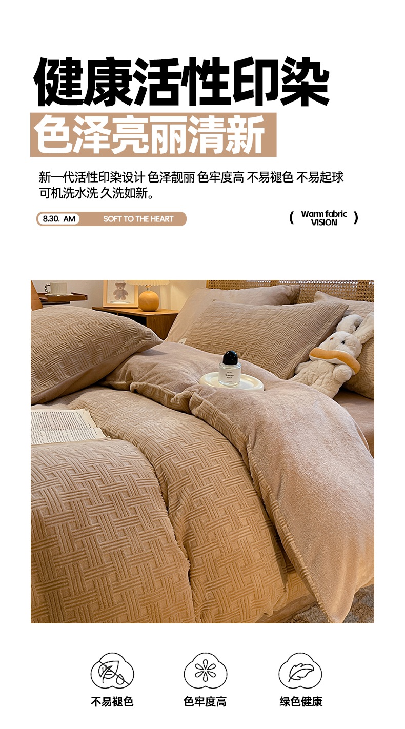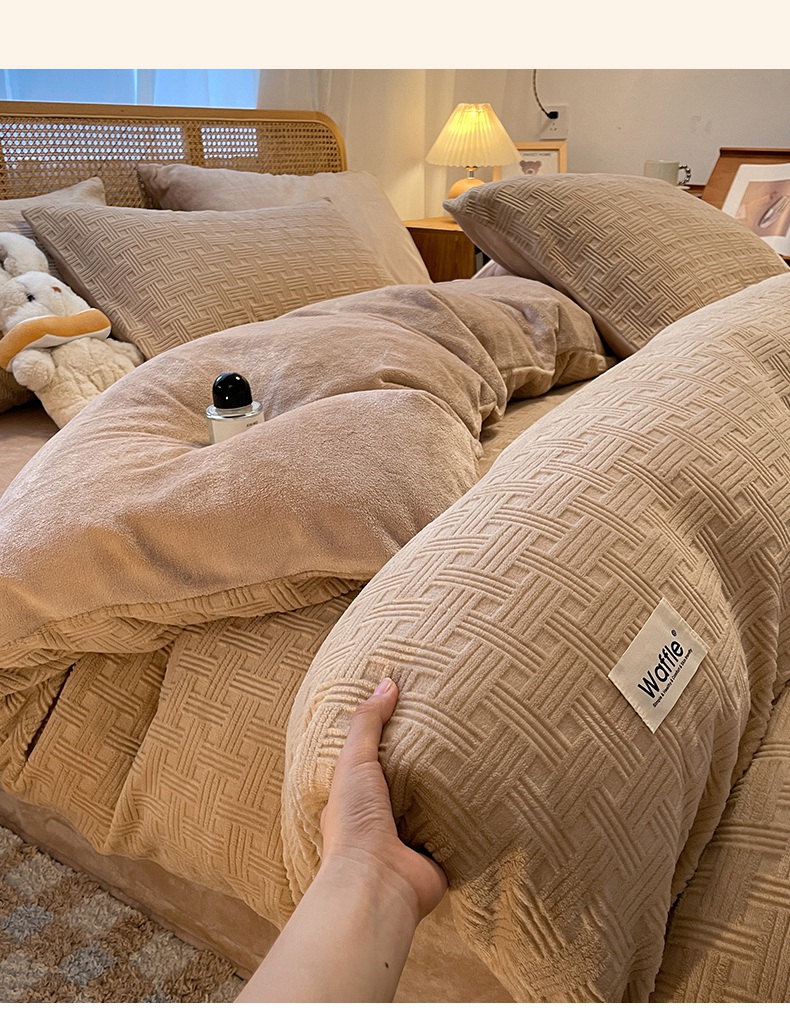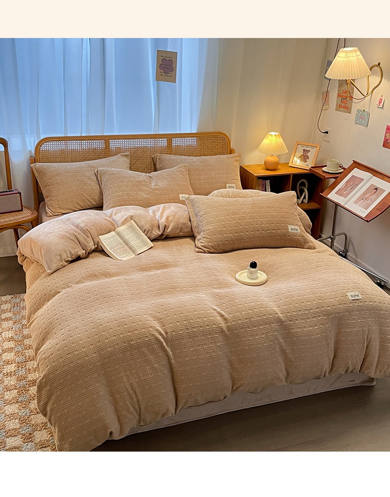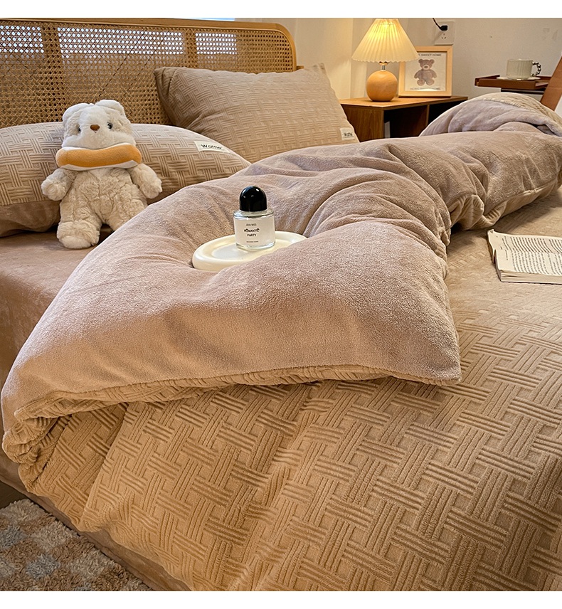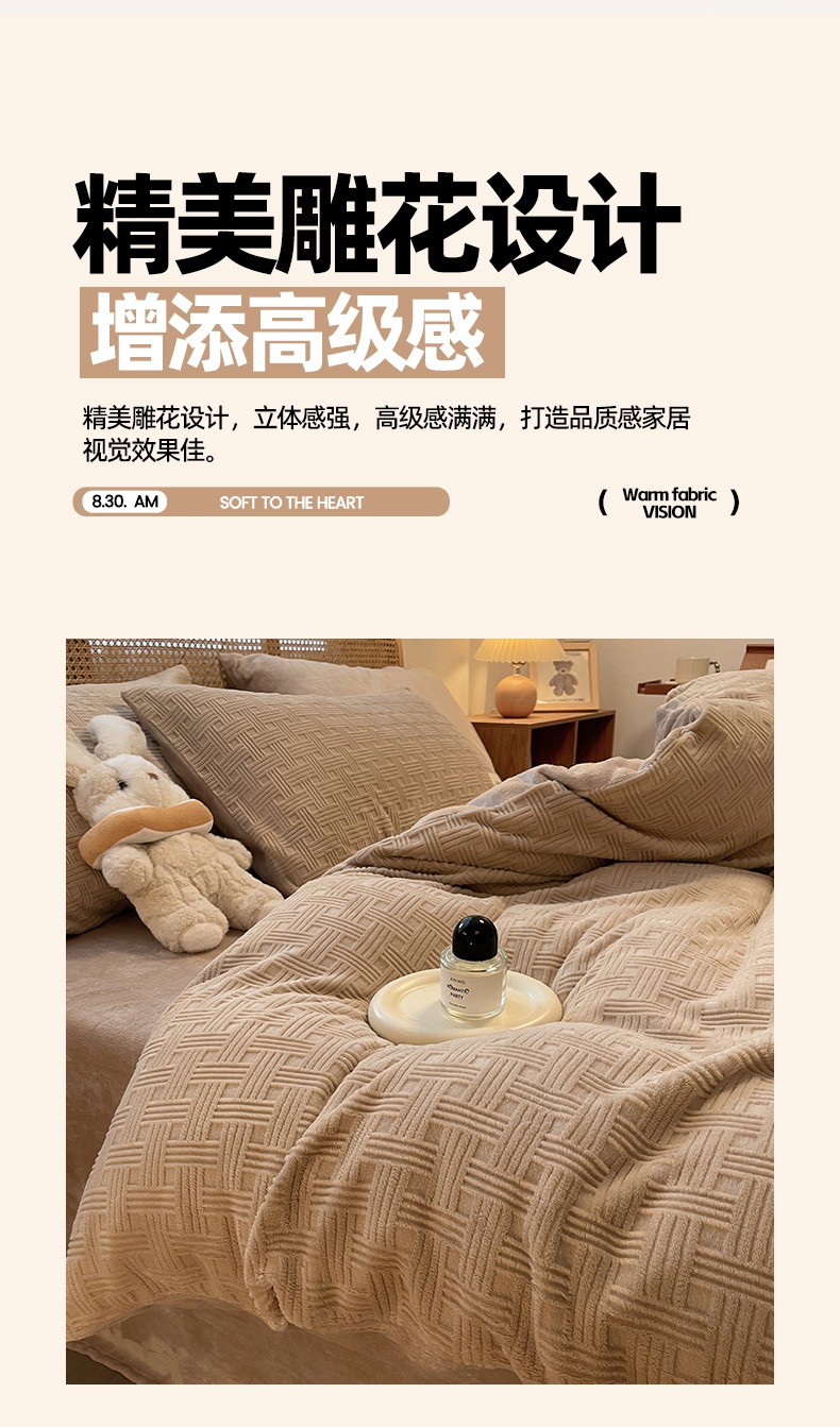 当前位置: 91家纺网 > 商品网购 > 床品套件 > 四件套 > 牛奶绒四件套 > 莱茵家居 2024新款A类高克重雕花牛奶绒四件套-糖果格 糖果格-咖色