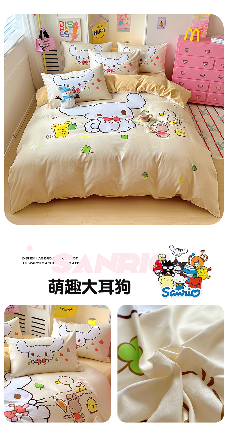 当前位置: 91家纺网 > 商品网购 > 床品套件 > 四件套 > 普通磨毛四件套 > 木堇家居 2024新款三丽欧大版原棉磨毛四件套 萌趣大耳狗