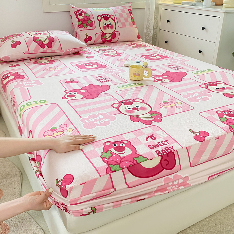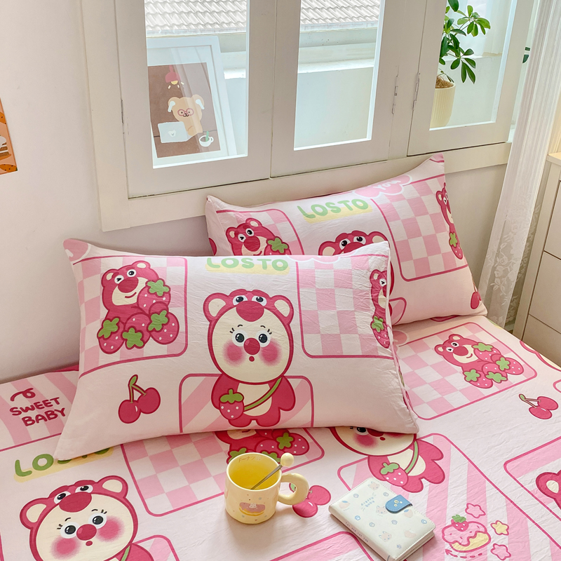 伊凡 2025新款印花亲肤水洗棉床笠单床笠跨境电商爆款 粉红熊