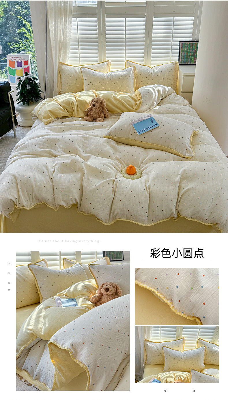 商品名称:眠屿家纺 2024新款全棉皱皱纱牛奶绒四件套 彩色小圆点