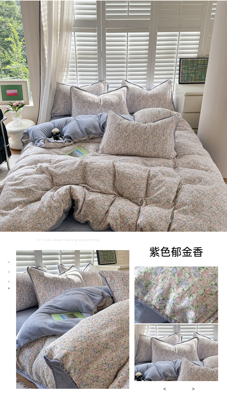 眠屿家纺 2024新款全棉皱皱纱牛奶绒四件套 紫色郁金香