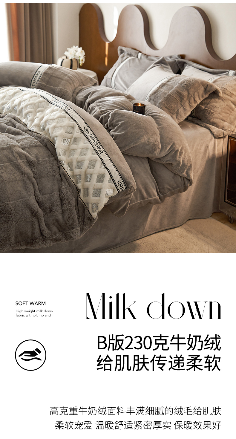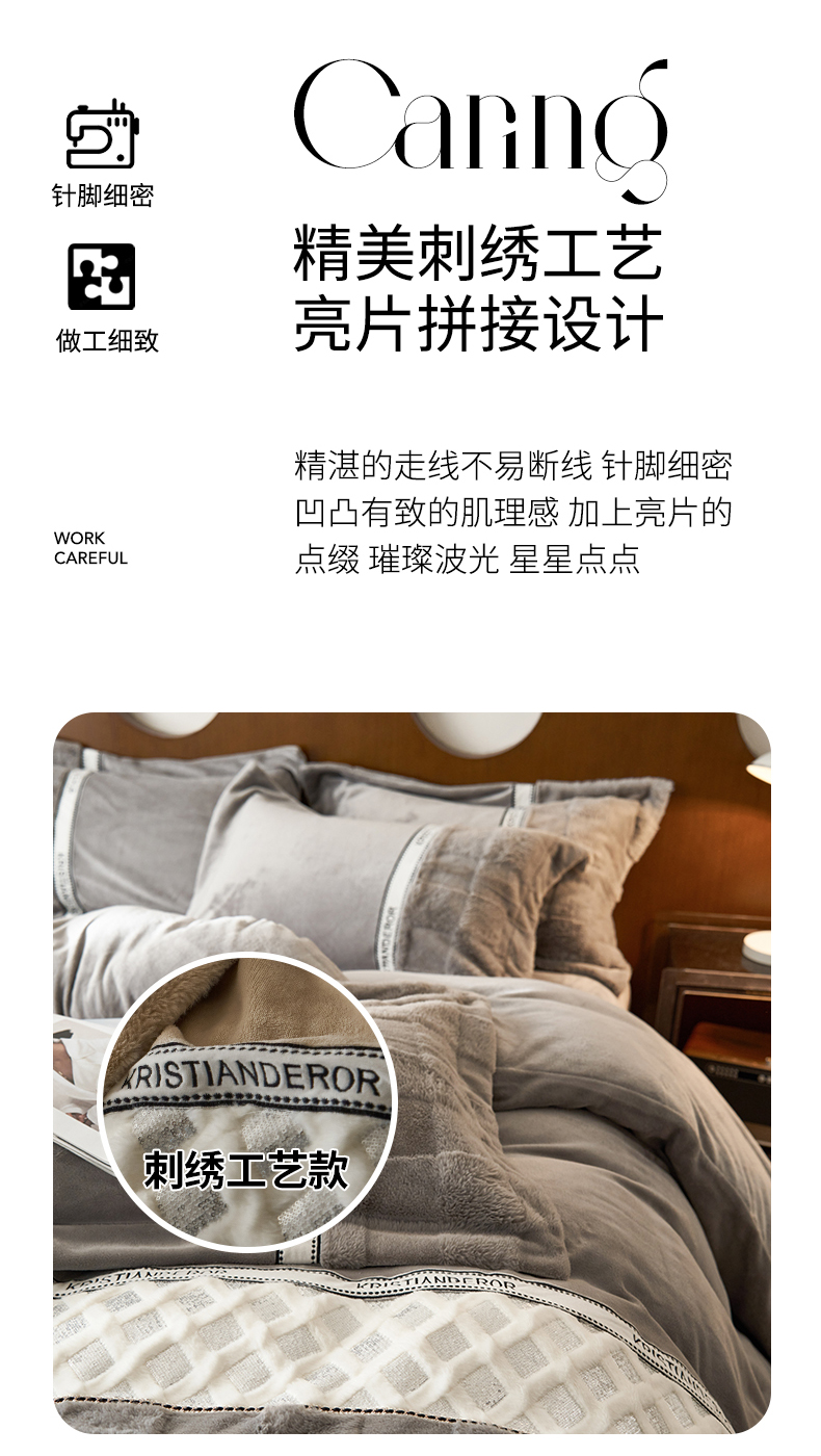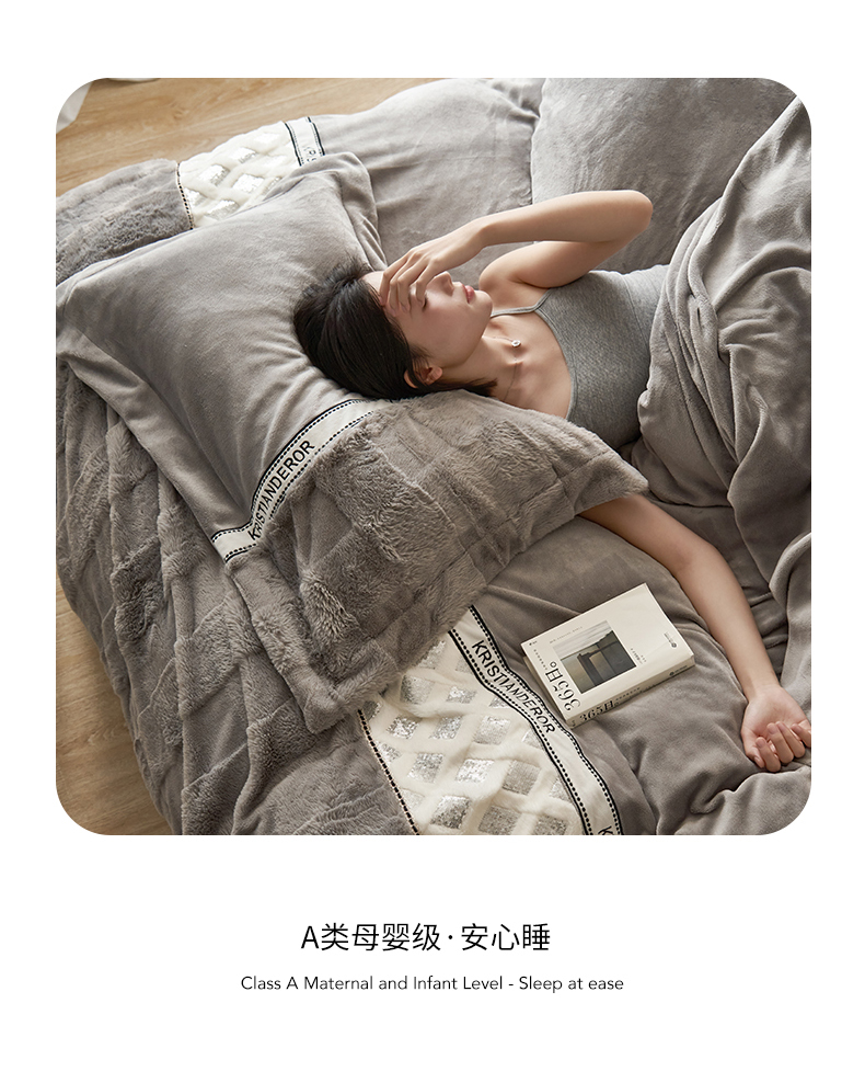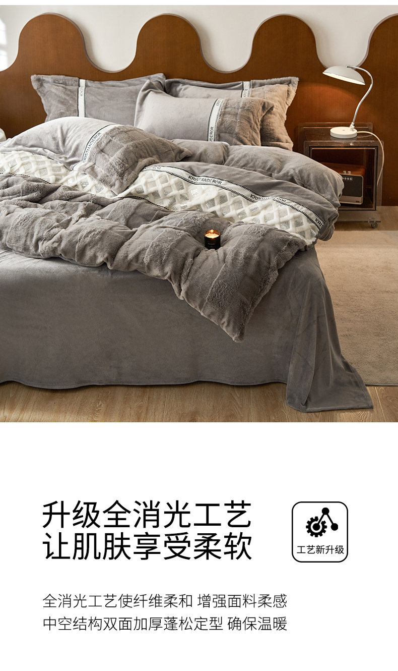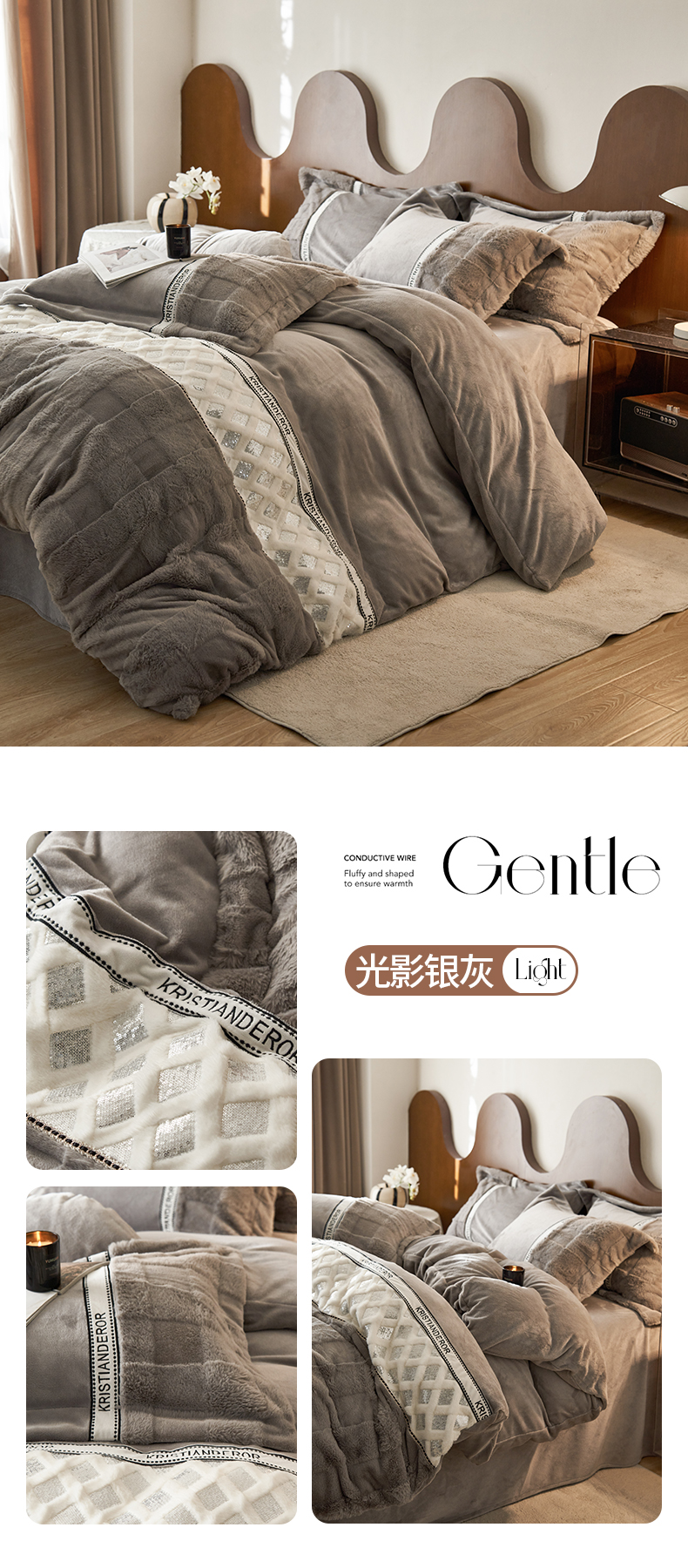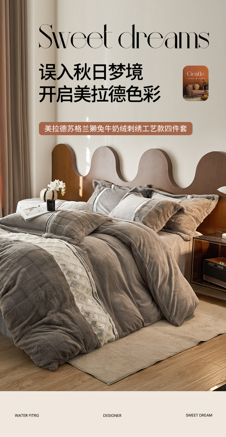 安莱生活 2024新款美拉德苏格兰獭兔牛奶绒刺绣工艺款四件套-风格一 光影银灰