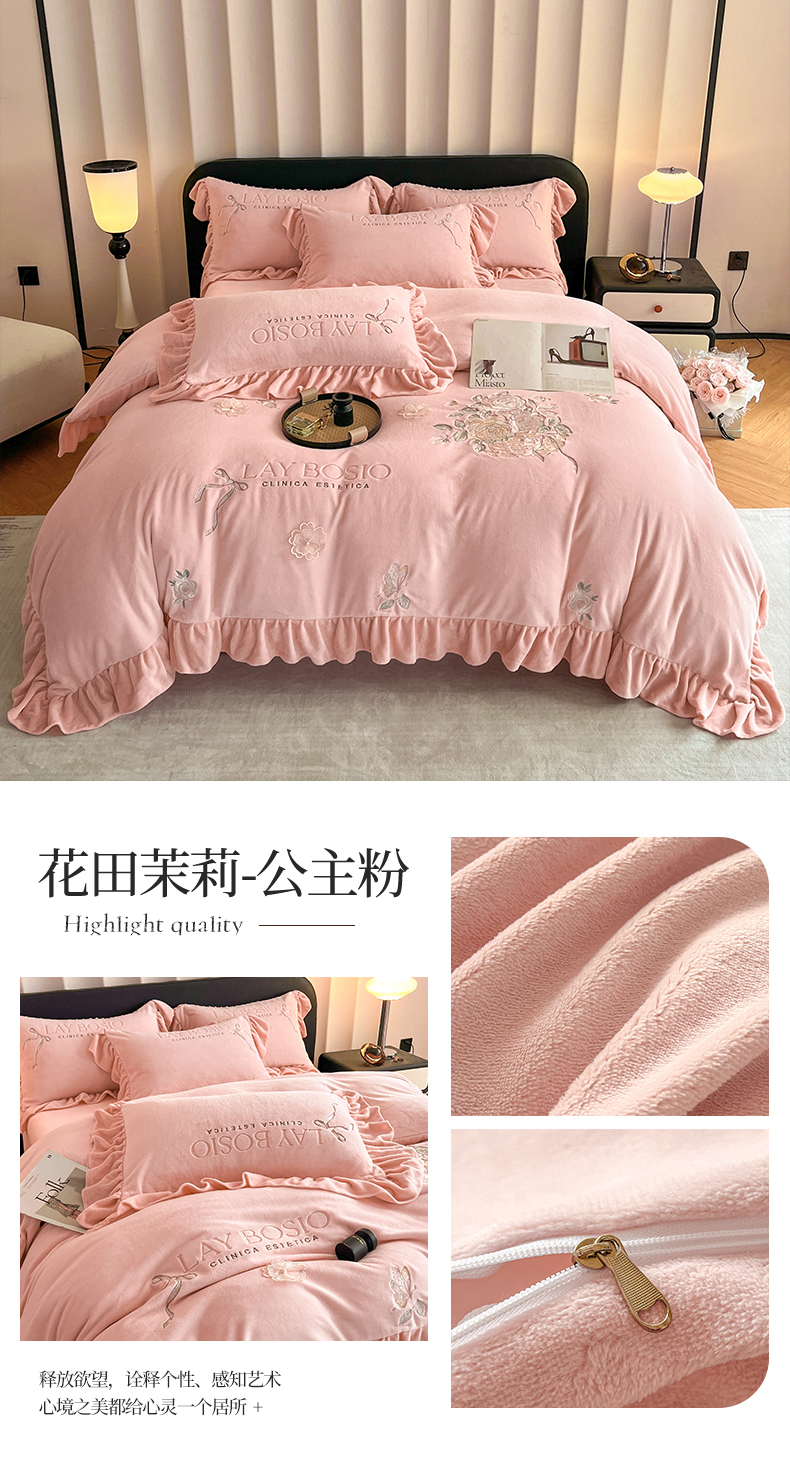 爱家(原缔乐家纺) 2024新款A类高克重牛奶绒立体花刺绣四件套--花田茉莉 花田茉莉-公主粉