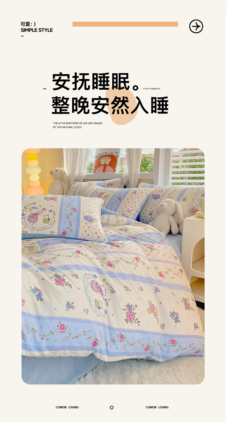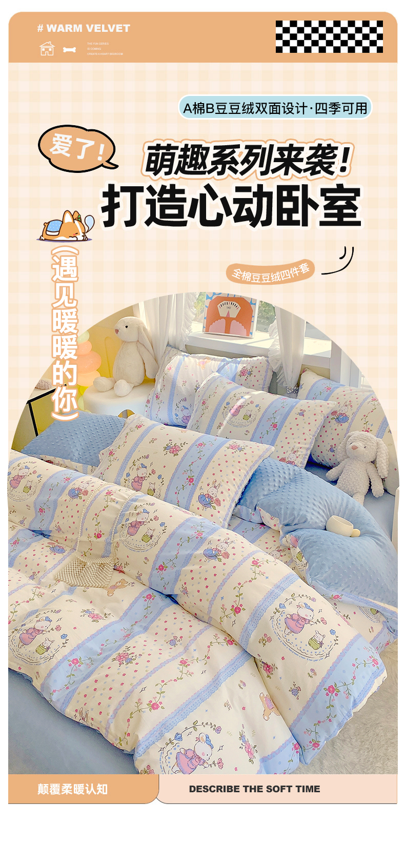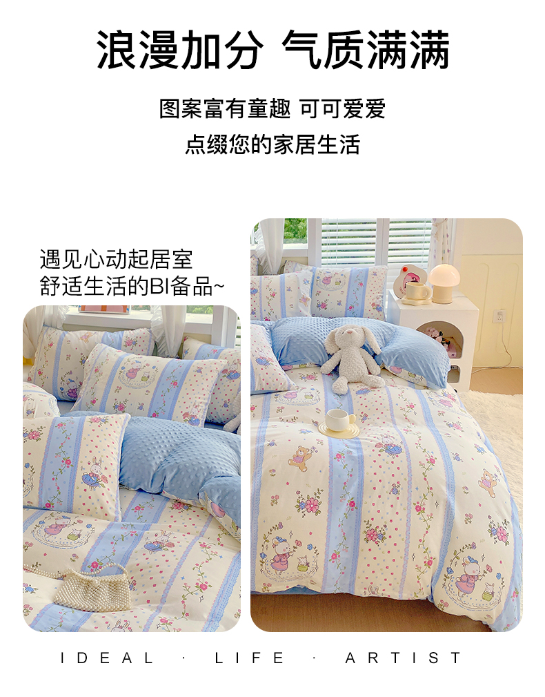 当前位置: 91家纺网 > 商品网购 > 床品套件 > 四件套 > 其它四件套 > 金鑫汇家纺 2024新款棉加豆豆绒系列四件套 快乐萌兔
