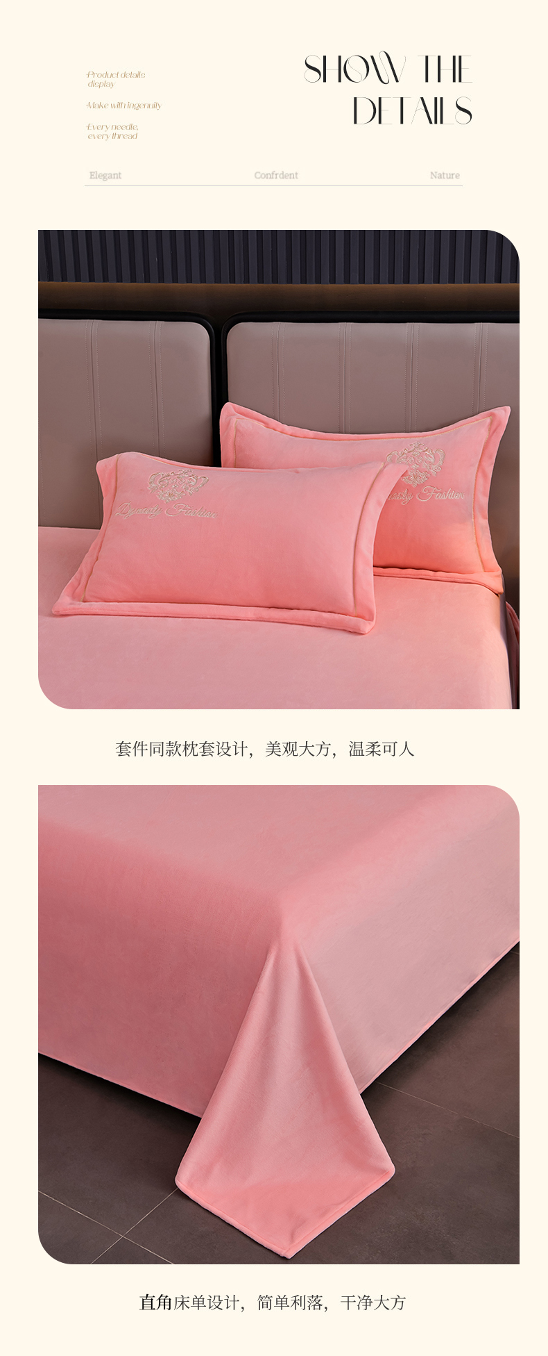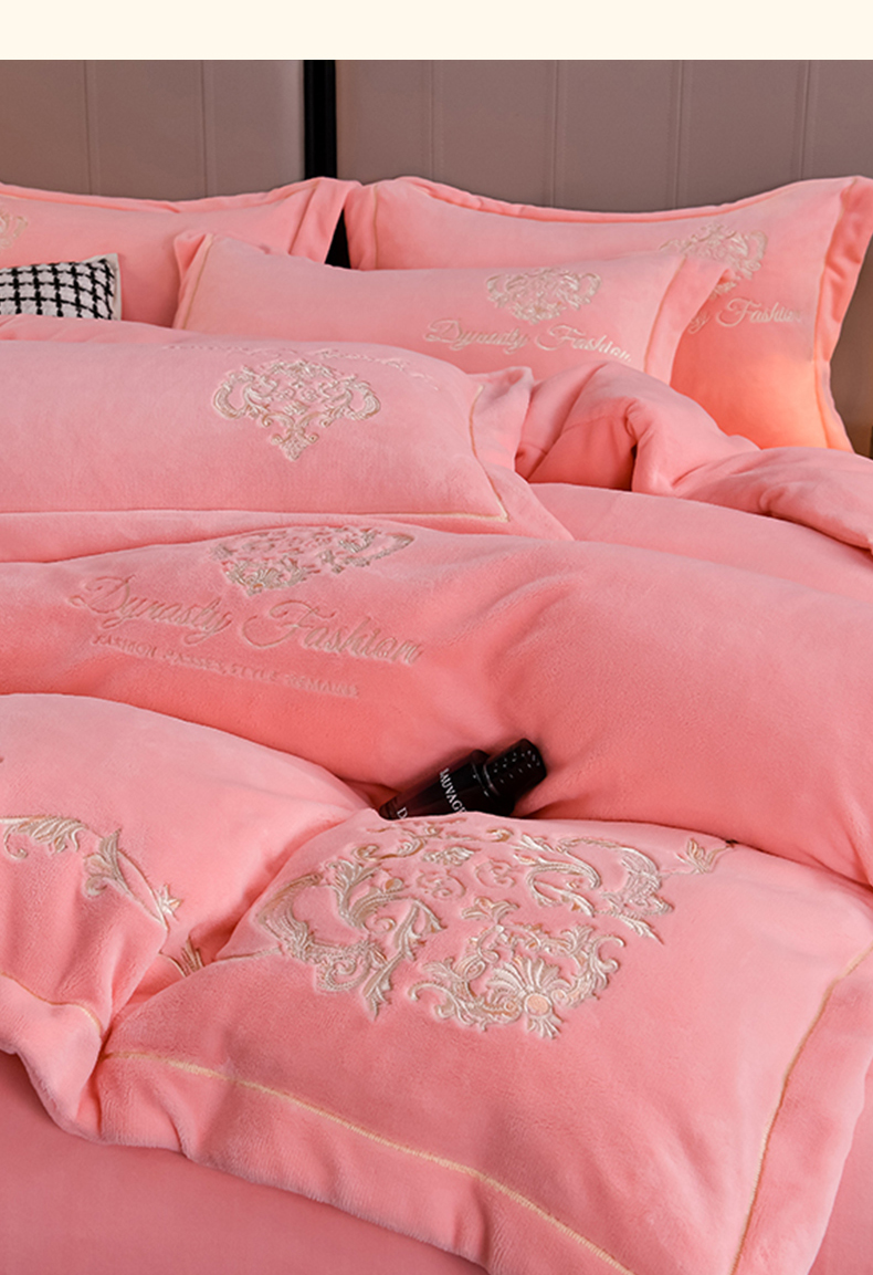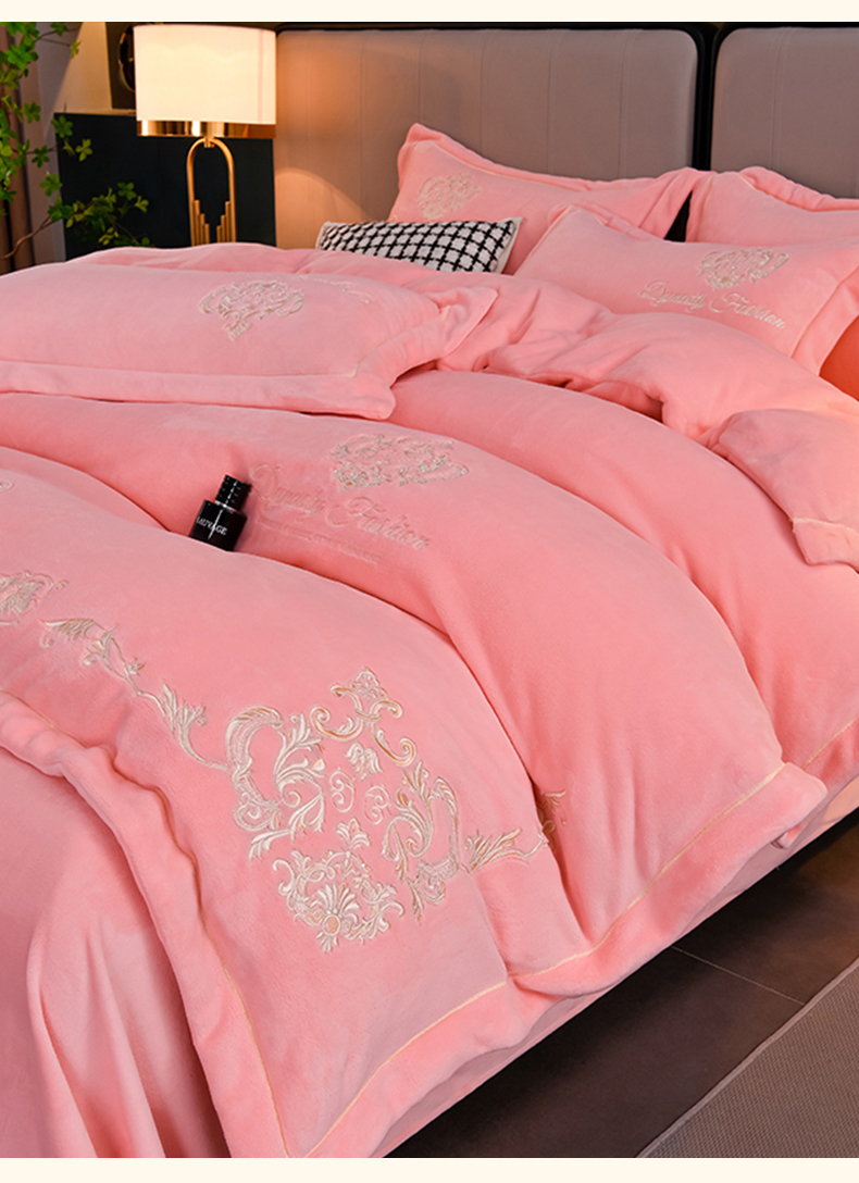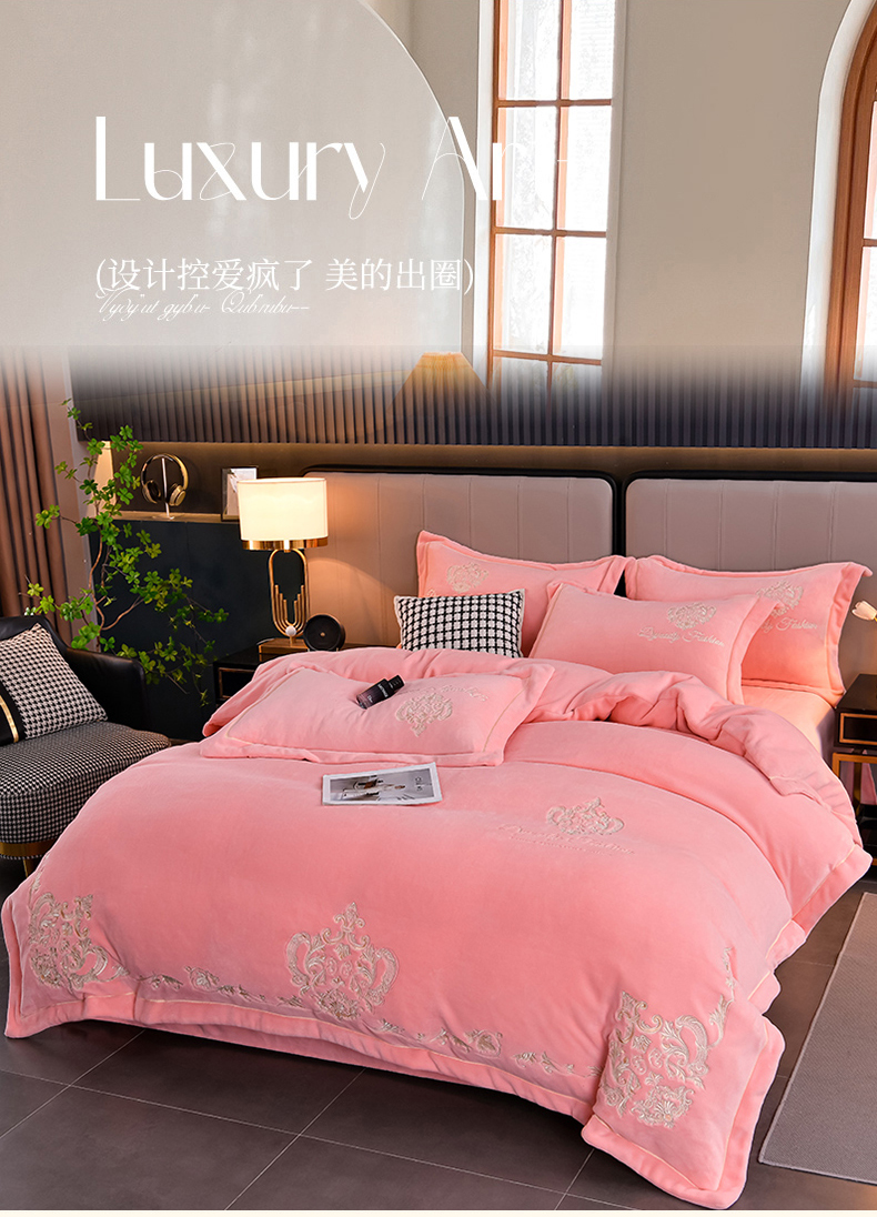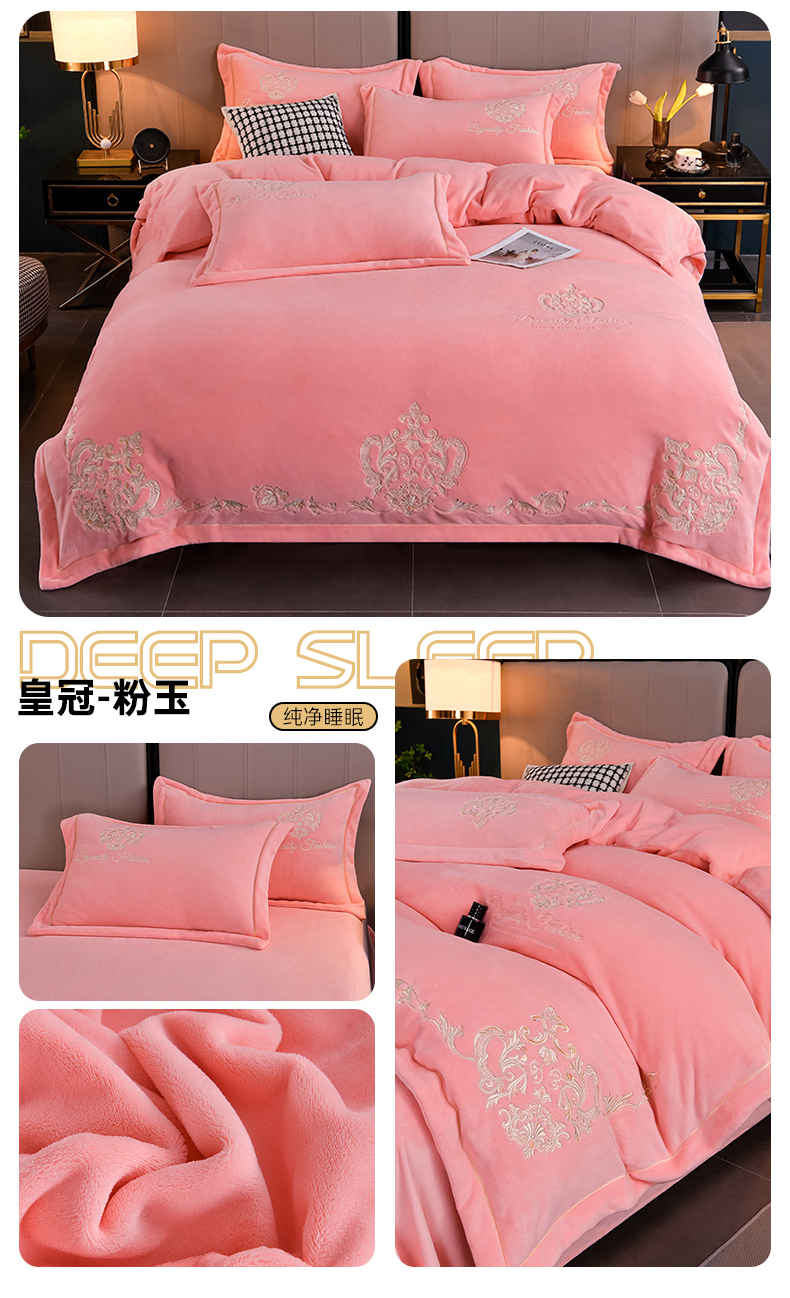 沐妍家纺 2024新款重工刺绣绣花纯色牛奶绒四件套皇冠-粉玉