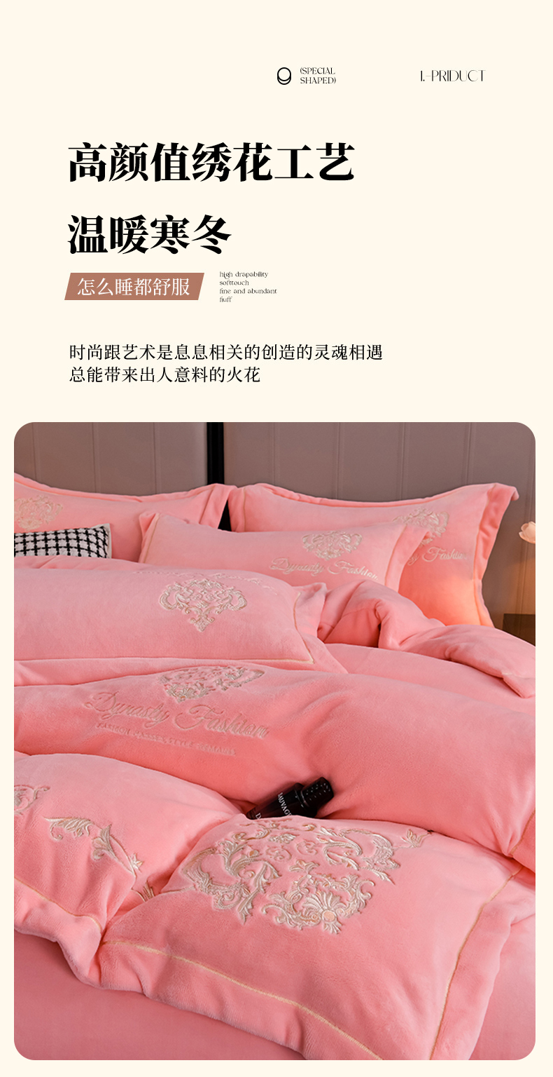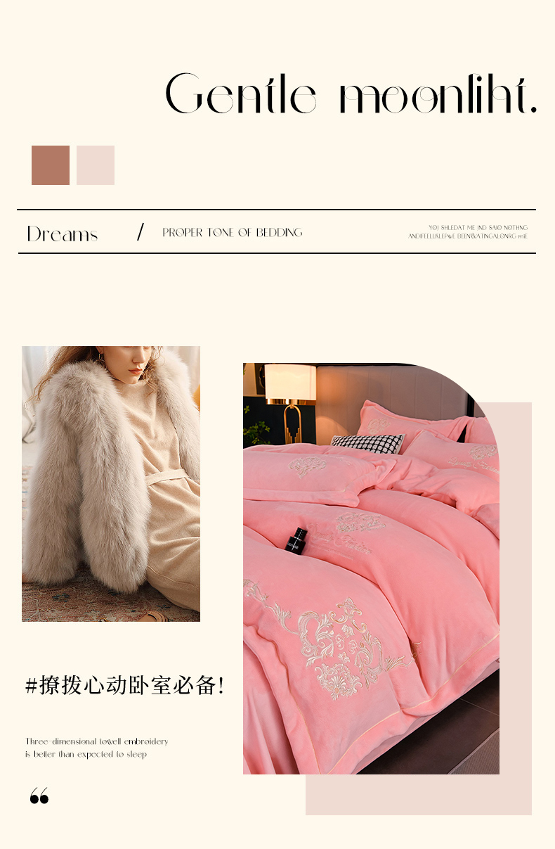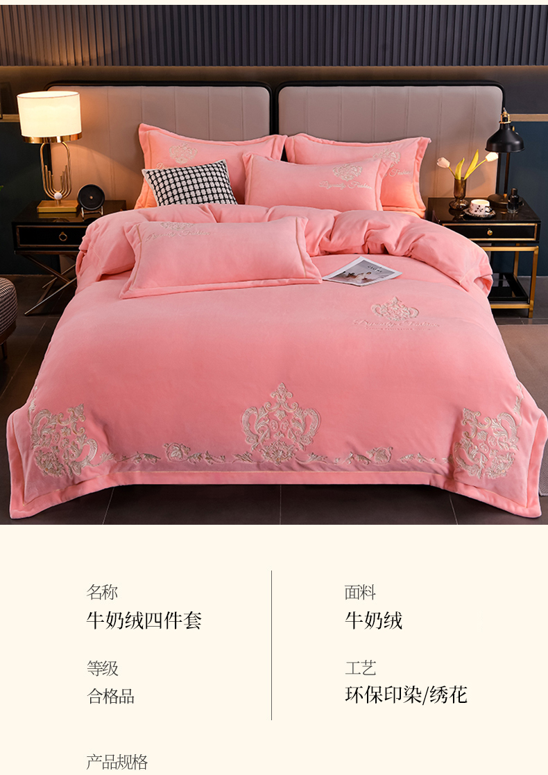 商品名称:沐妍家纺 2024新款重工刺绣绣花纯色牛奶绒四件套皇冠-粉玉