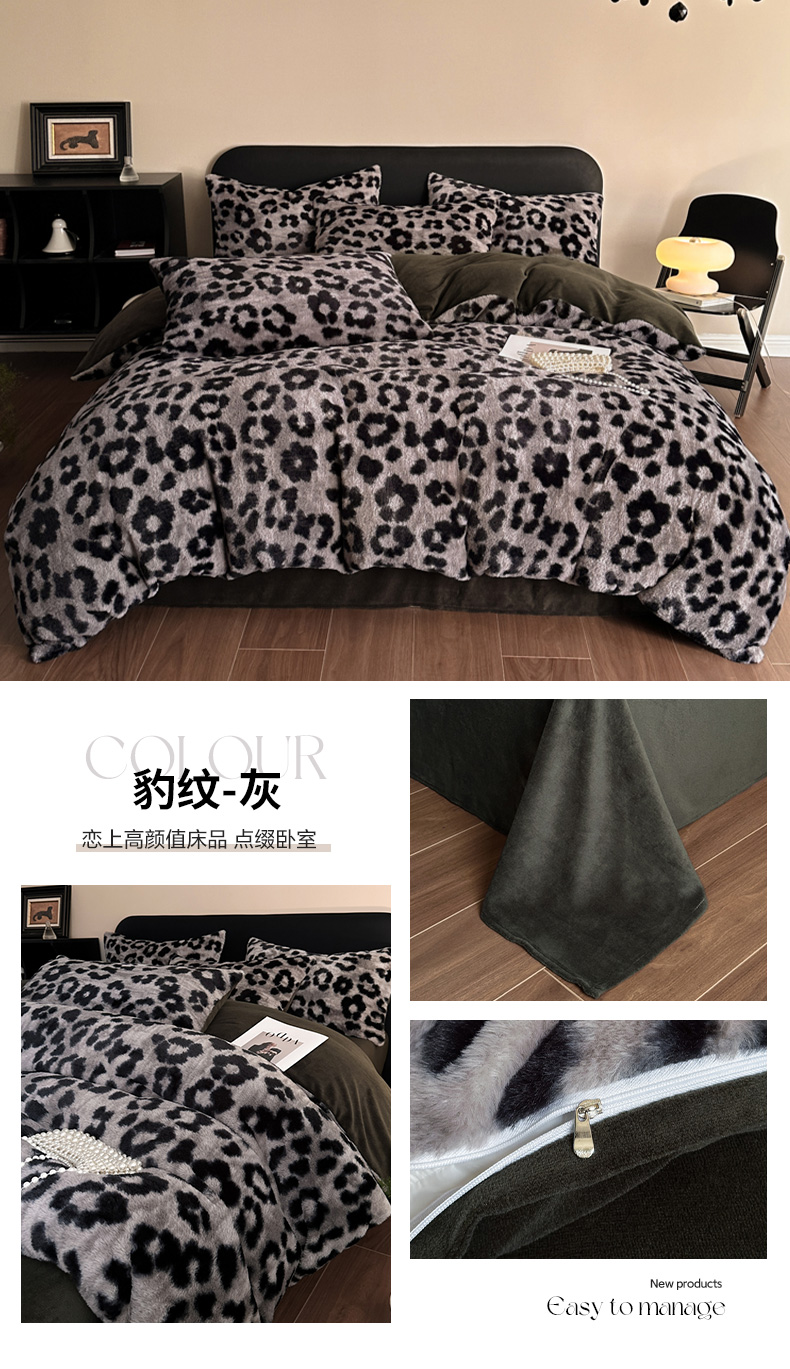 商品名称:丝印良品 2024秋冬新款丹麦兔毛绒牛奶绒四件套豹纹-灰