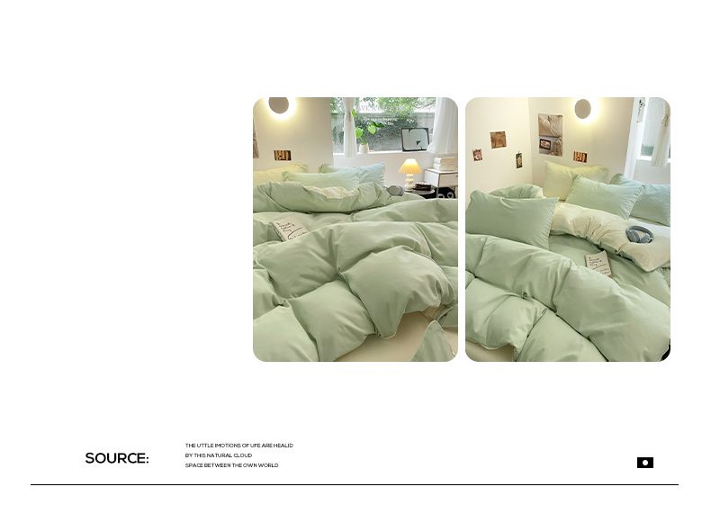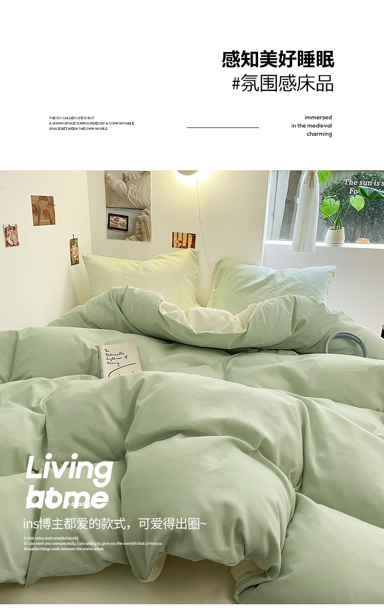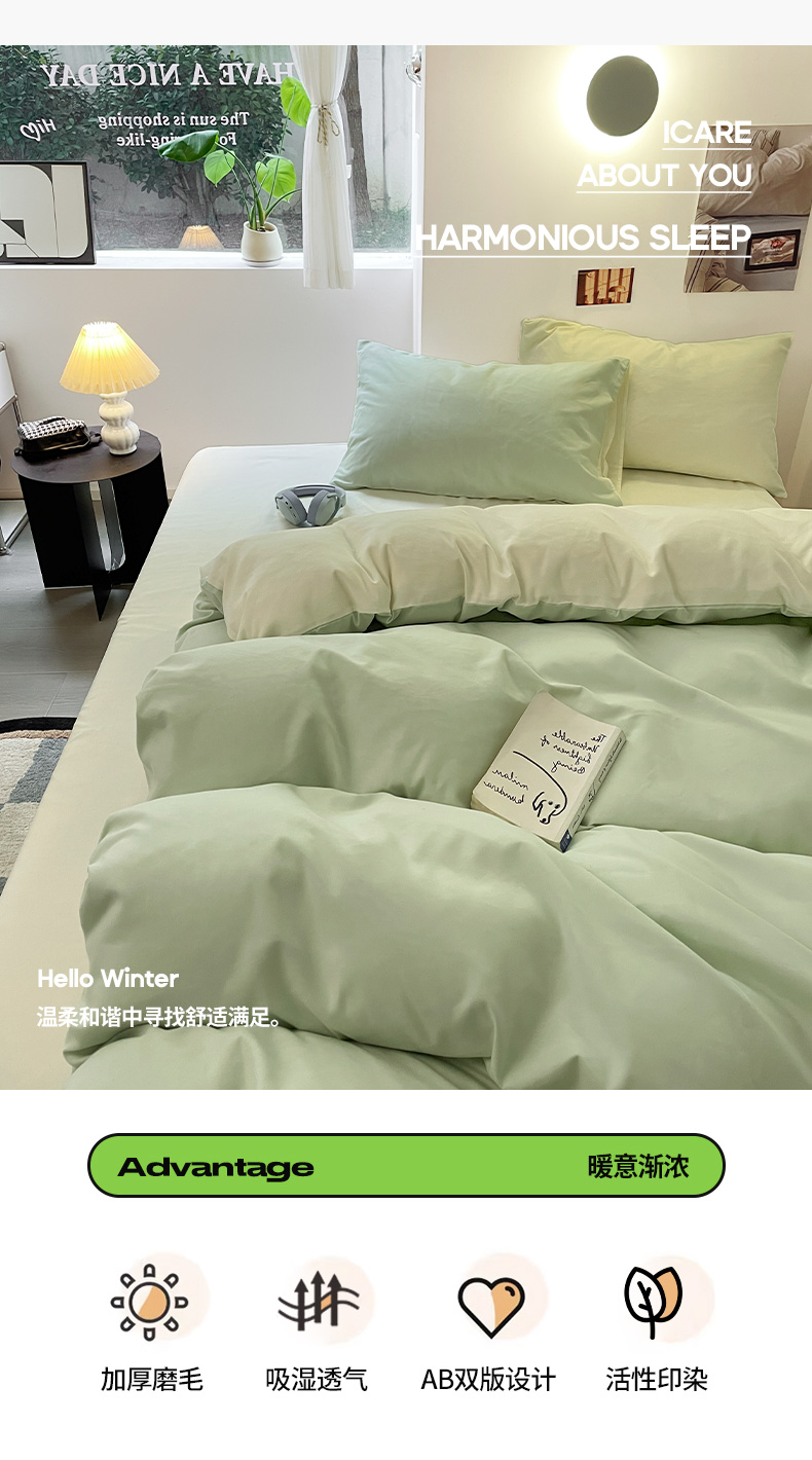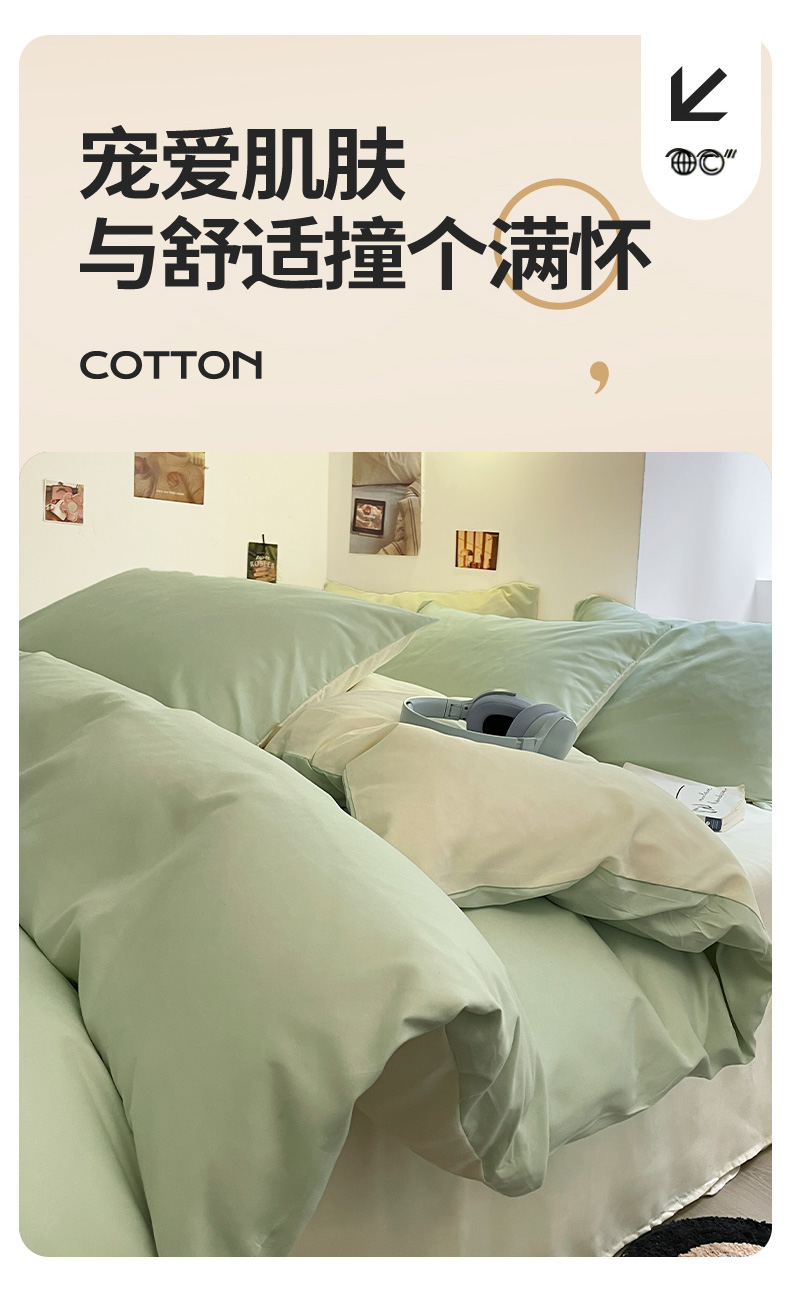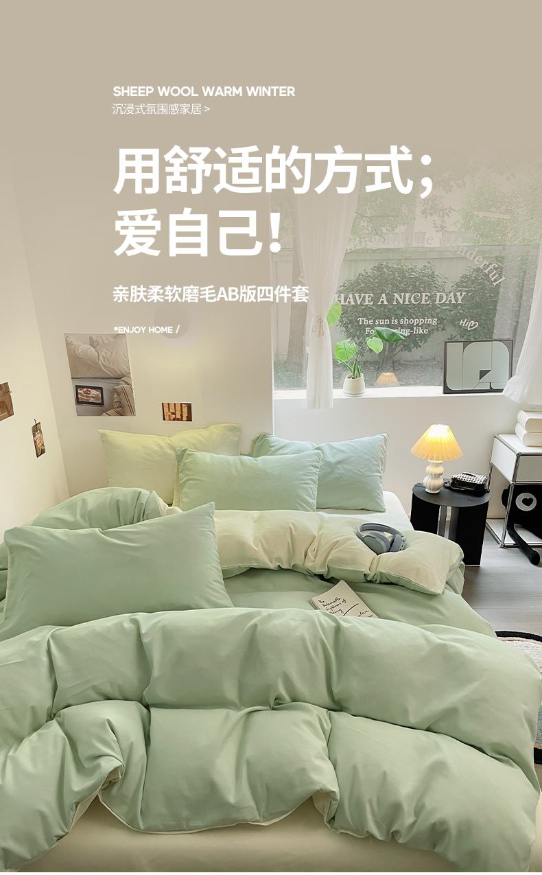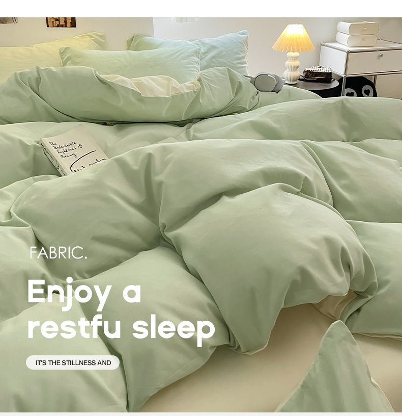 当前位置: 91家纺网 > 商品网购 > 床品套件 > 四件套 > 磨毛活性四件套 > 米粒 2024新款纯色简约双拼磨毛四件套 水绿+奶白