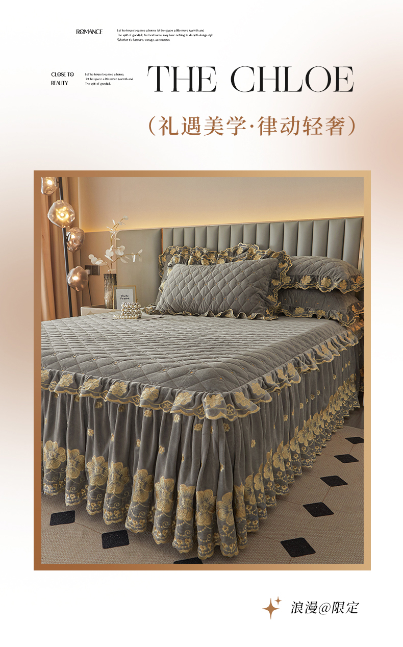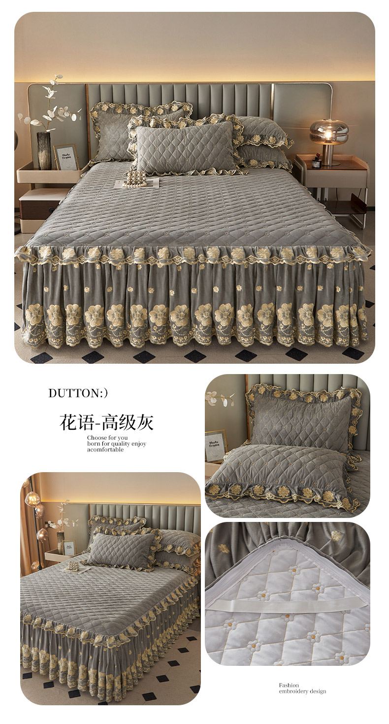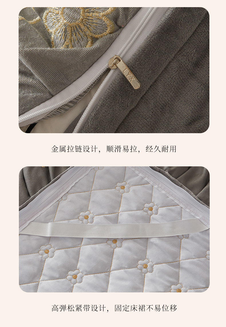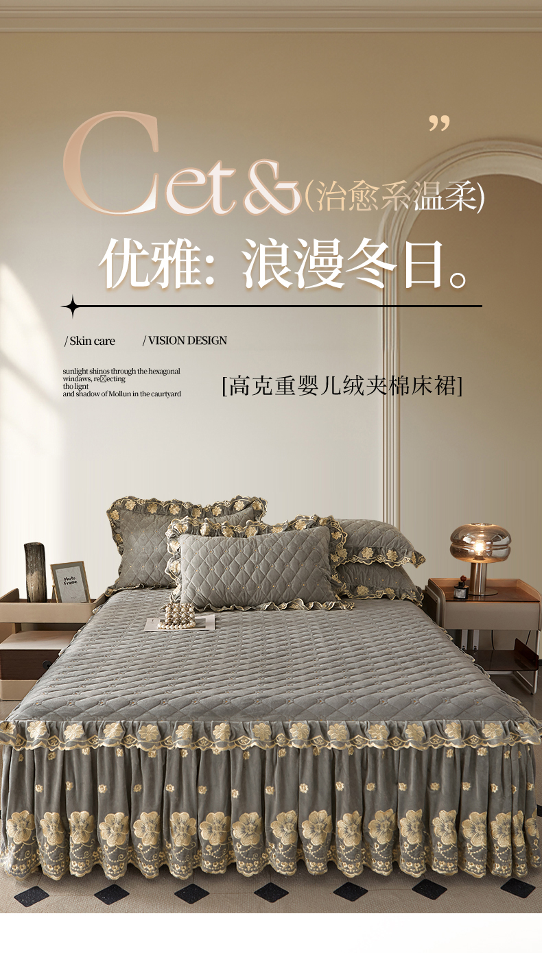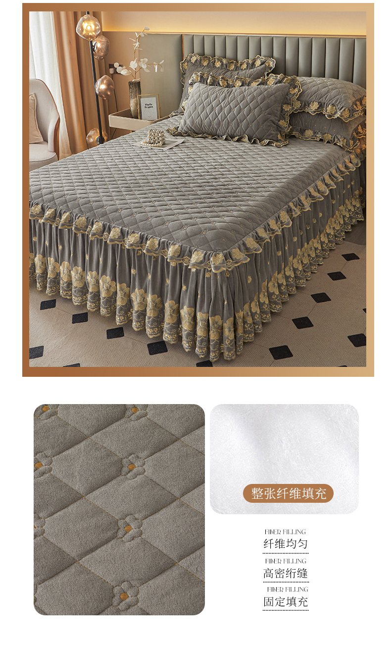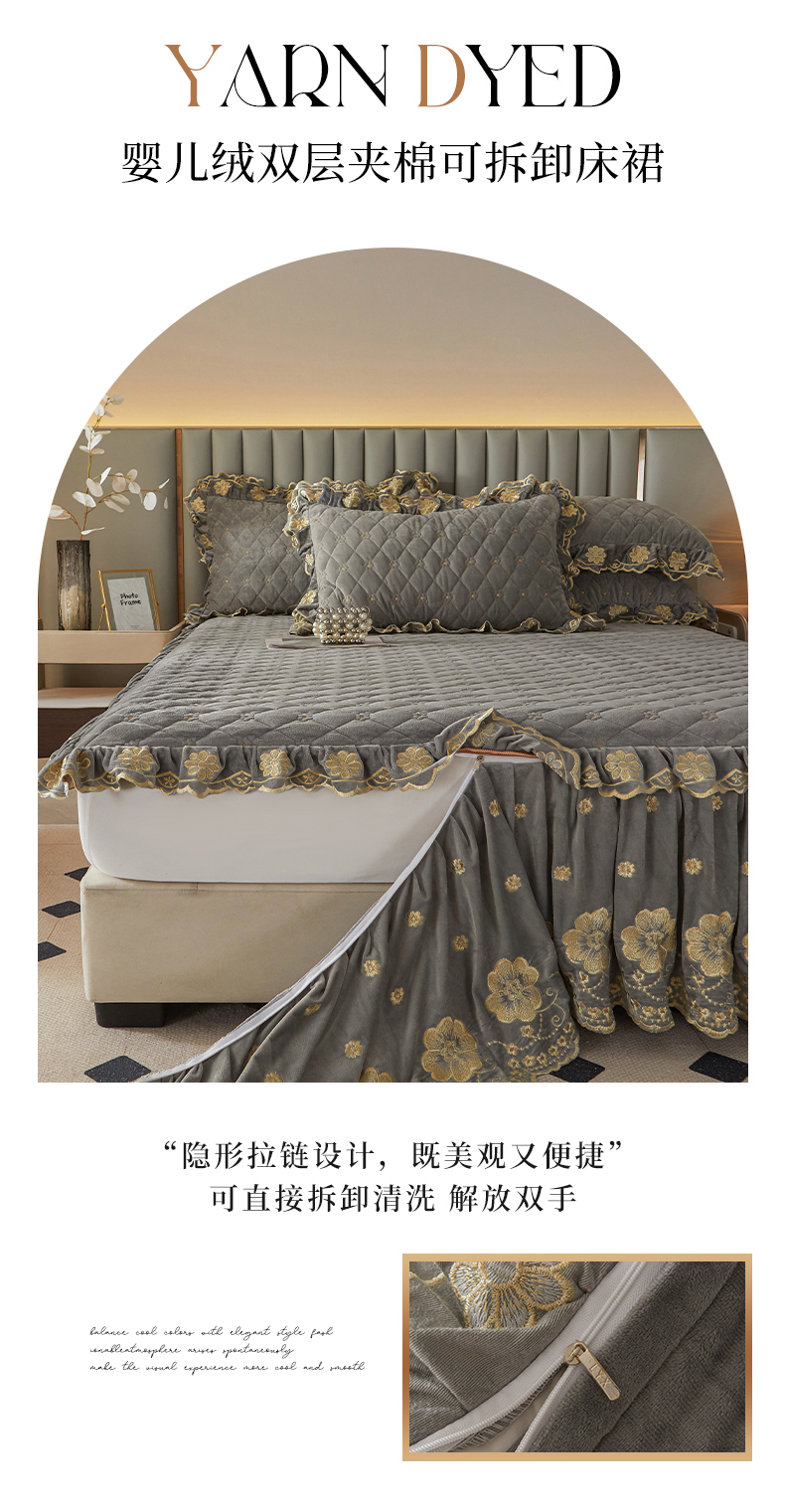• 91家纺网 家纺一手货源 找家纺 罗艺轩 2025新款婴儿绒双层夹棉可拆卸床裙-花语 花语-高级灰