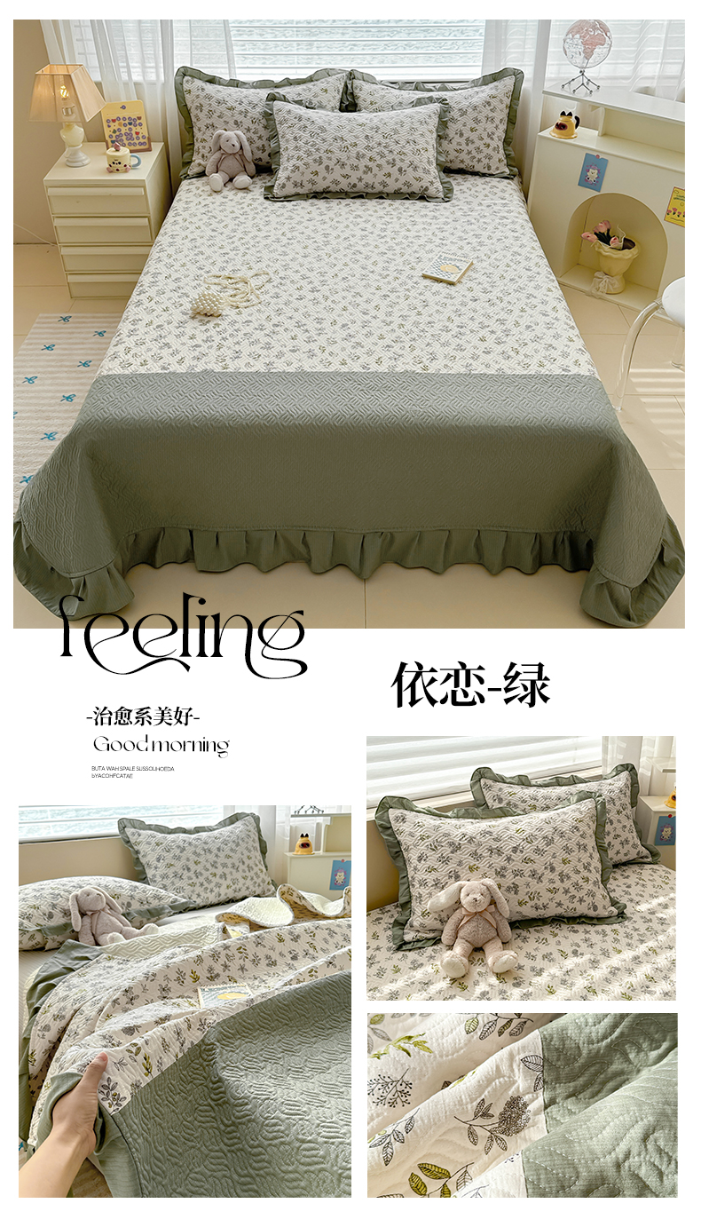 商品名称:2025新款木棉夹棉花边拼接床盖系列 依恋-绿