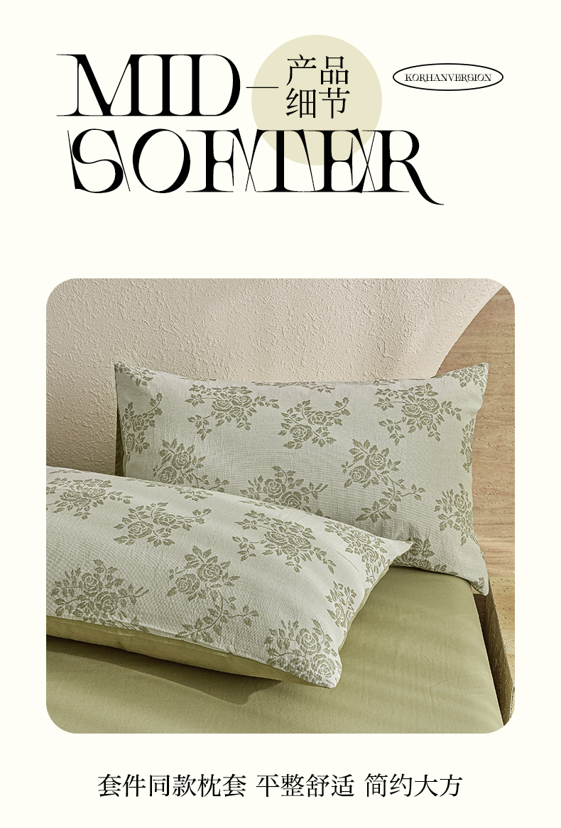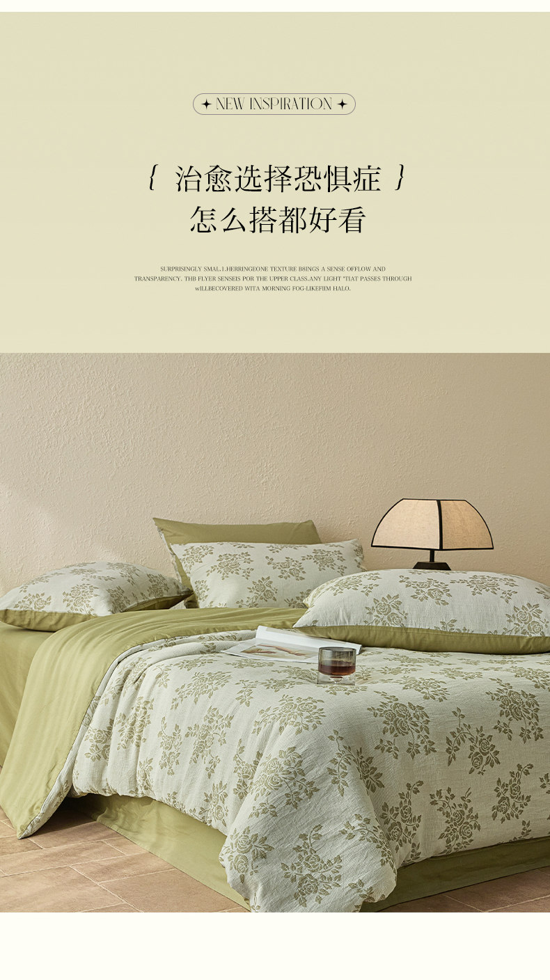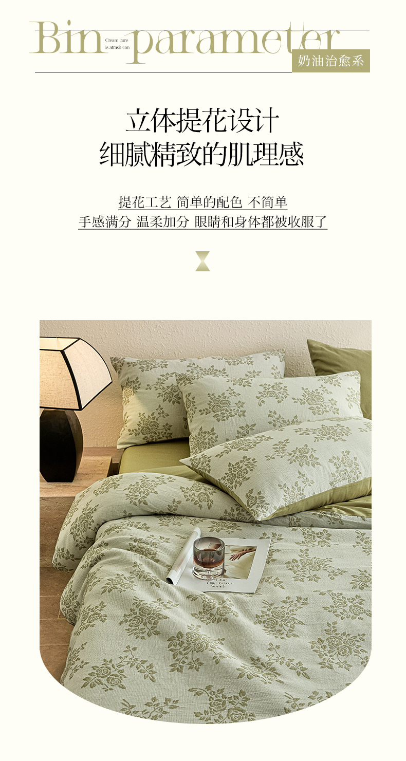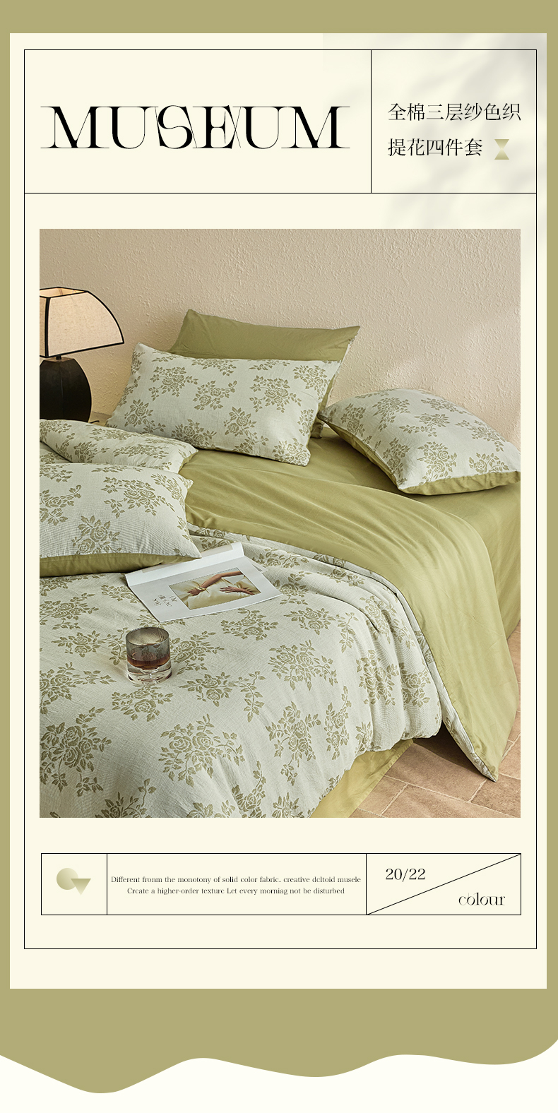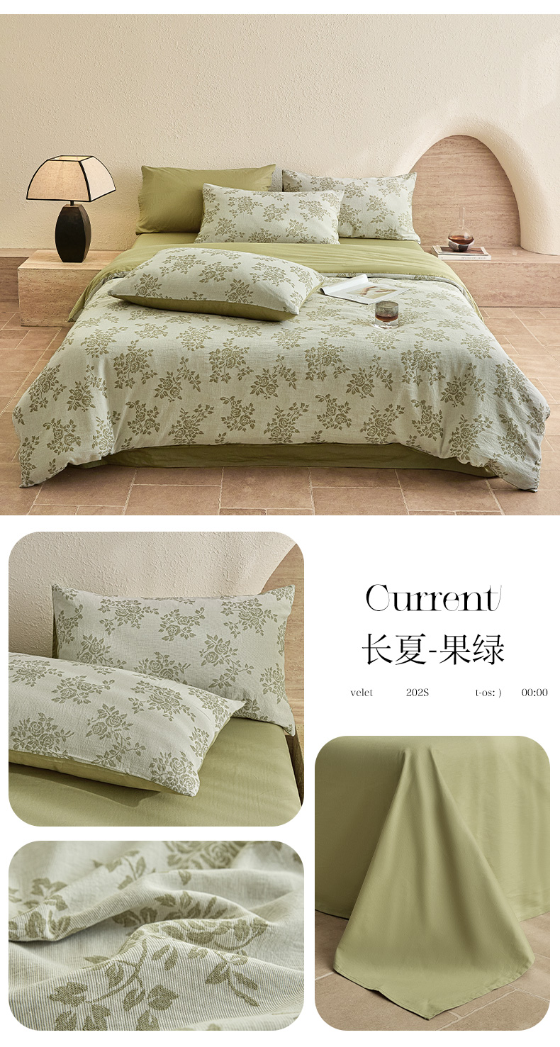 当前位置: 91家纺网 > 商品网购 > 床品套件 > 四件套 > 全棉普通四件套 > 2025新款全棉三层纱色织大提花四件套系列 长夏-果绿
