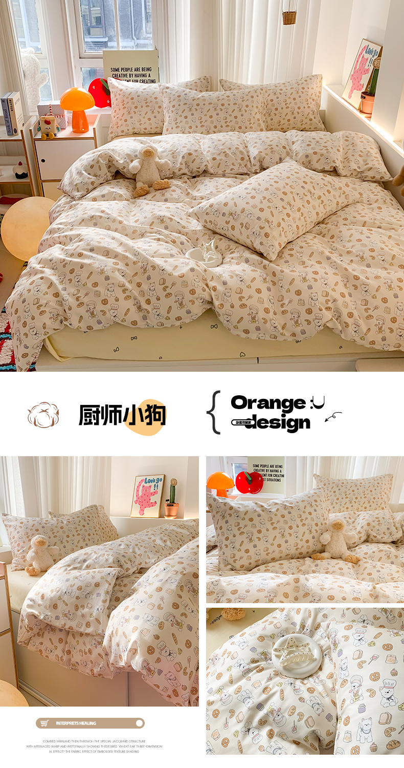 商品名称:澳萝拉 2025新款小碎花清新春夏全棉花边双层纱韩系三件套四件套 厨师小狗