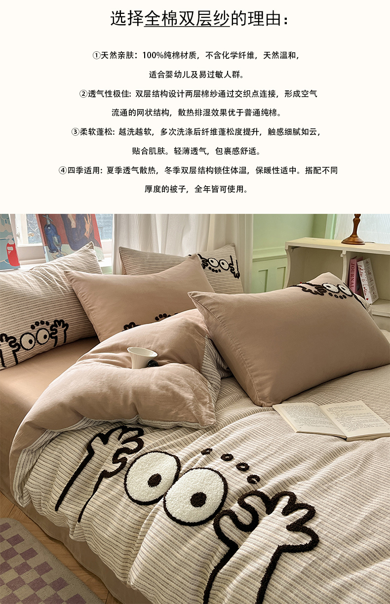 当前位置: 91家纺网 > 商品网购 > 床品套件 > 四件套 > 双层纱四件套 > (总)羚羊语家纺 2025新款A类全棉双层纱毛巾绣四件套100纯棉多层纱高克重小清新印花卡通皱皱纱三件套【含手提袋】