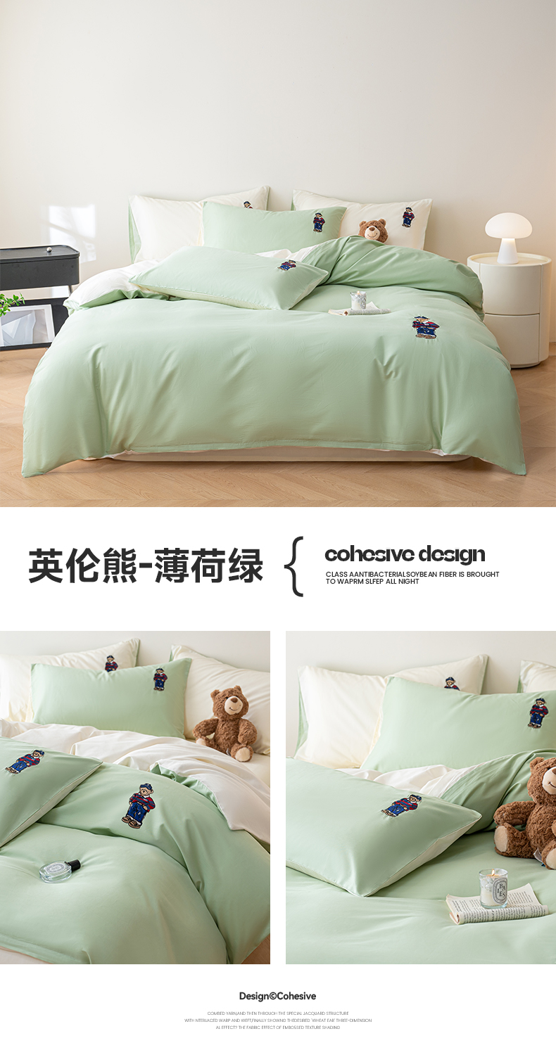 商品名称:澳梵家居2025新款A类裸睡级全棉刺绣四件套-英伦小熊 英伦熊-薄荷绿