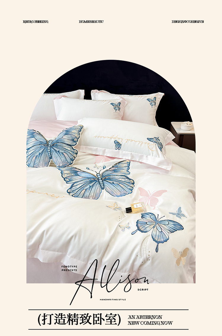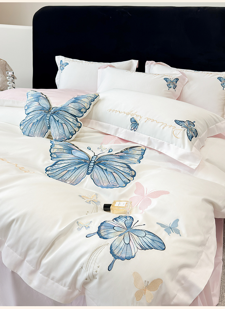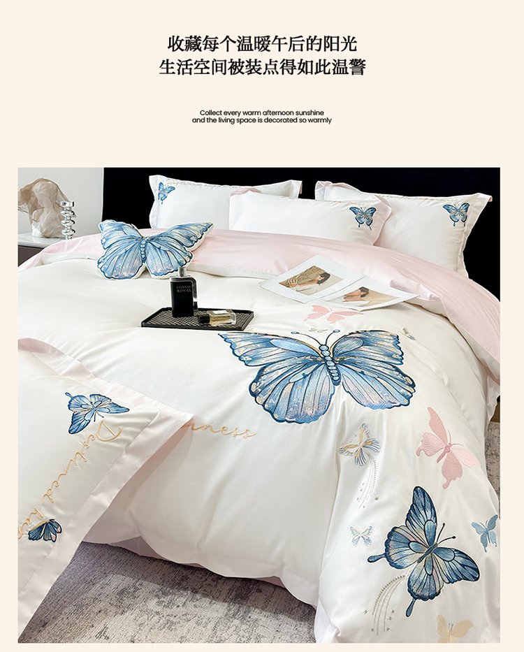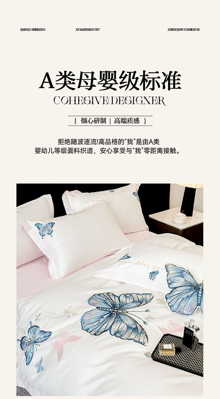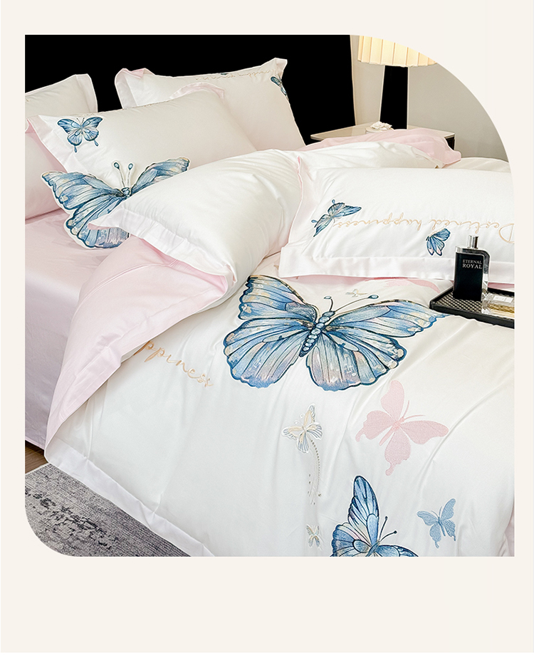 当前位置: 91家纺网 > 商品网购 > 床品套件 > 四件套 > 长绒棉四件套 > 春夏新款50*50S贡缎长绒棉刺绣四件套纯棉床单床笠高档礼盒装 白拼粉-绮梦蝶-贡缎长绒棉