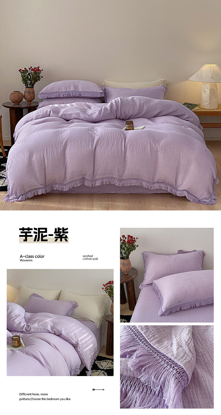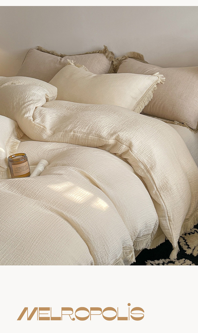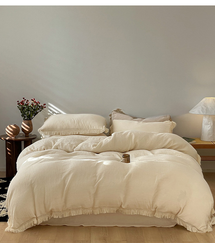 2025【A类纯棉皱皱纱流苏四件套】日式无印全棉双层纱皱皱纱良品流苏款四件套床品被套纯色A类件套
