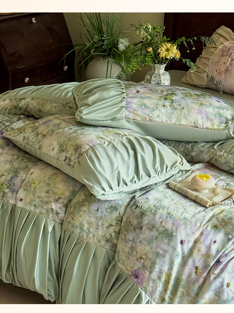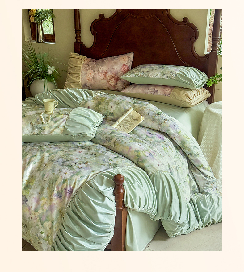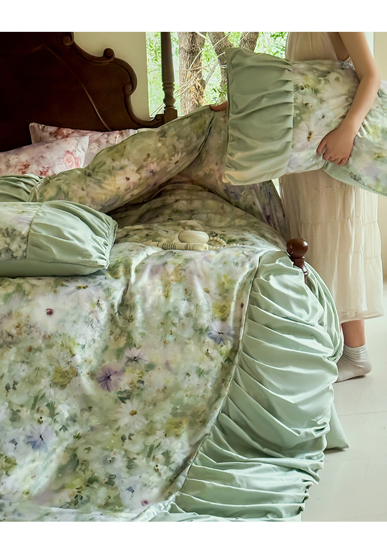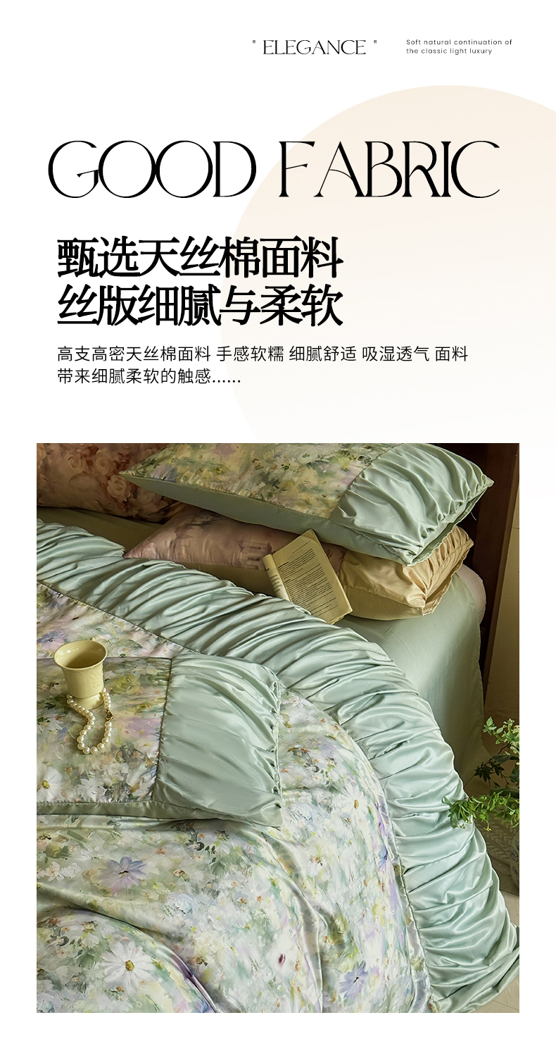 商品名称:艾米家居 2025新款A类天丝棉冰丝法式花边褶皱款四件套 绿野仙踪褶皱款
