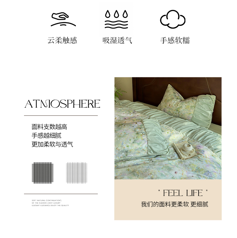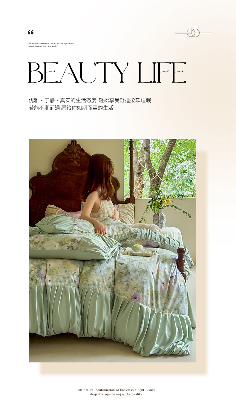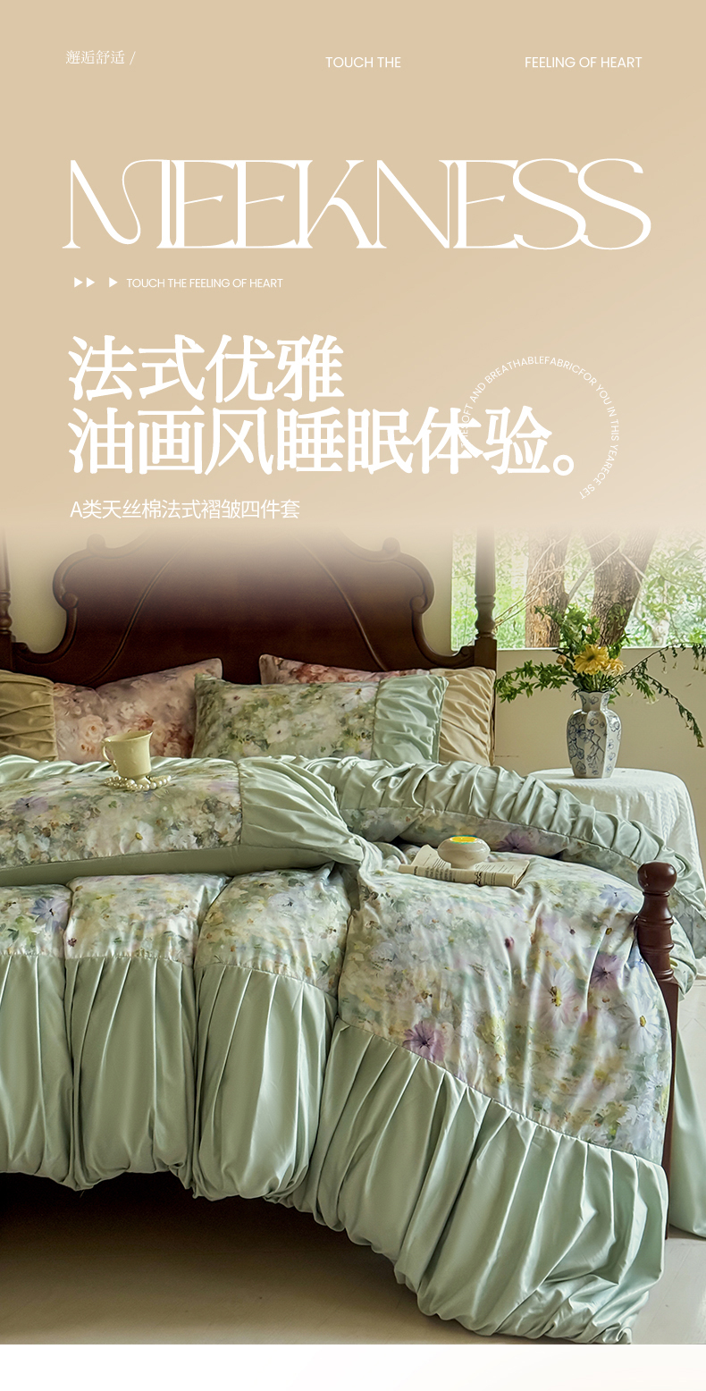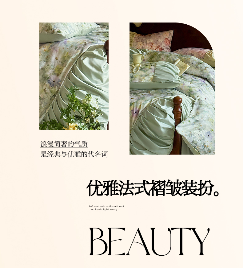 商品名称:艾米家居 2025新款A类天丝棉冰丝法式花边褶皱款四件套 绿野仙踪褶皱款