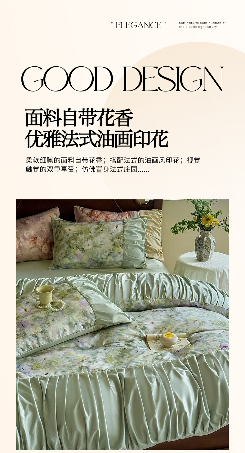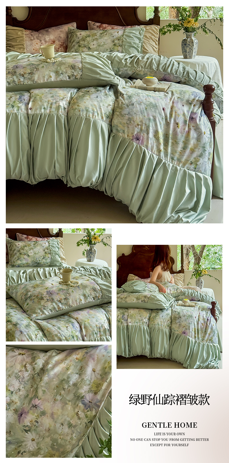 艾米家居 2025新款A类天丝棉冰丝法式花边褶皱款四件套 绿野仙踪褶皱款