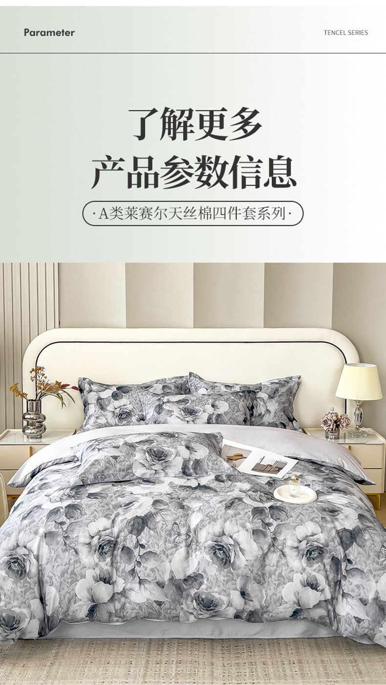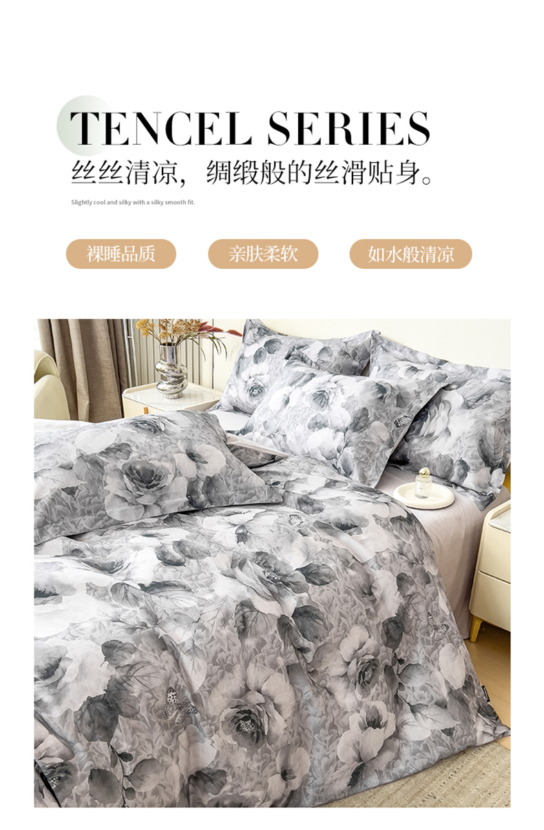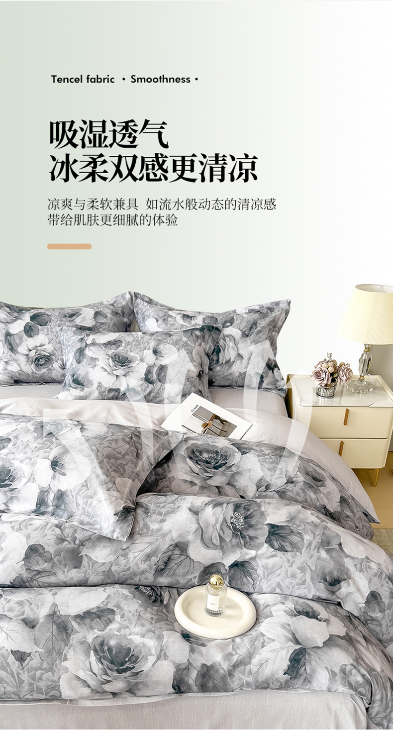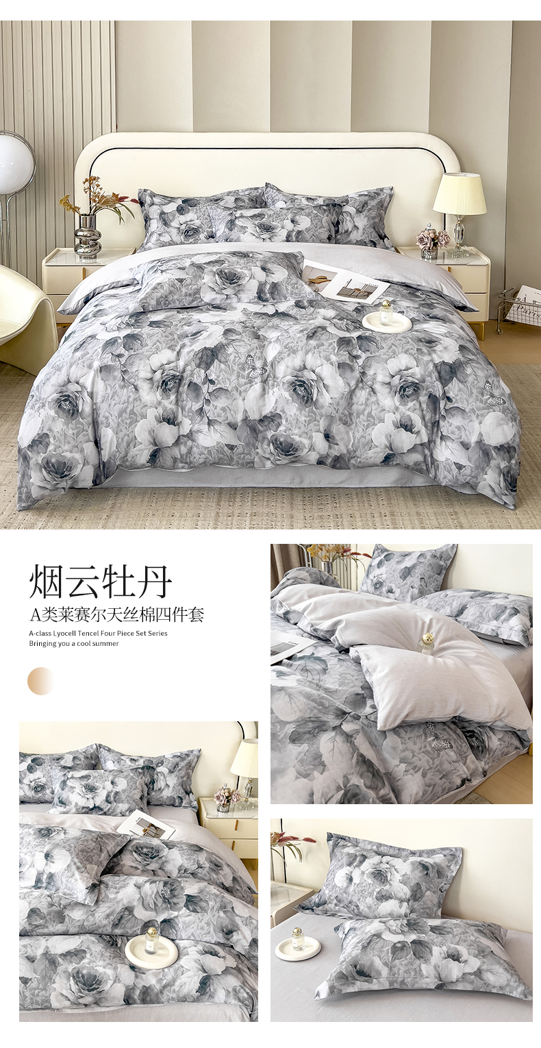 芃成家纺 2025新款A类莱赛尔天丝棉四件套 烟云牡丹