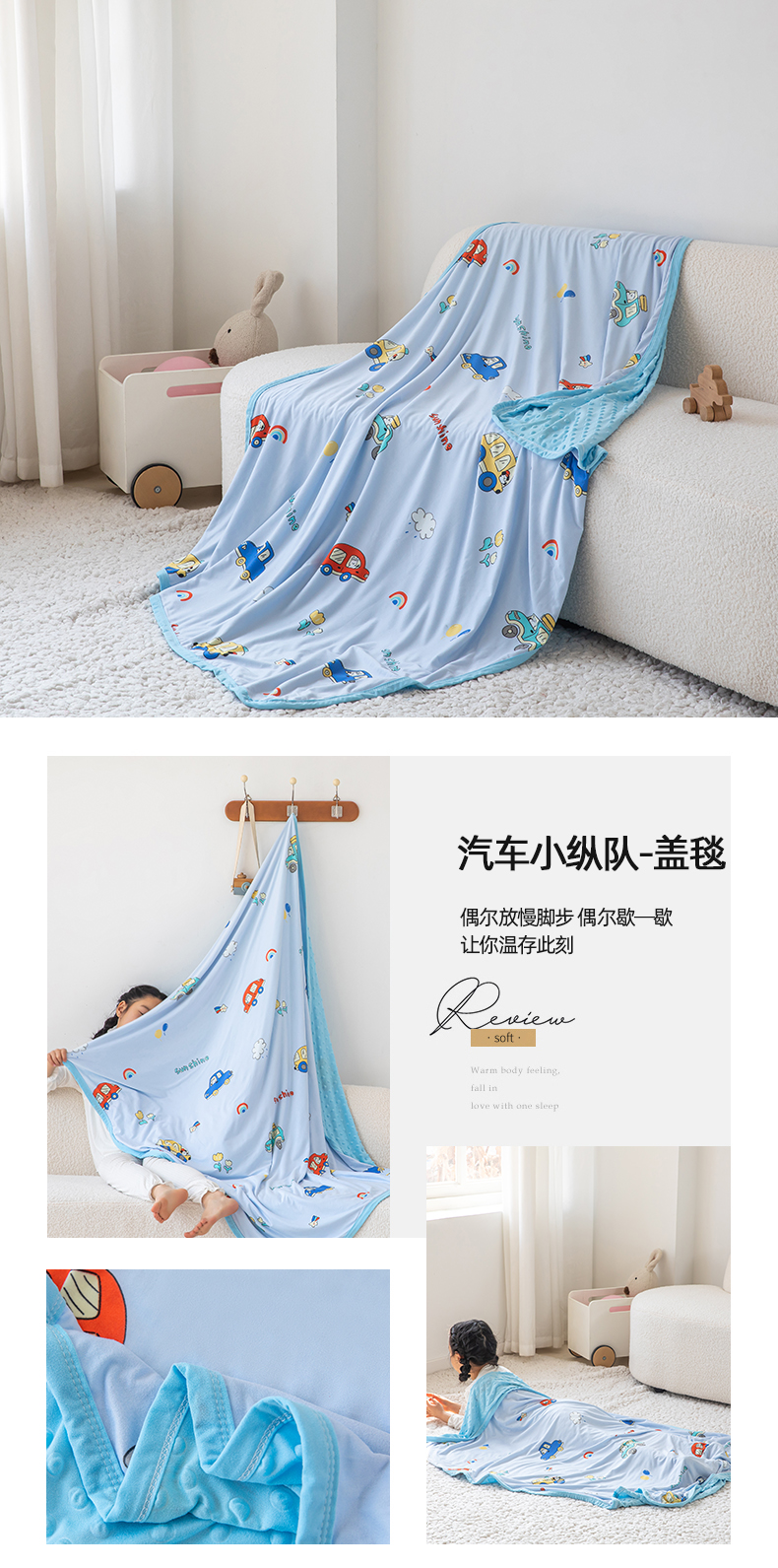 商品名称:艾佳宝贝 2025新款A类针织豆豆儿童多功能宿舍午睡安抚盖毯 汽车小纵队-盖毯