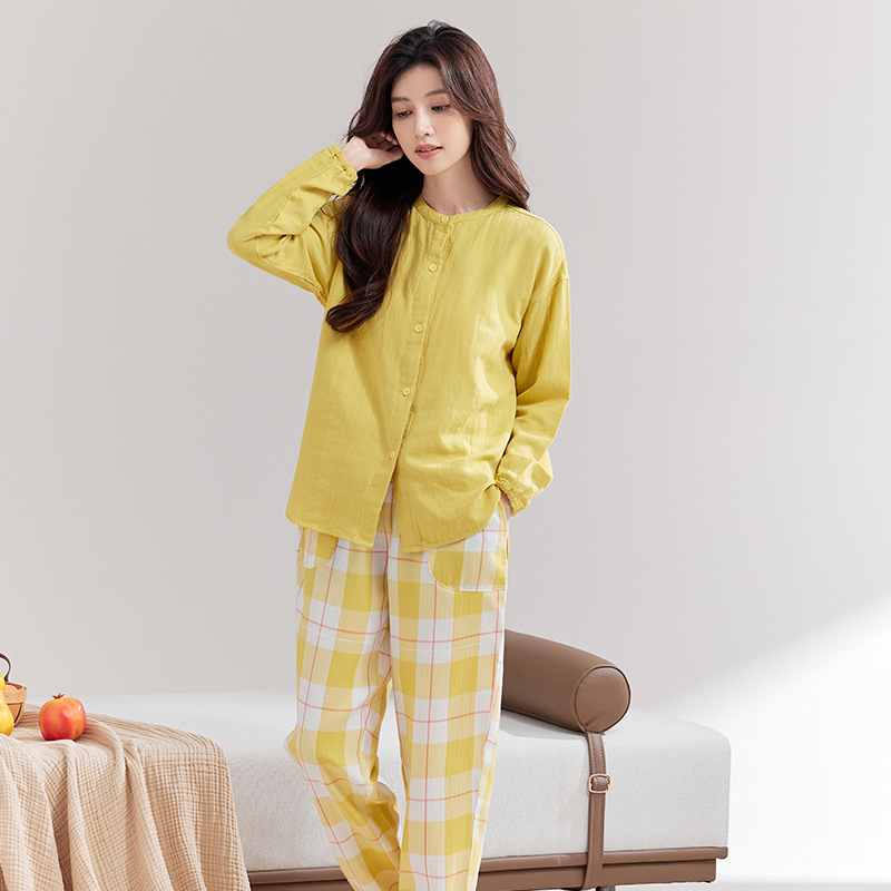 【女士双层纱睡裤】日式无印女士双层纱睡裤良品全棉家居服睡衣裤纯色格纹休闲单长裤,红色格子,黄色格子,紫色格子,绿色格子,紫色纯色,红色纯色,黄色纯色,绿色纯色