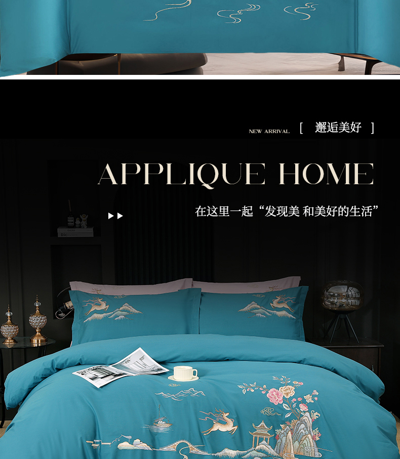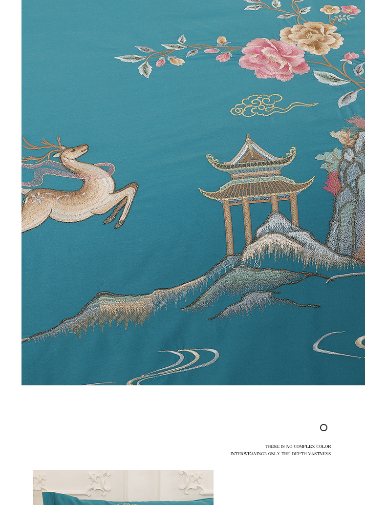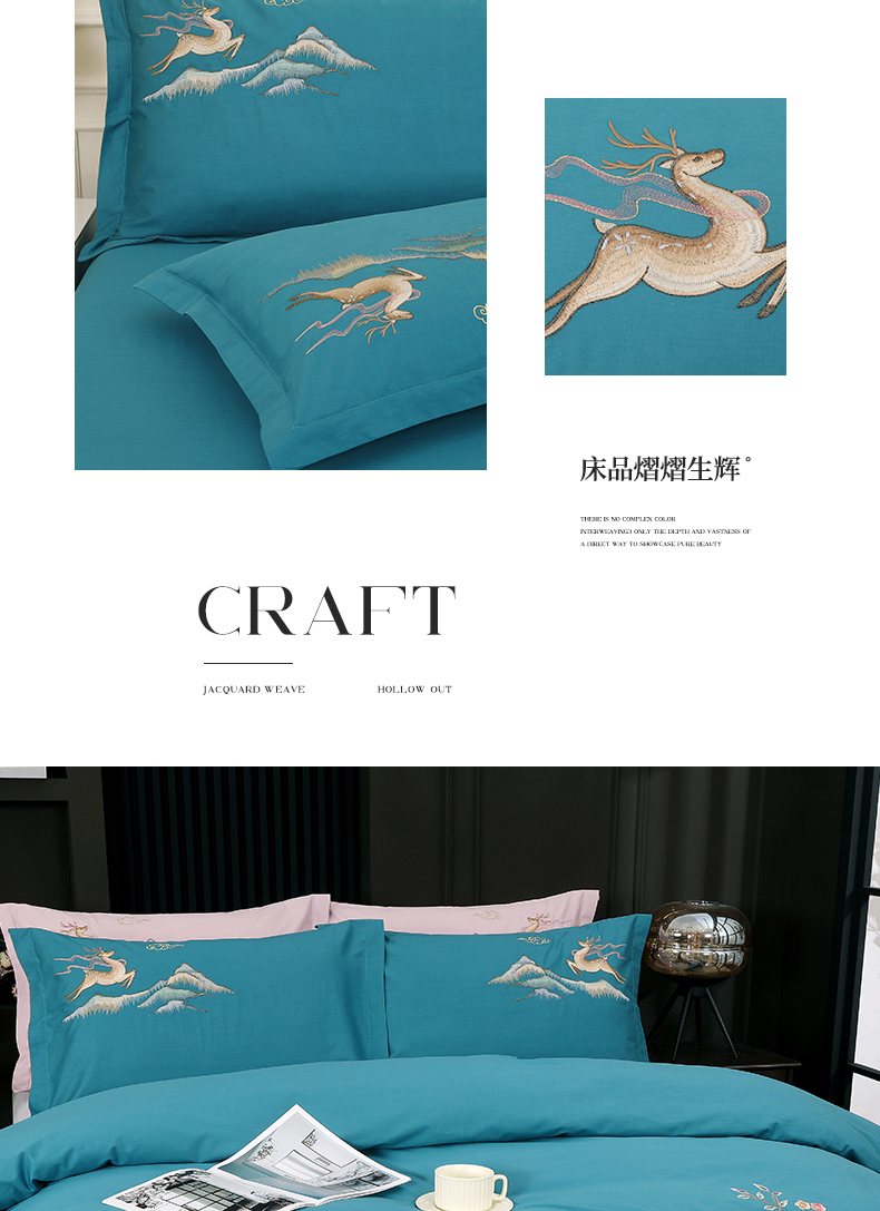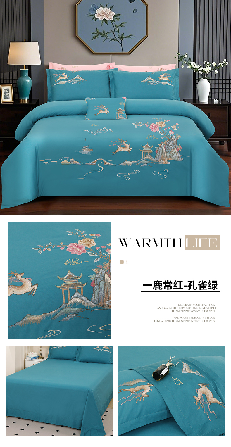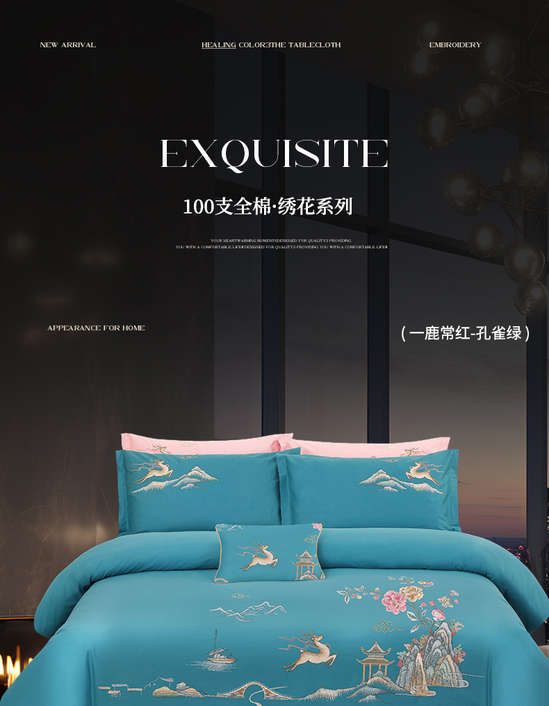 浩情国际婚庆供货中心 2026新款100支全棉高端刺绣四件套一鹿常红系列 一鹿常红-孔雀绿