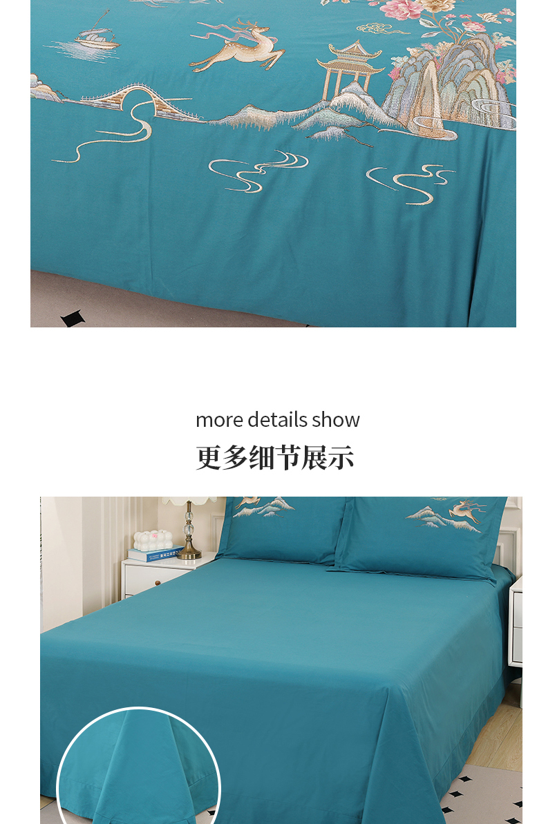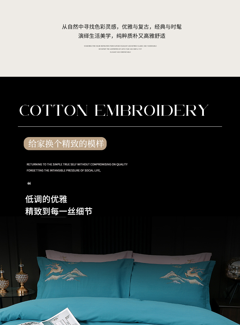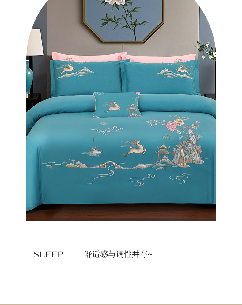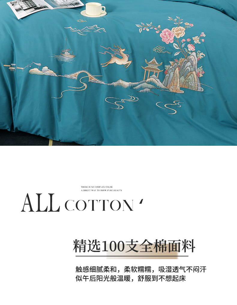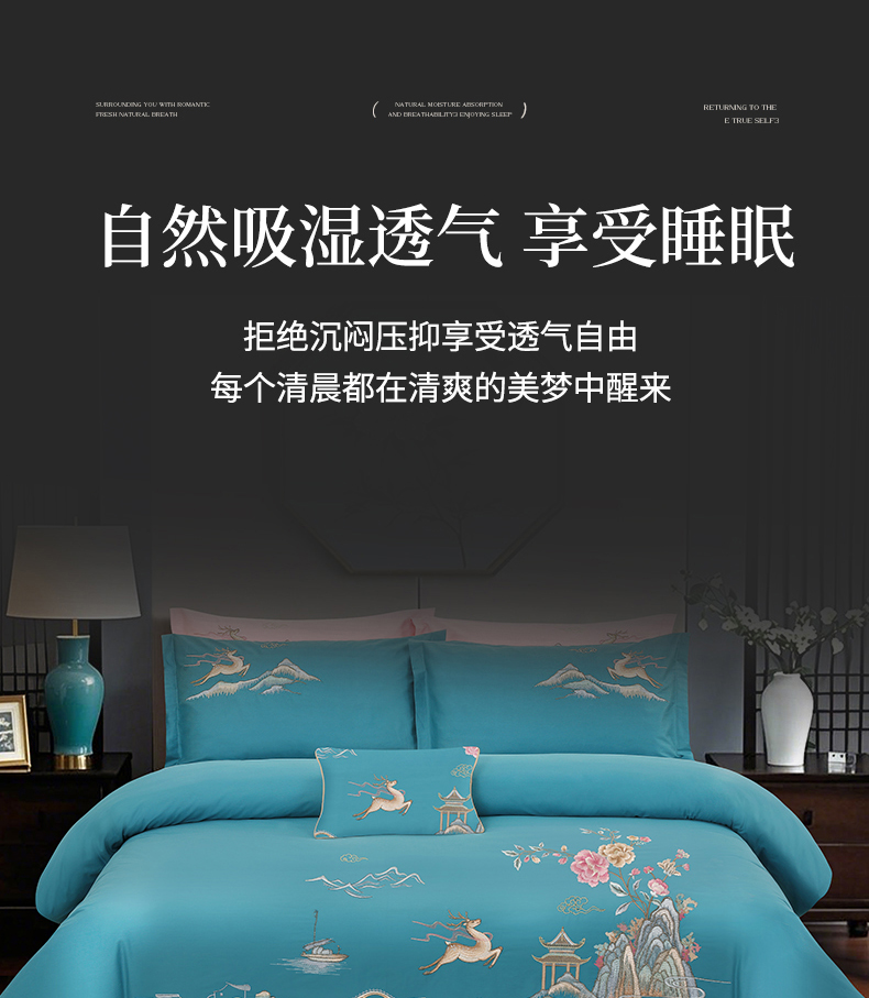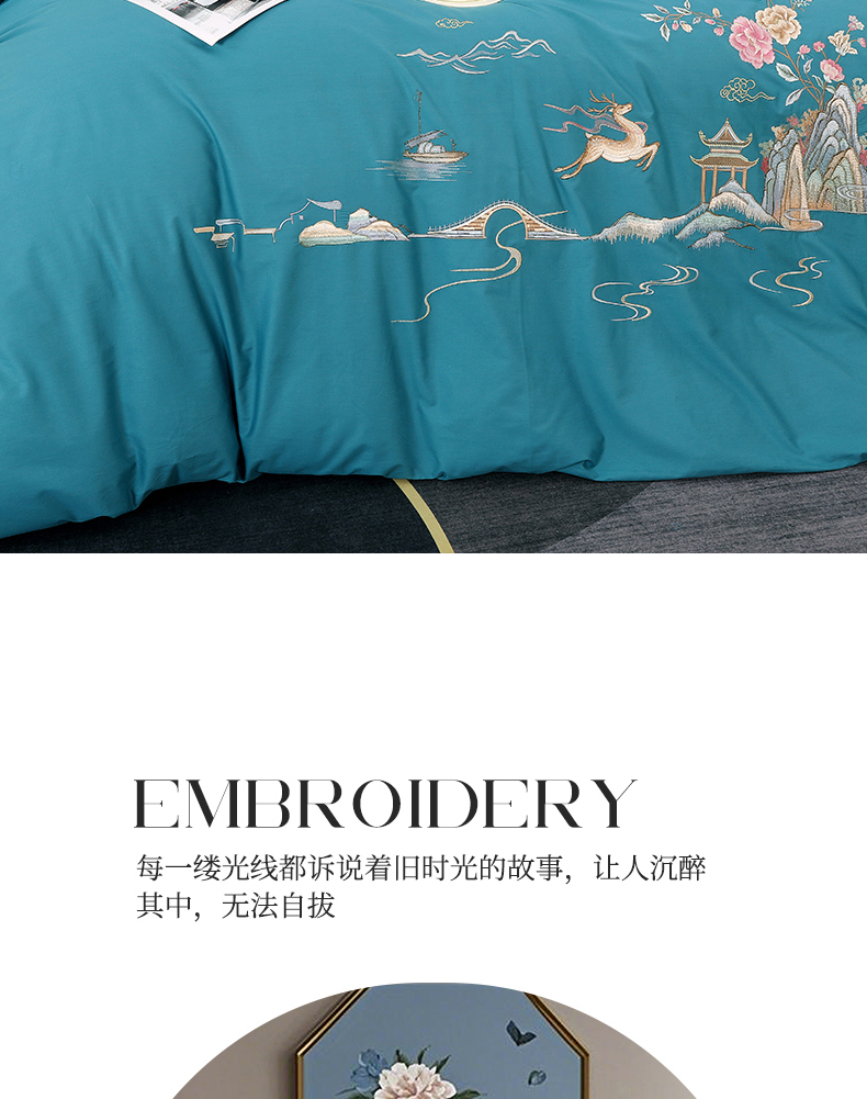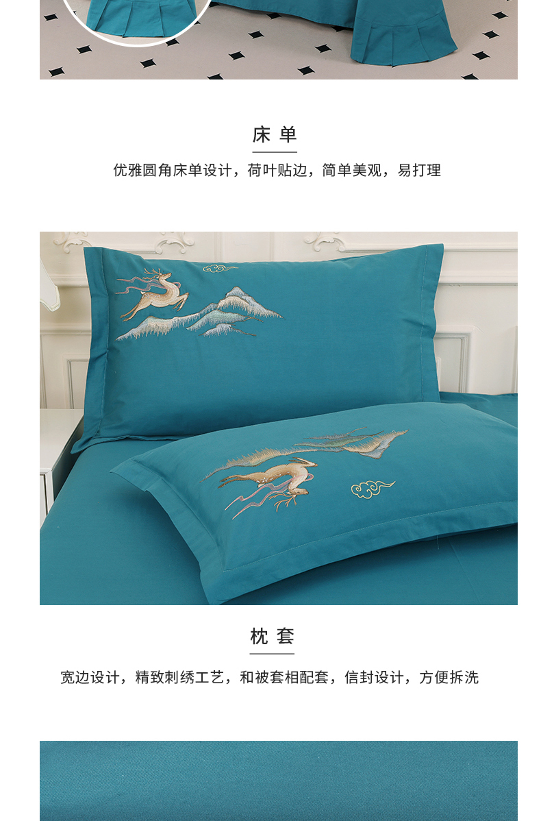 商品名称:浩情国际婚庆供货中心 2026新款100支全棉高端刺绣四件套一鹿常红系列 一鹿常红-孔雀绿