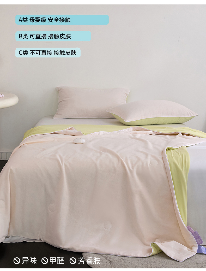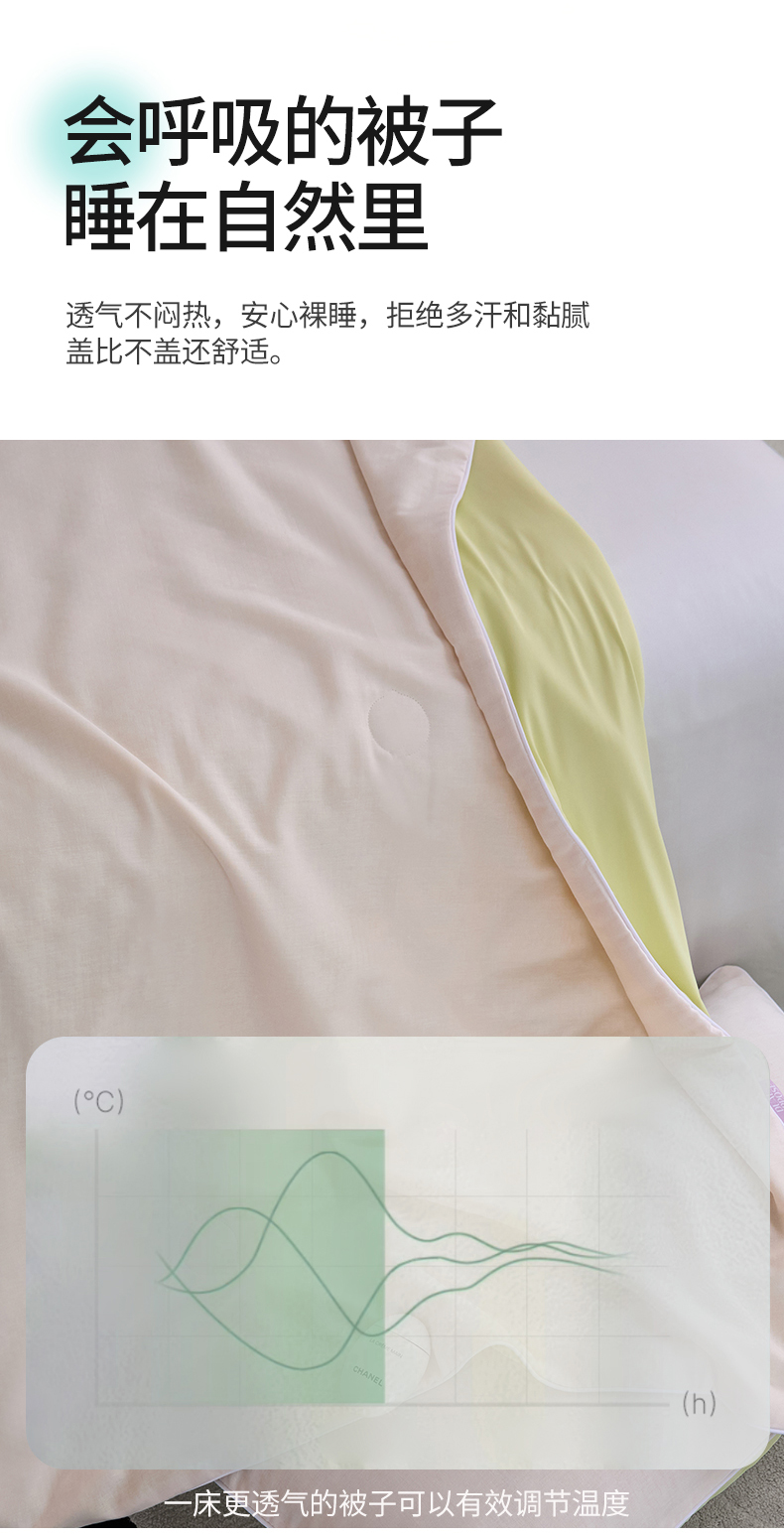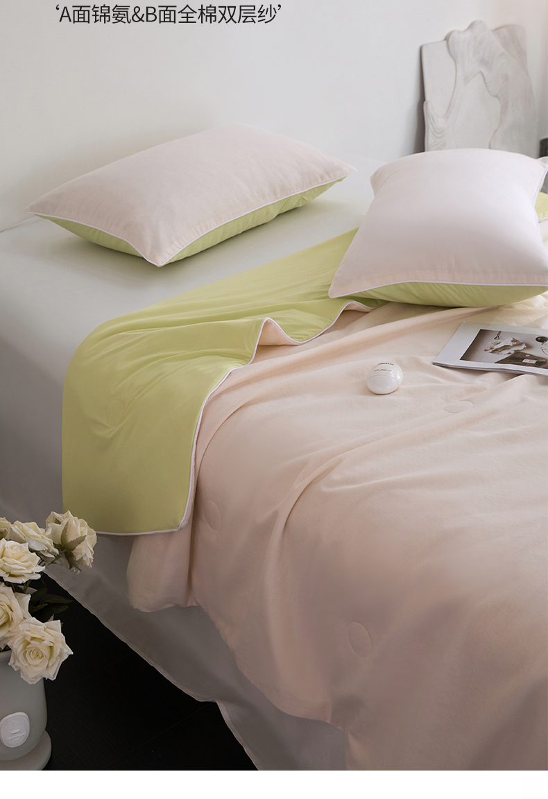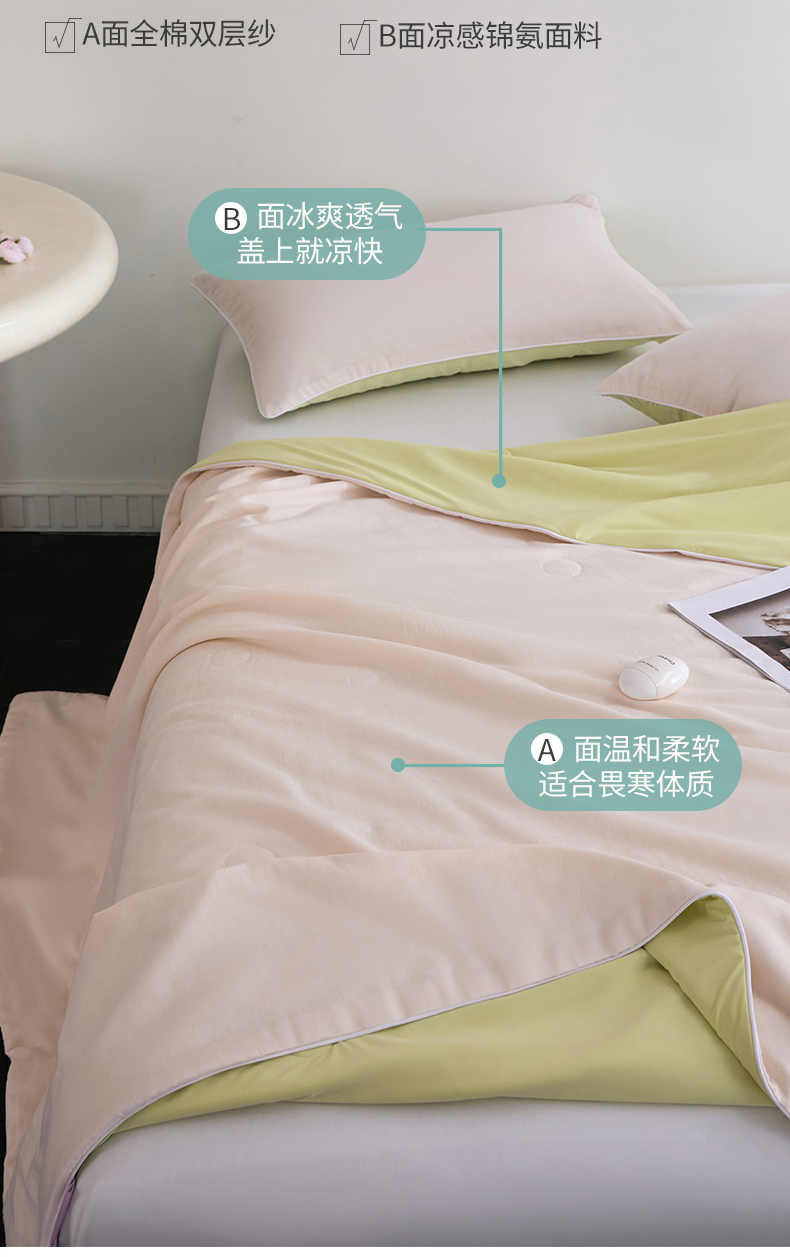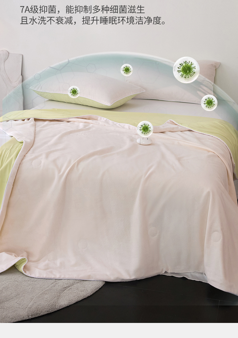 商品名称:头等舱 2025新款锦氨&全棉双层纱一被两用A类20大豆7A抗菌夏被(配礼盒) 奶白明绿