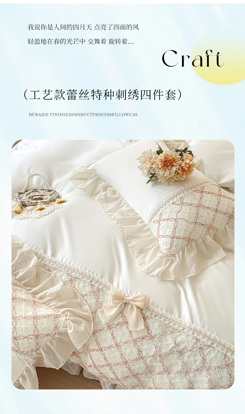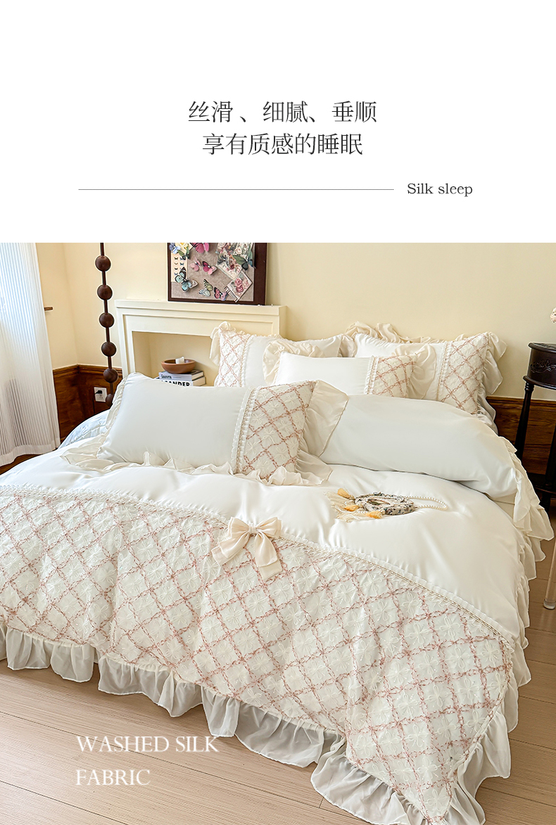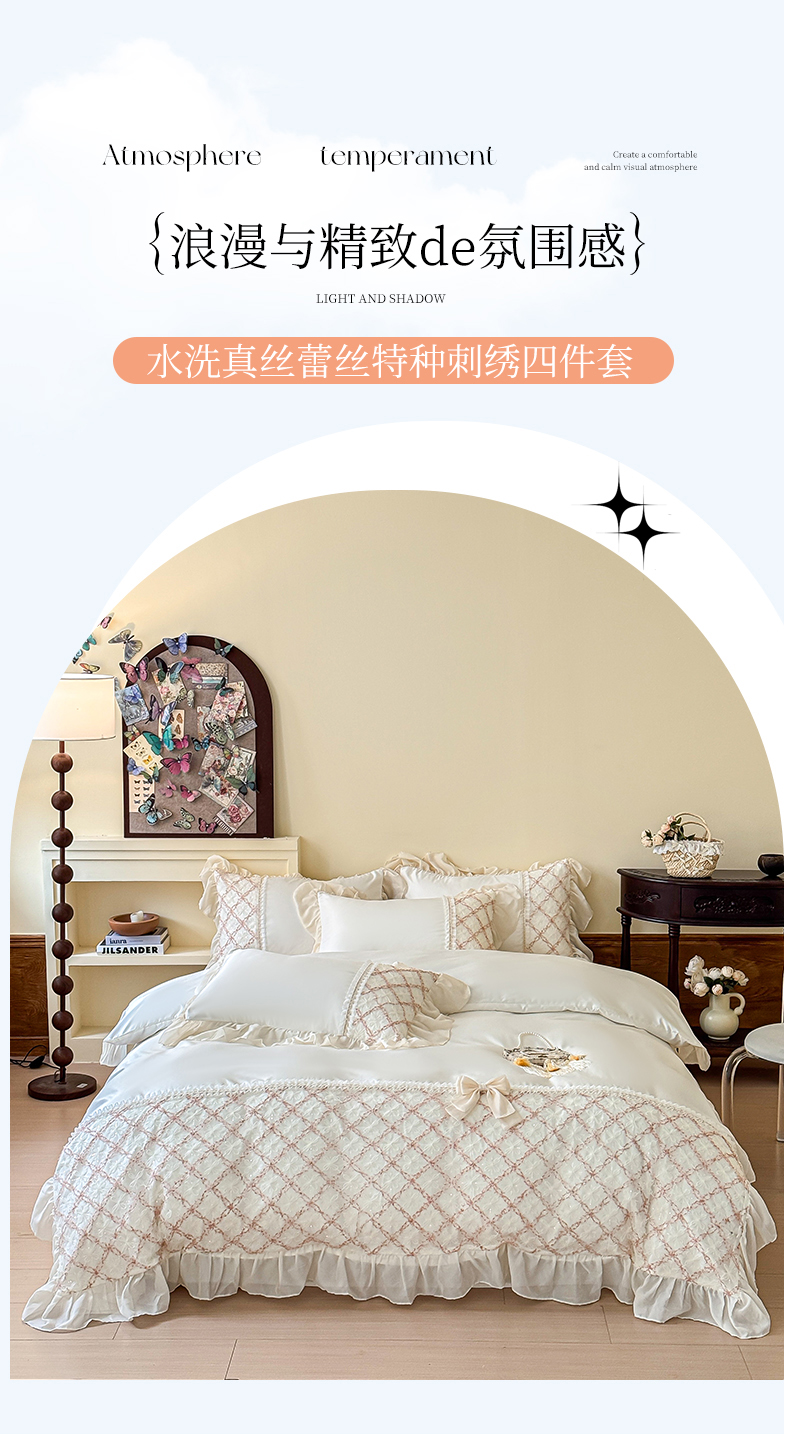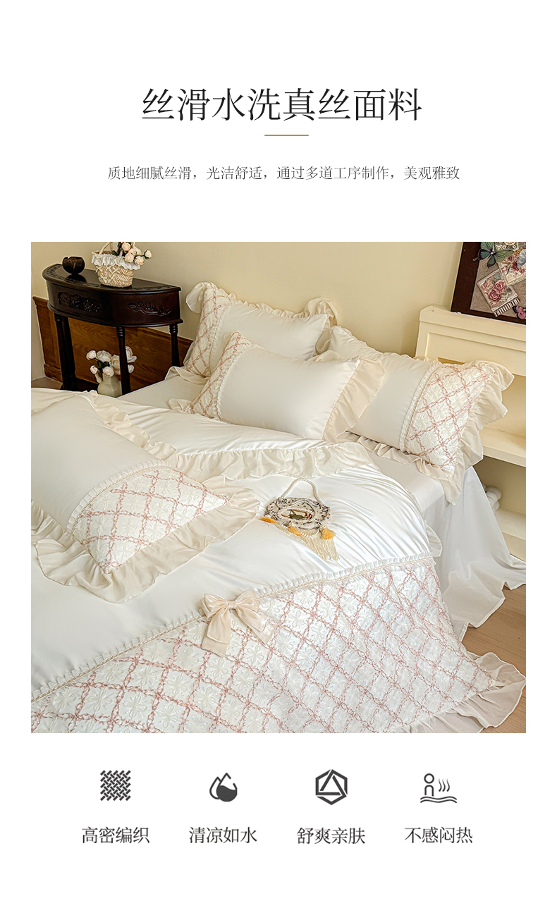 (总)凯美家居 2025新款水洗真丝蕾丝刺绣四件套,爱丽莎 浅粉,爱丽莎 奶白,爱丽莎 浅蓝,爱丽莎 浅紫,爱丽莎 香槟