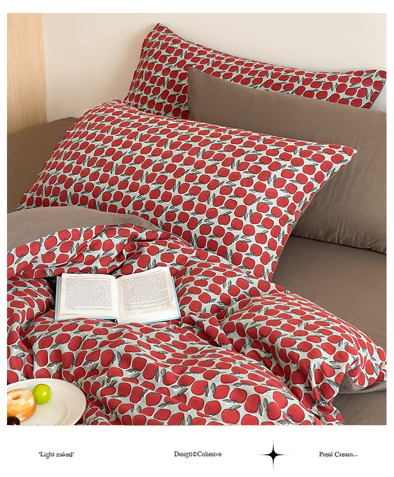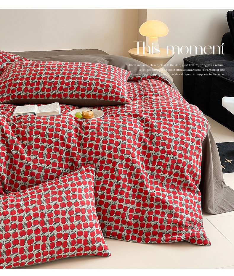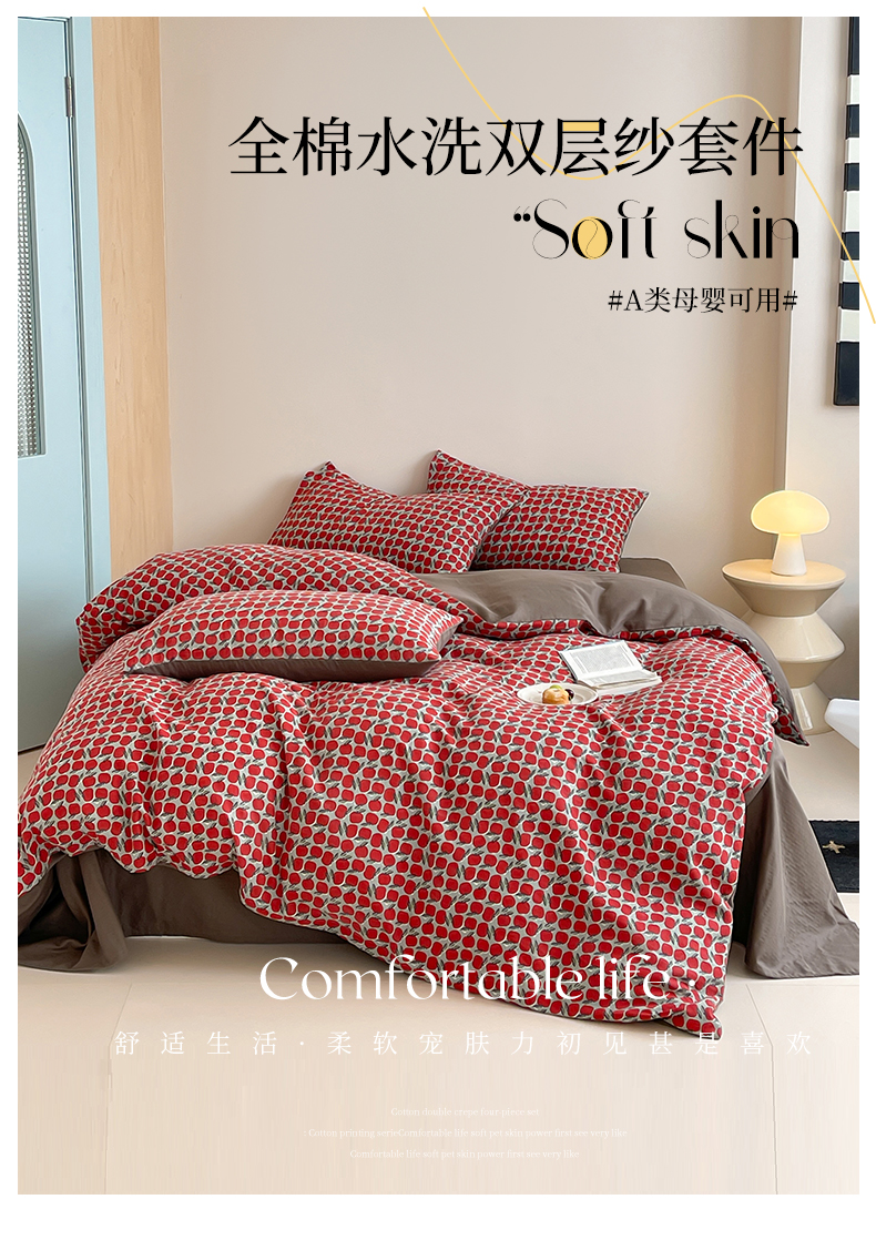 萝莉家纺 2025新款全棉复古美式风水洗双层纱印花四件套 红苹果