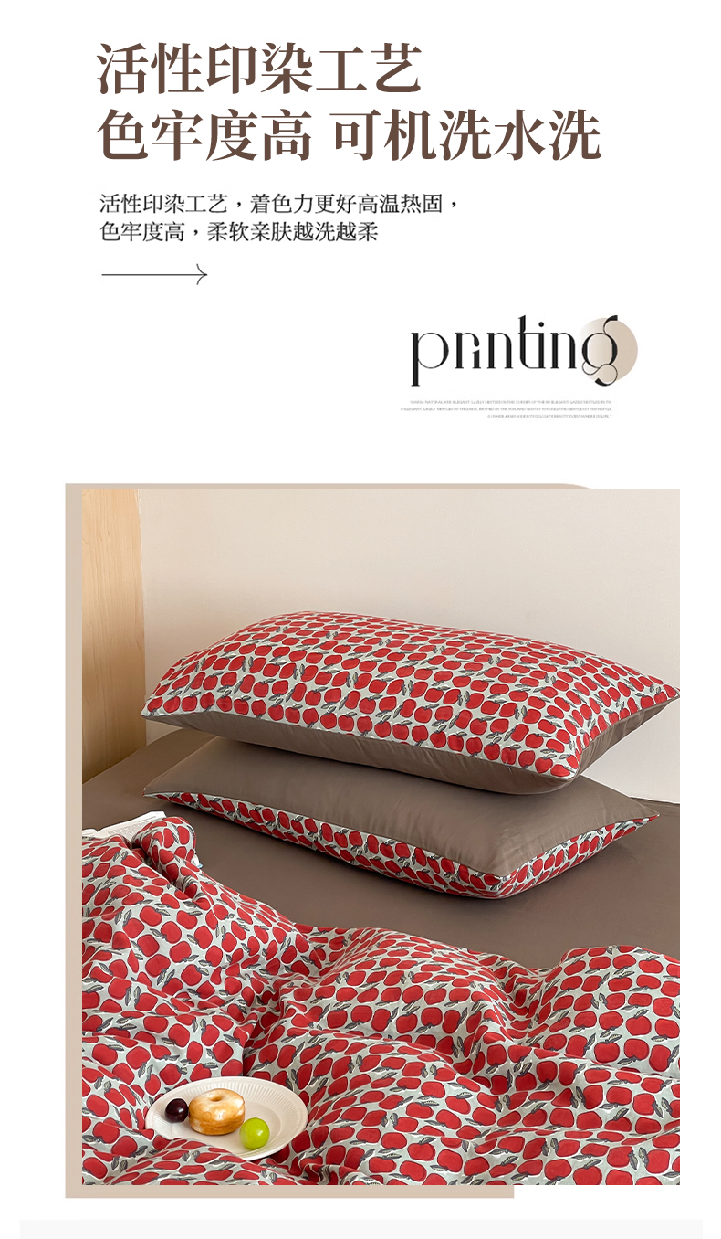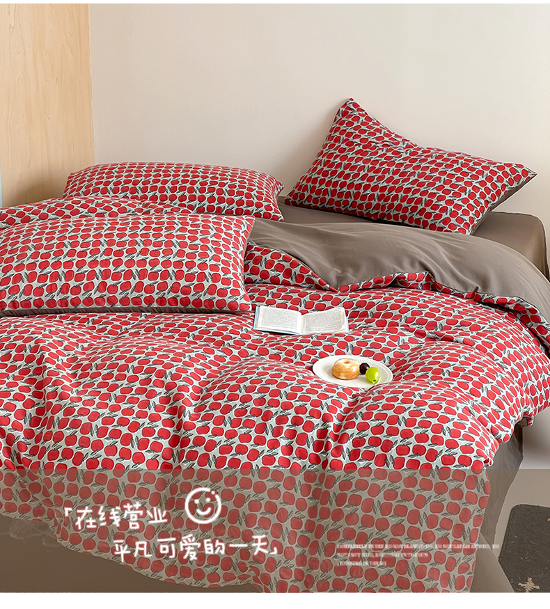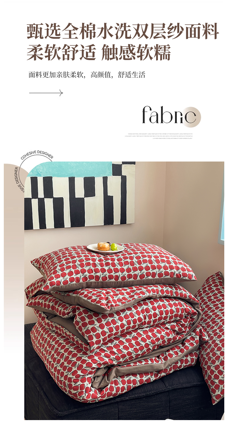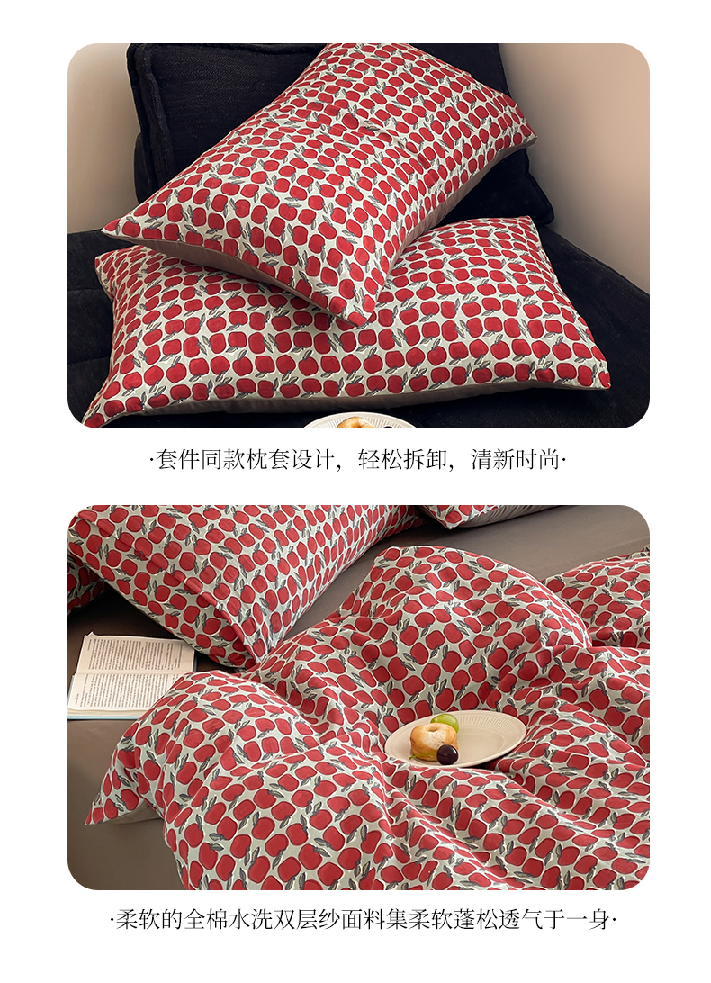 商品名称:萝莉家纺 2025新款全棉复古美式风水洗双层纱印花四件套 红苹果