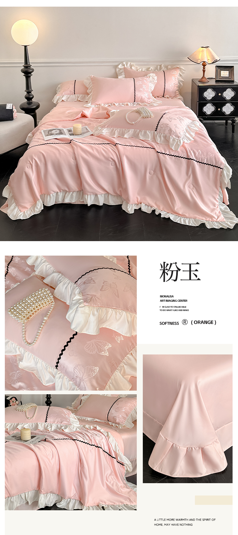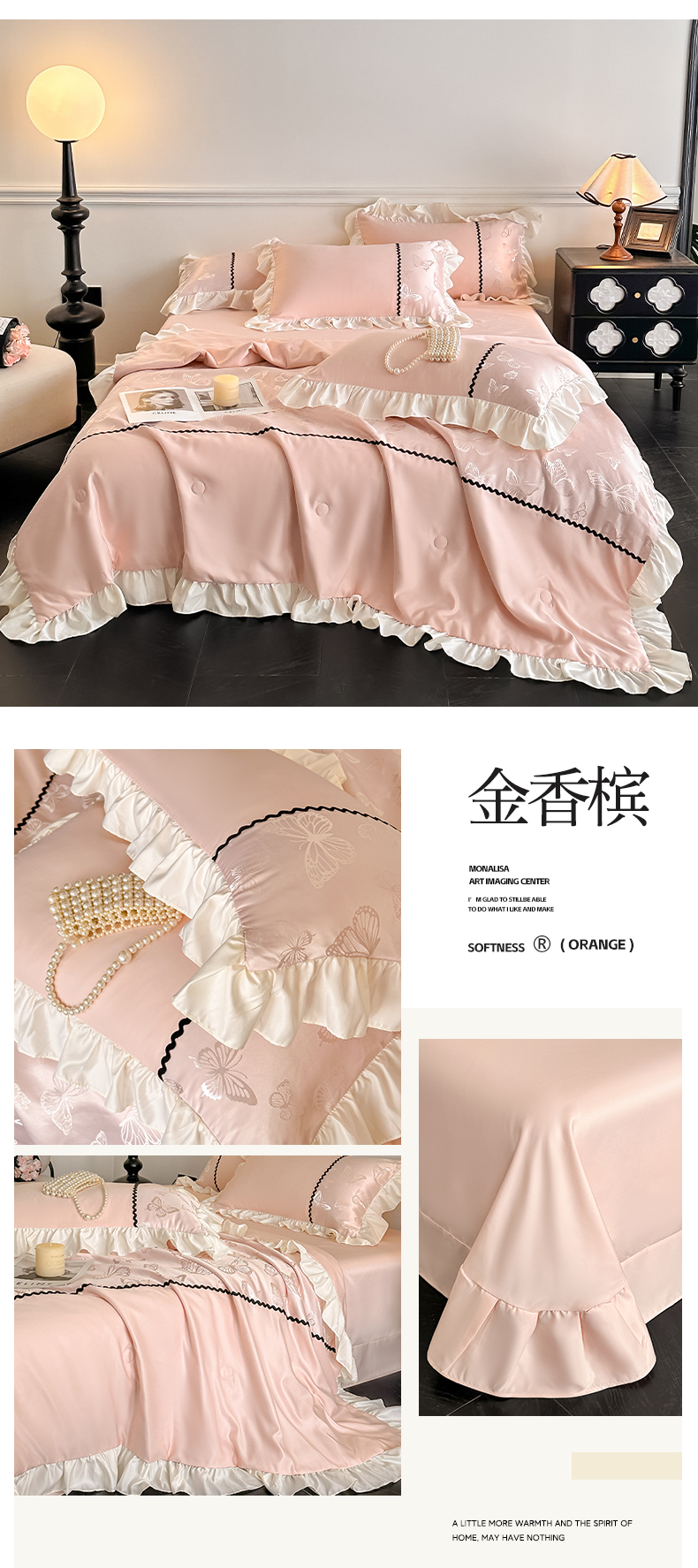 (总)米彩家纺 2025新款A类水洗真丝亮光浮雕洛丽塔夏被夏凉被空调被四件套,粉玉,金香槟,奶昔白,天兰
