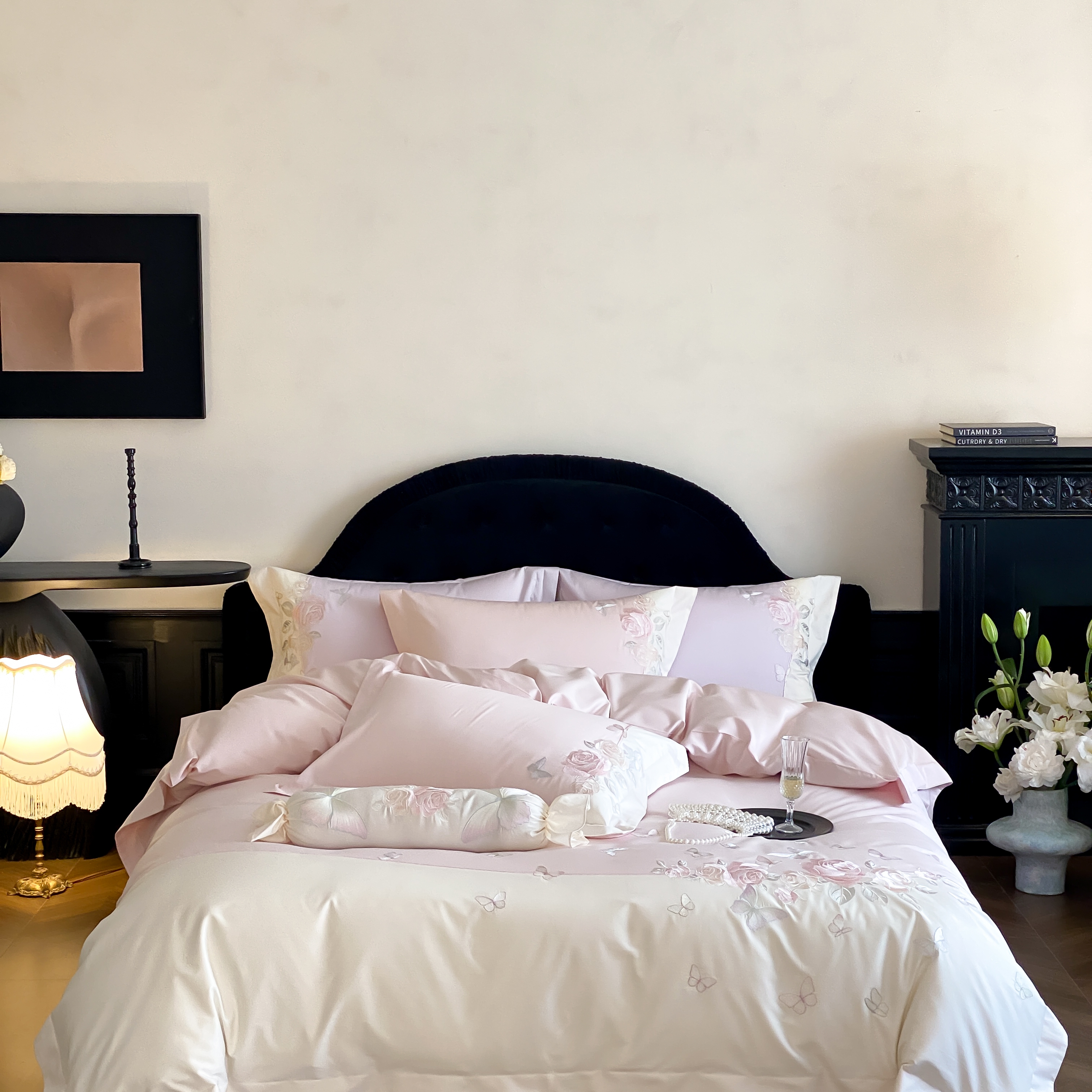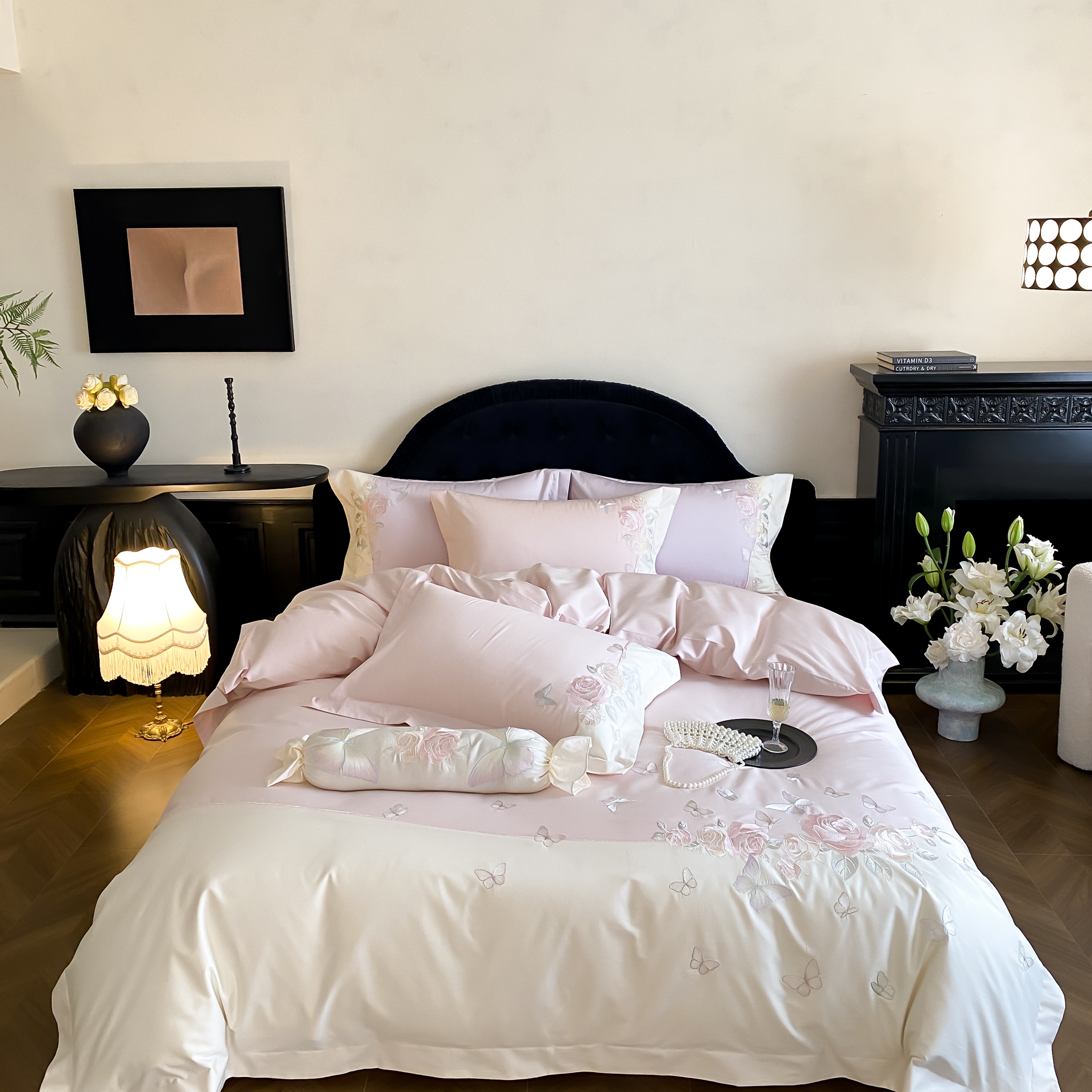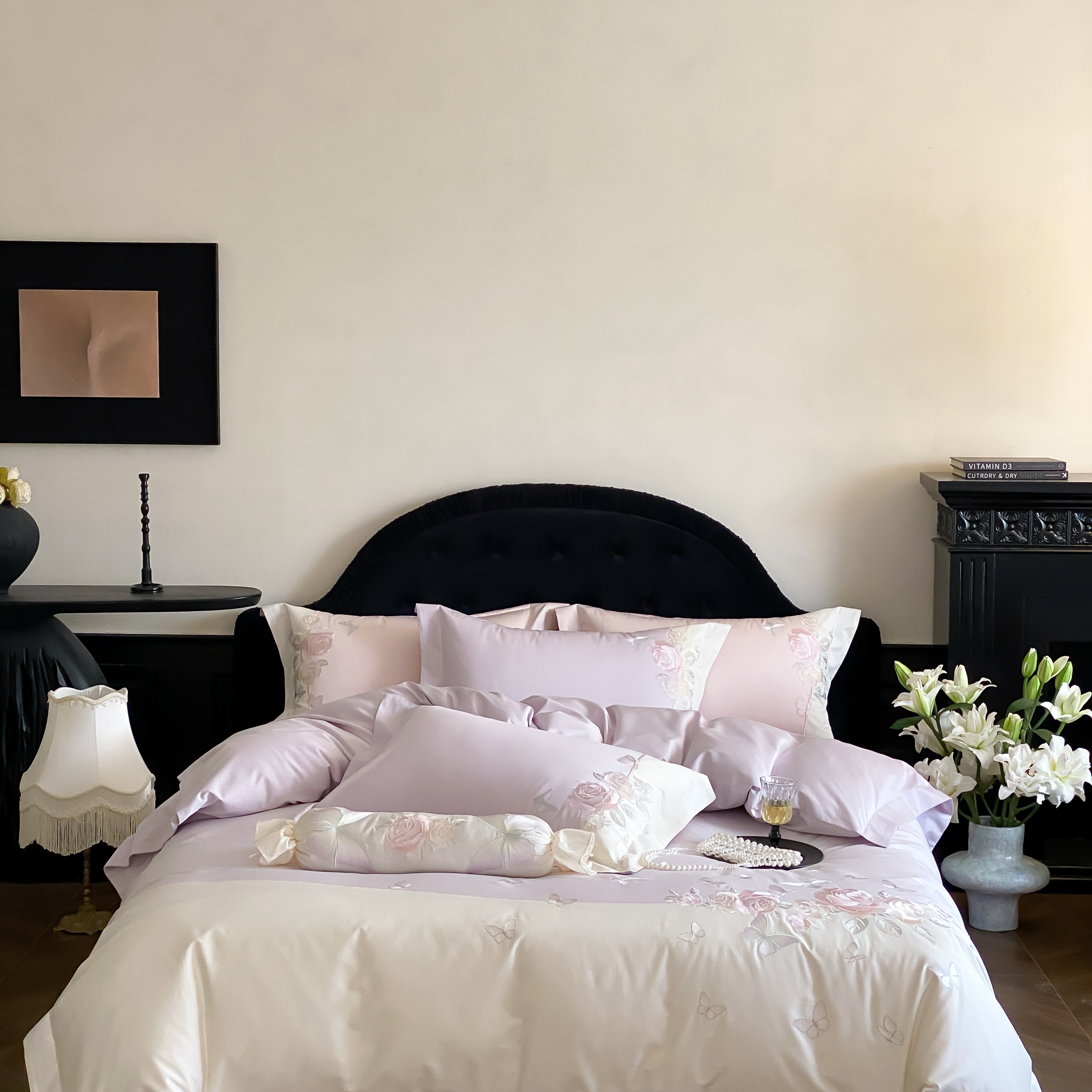 (总)佳汐蓝 2025春夏新品双层皱皱纱刺绣+织带+荷叶边四件套--白茶花,奶白,曲奇