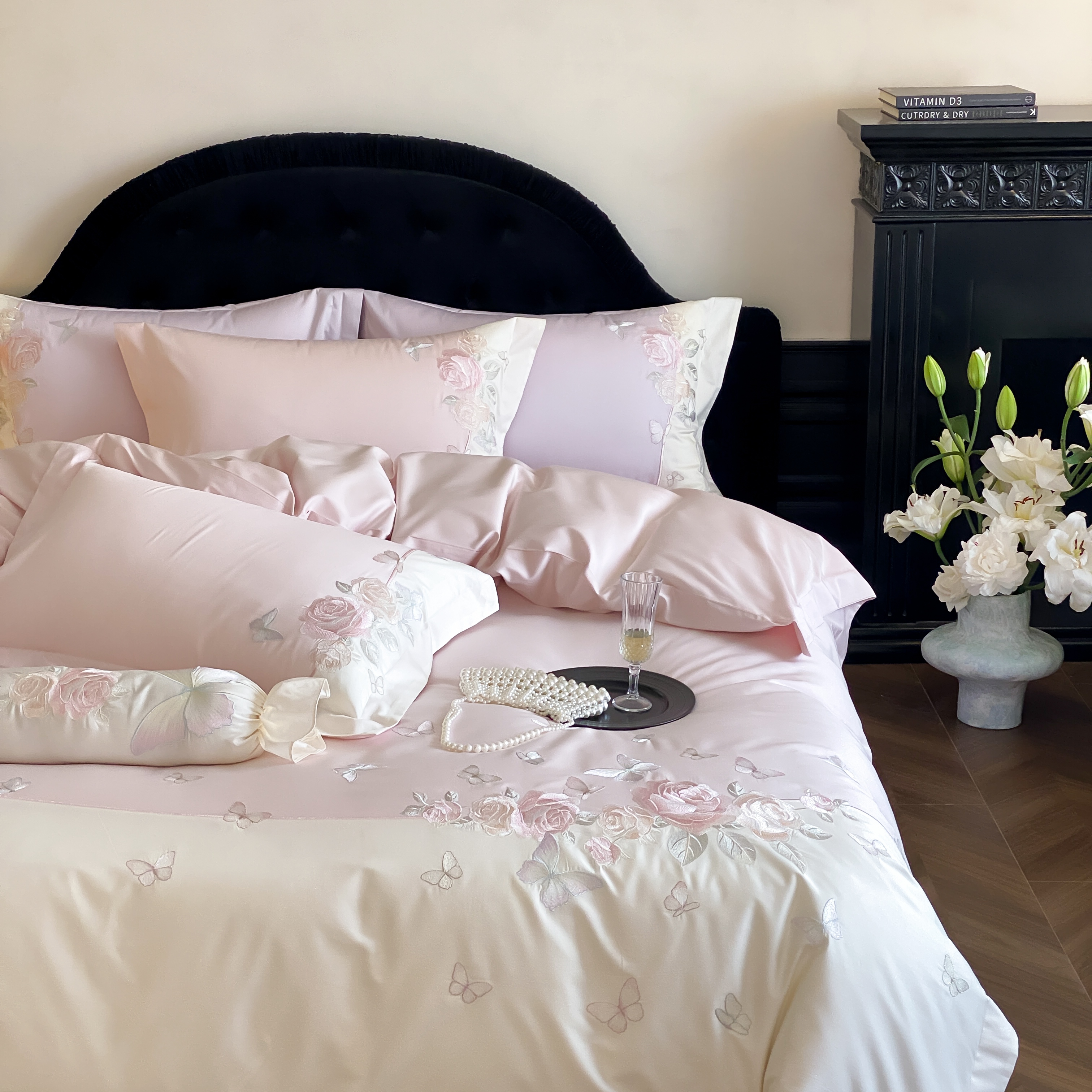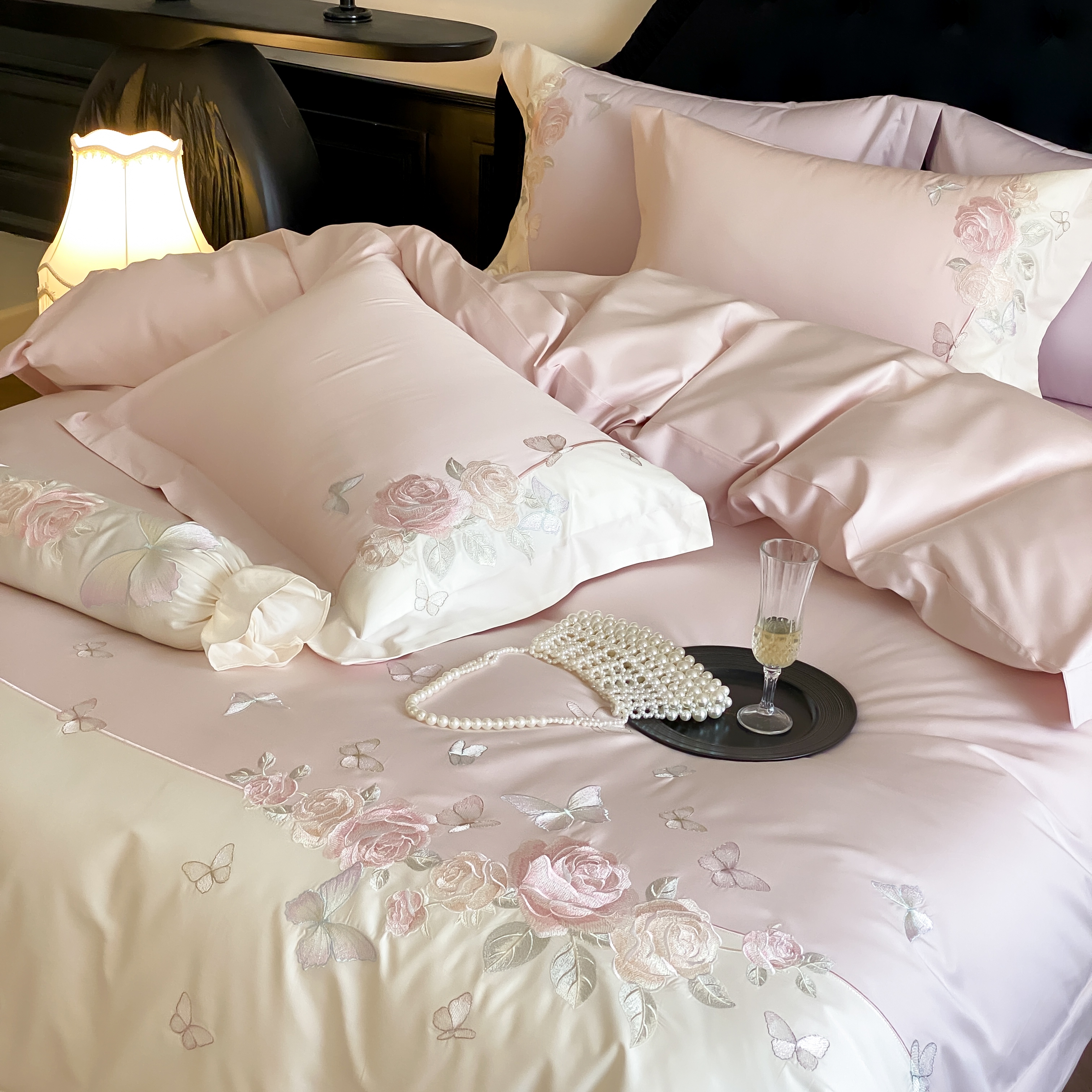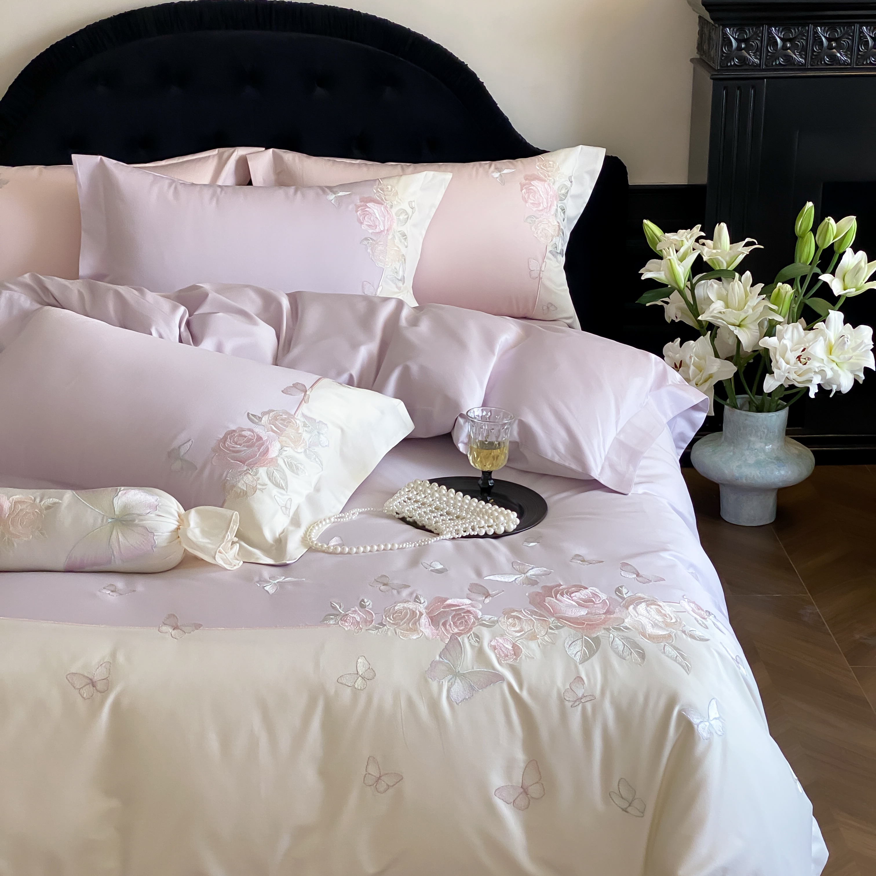 (总)佳汐蓝家纺 2025春夏新款天丝棉蝶舞繁花绣花天丝四件套,蝶舞繁花·粉,蝶舞繁花·蓝