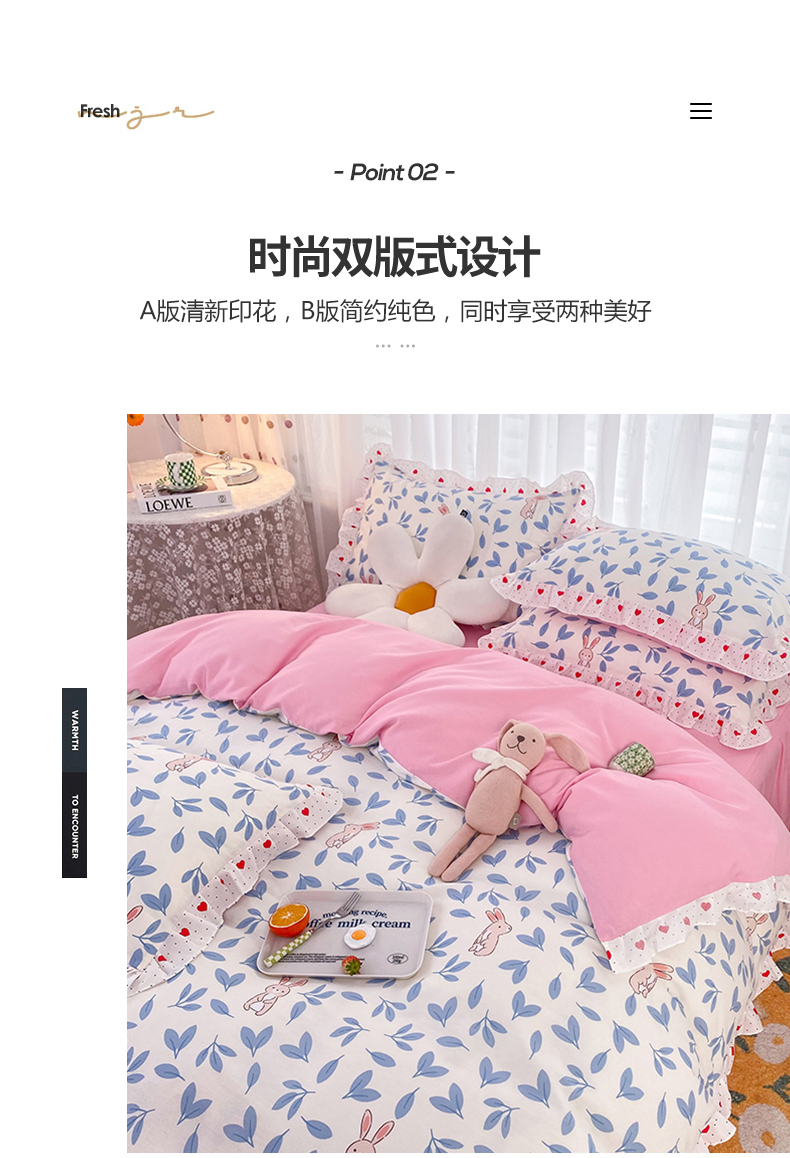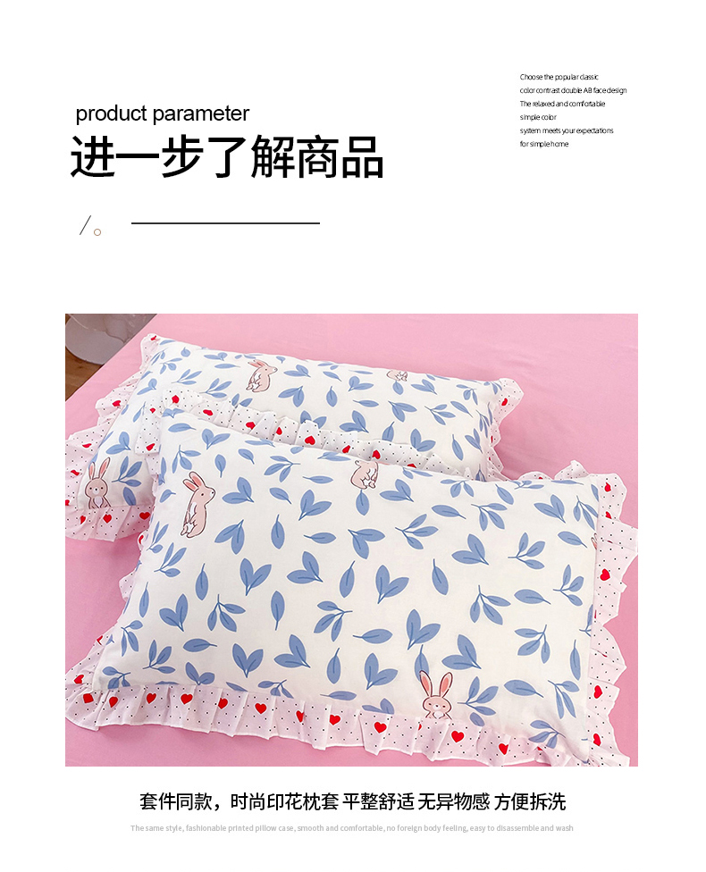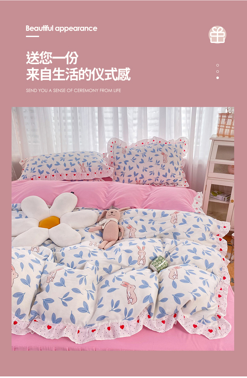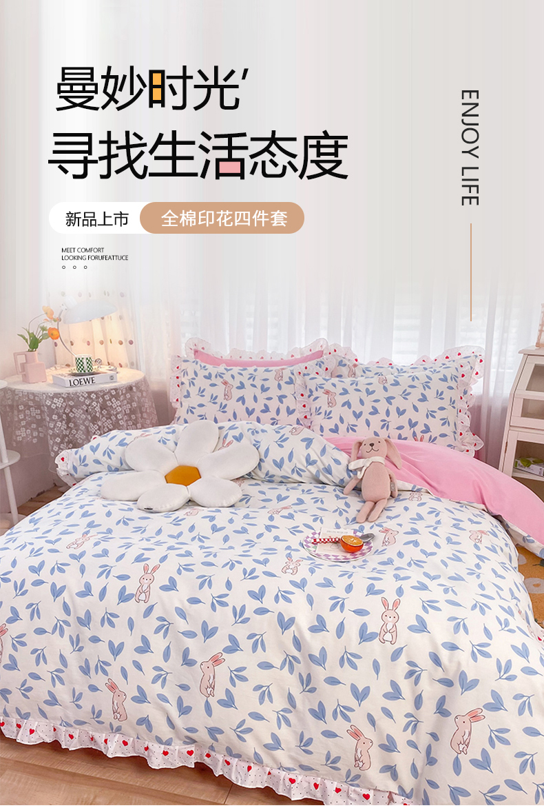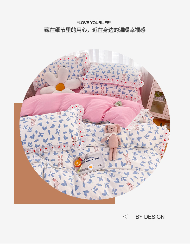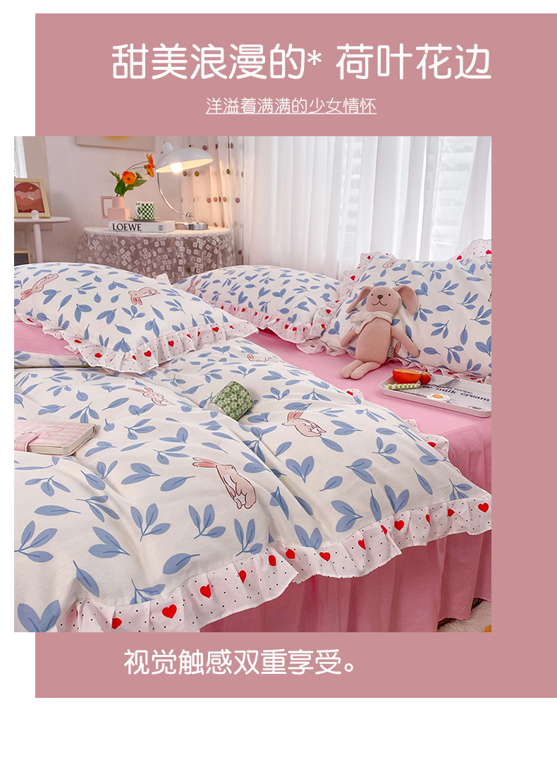 商品名称:玉元坊 2025春夏新款公主风全棉纯棉花边被套床单四件套 树叶兔