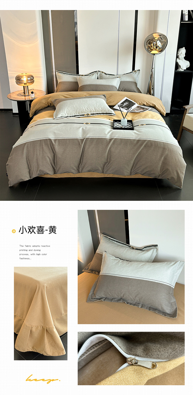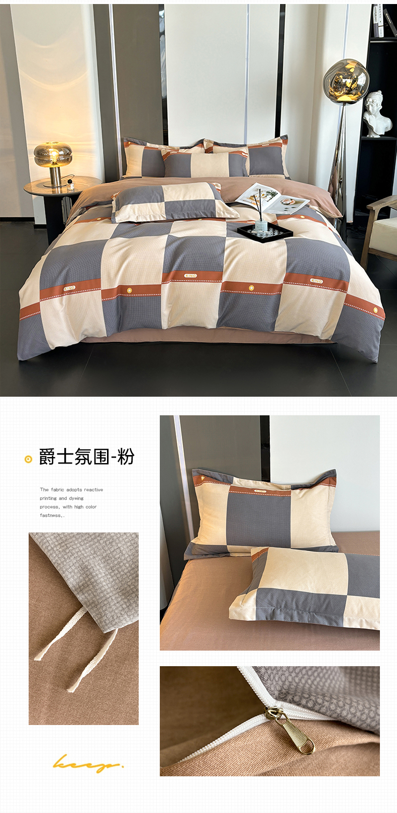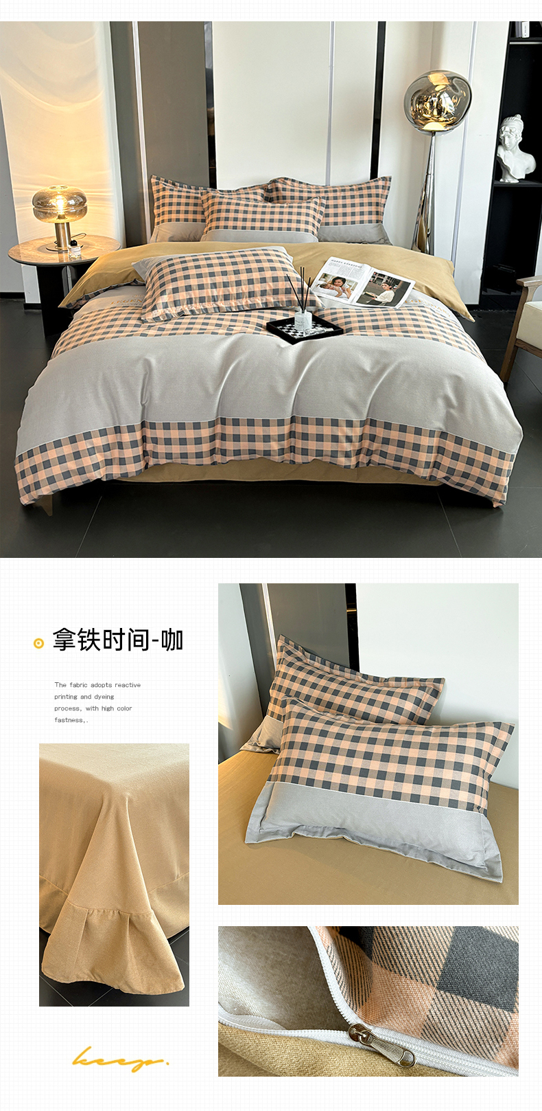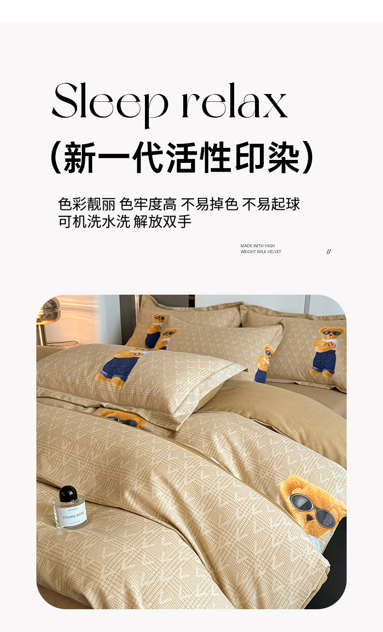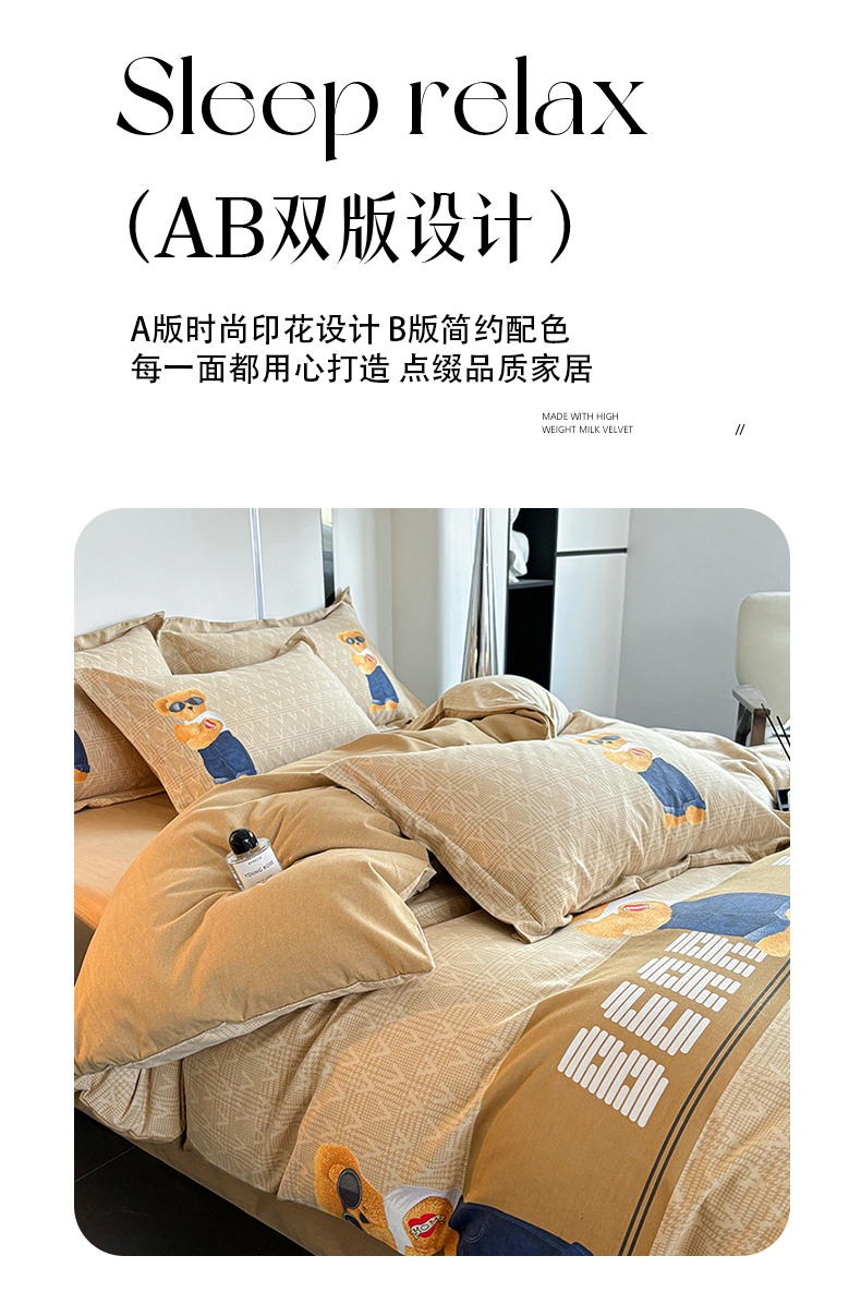 (总)慕木家纺 2025新款高克重简约无印风牛奶绒双拼四件套,宾利蓝+浅灰,米驼+奶茶咖,浅灰+米金,双拼套件-豆沙+灰