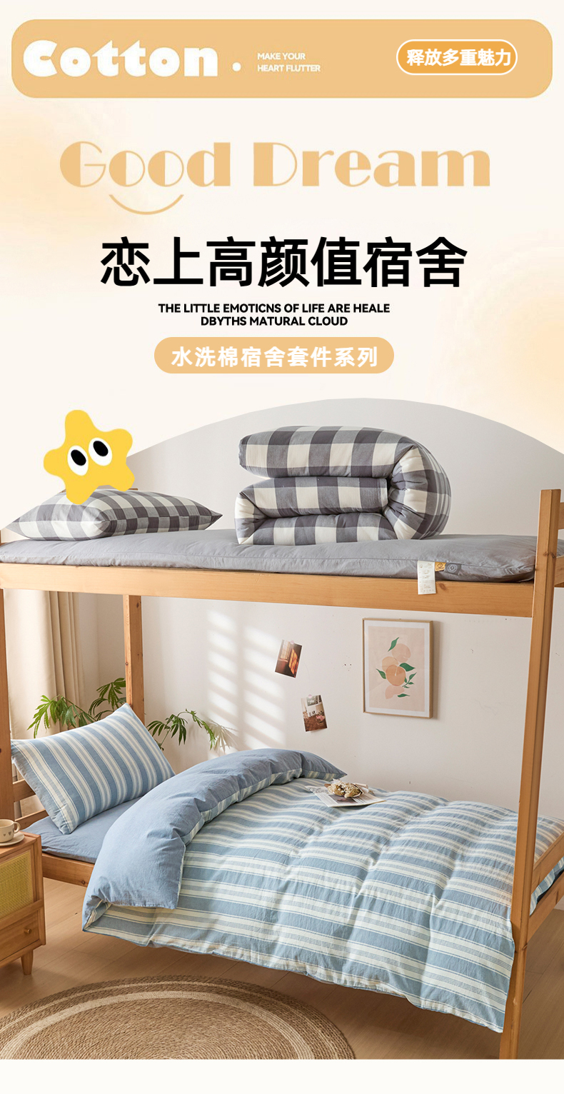 (总)爱屋及屋 2025新款水洗棉学生季大礼包学生宿舍六件套棉花被+棉花垫子+枕头+三件套一站式全套,海蓝大格,格韵蓝,光年灰,灰中格,简析粉,简析蓝,蓝咖大格,蓝小格,蓝中格,清新格,韵绿格,左岸蓝